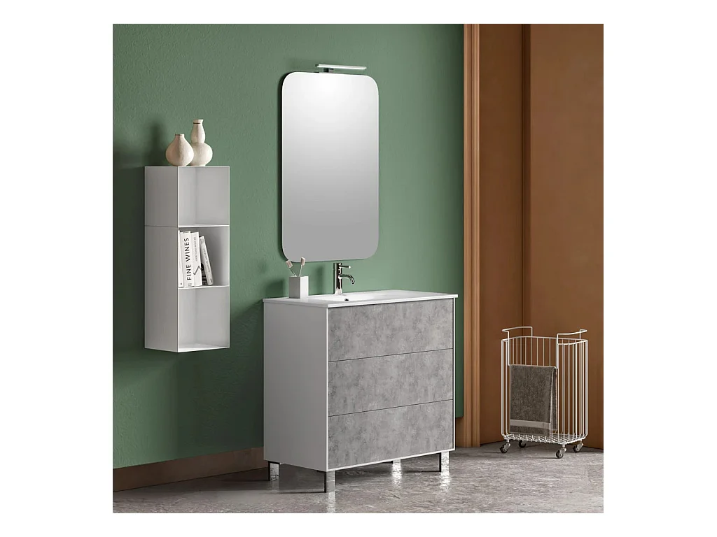 Ensemble meuble de salle de bain 3 tiroirs laqué blanc et effet béton et miroir lumineux Lago L 80cm