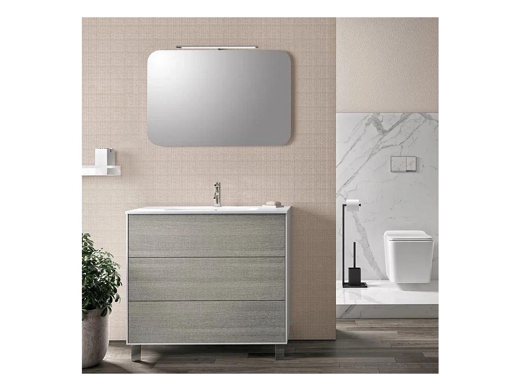 Ensemble meuble de salle de bain 3 tiroirs laqué blanc et gris et miroir lumineux Lago L 90cm