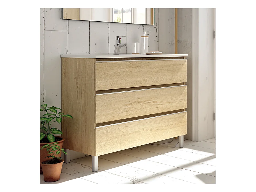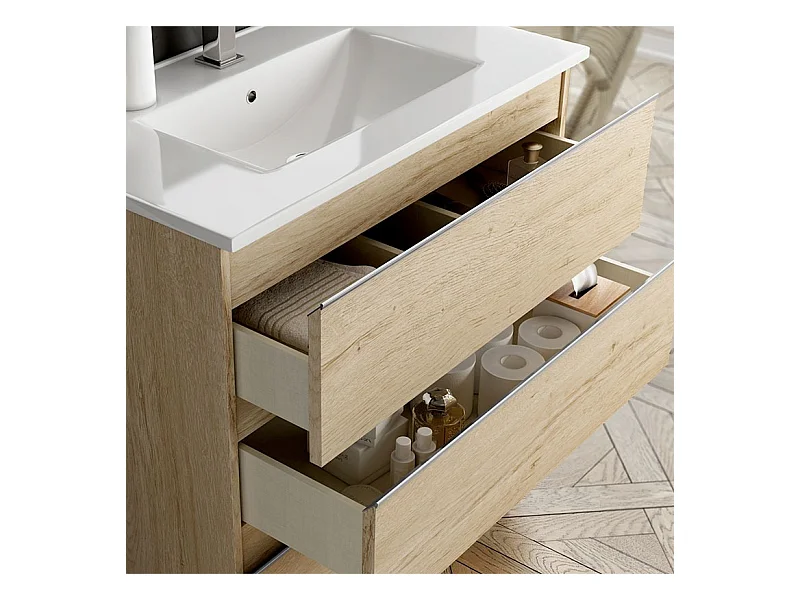 Ensemble meuble de salle de bain 70cm simple vasque + colonne de rangement PALMA - bambou (chêne clair)