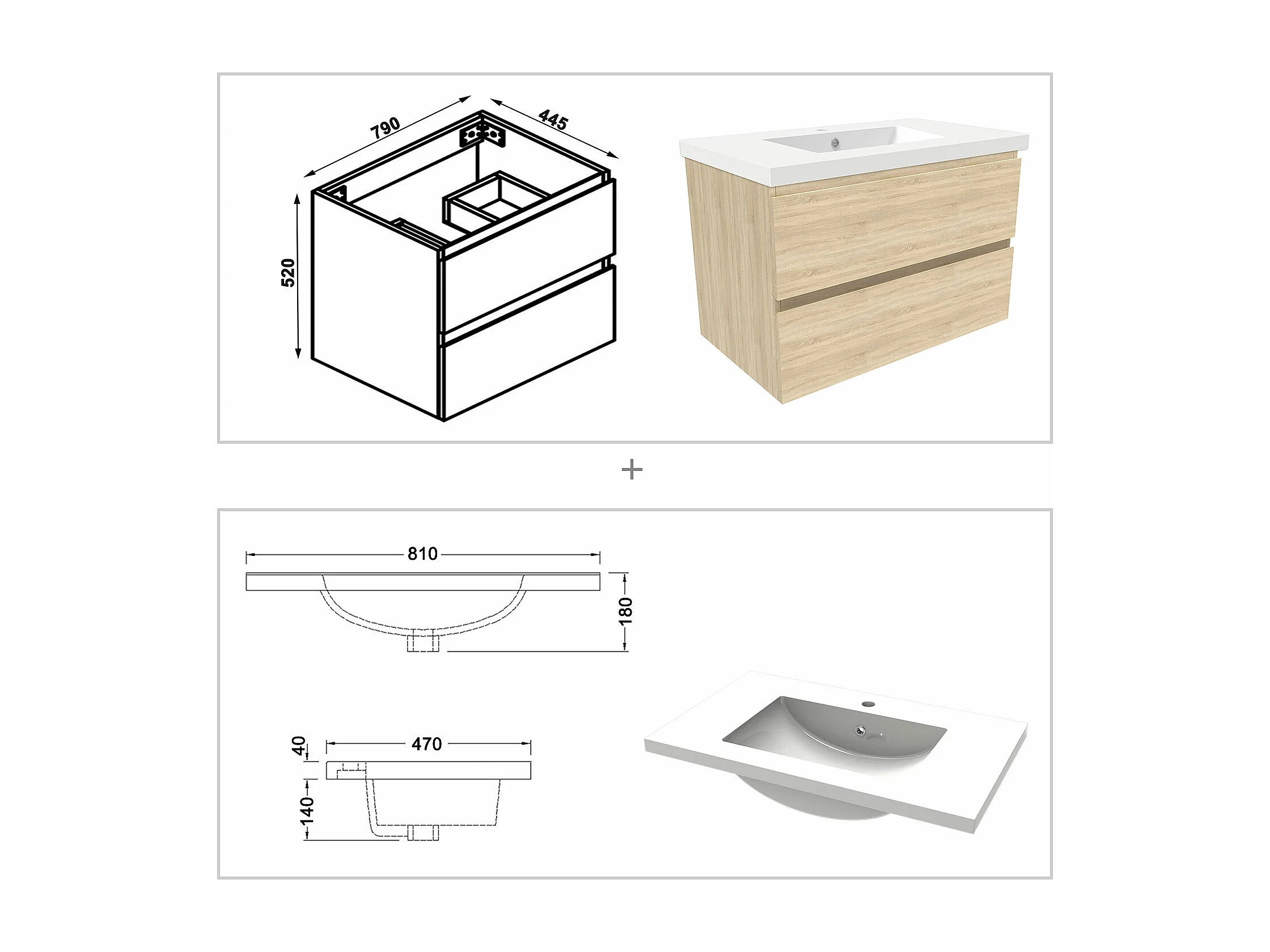 Ensemble meuble de salle de bain 80cm, vasque + colonne + LED miroir,chêne