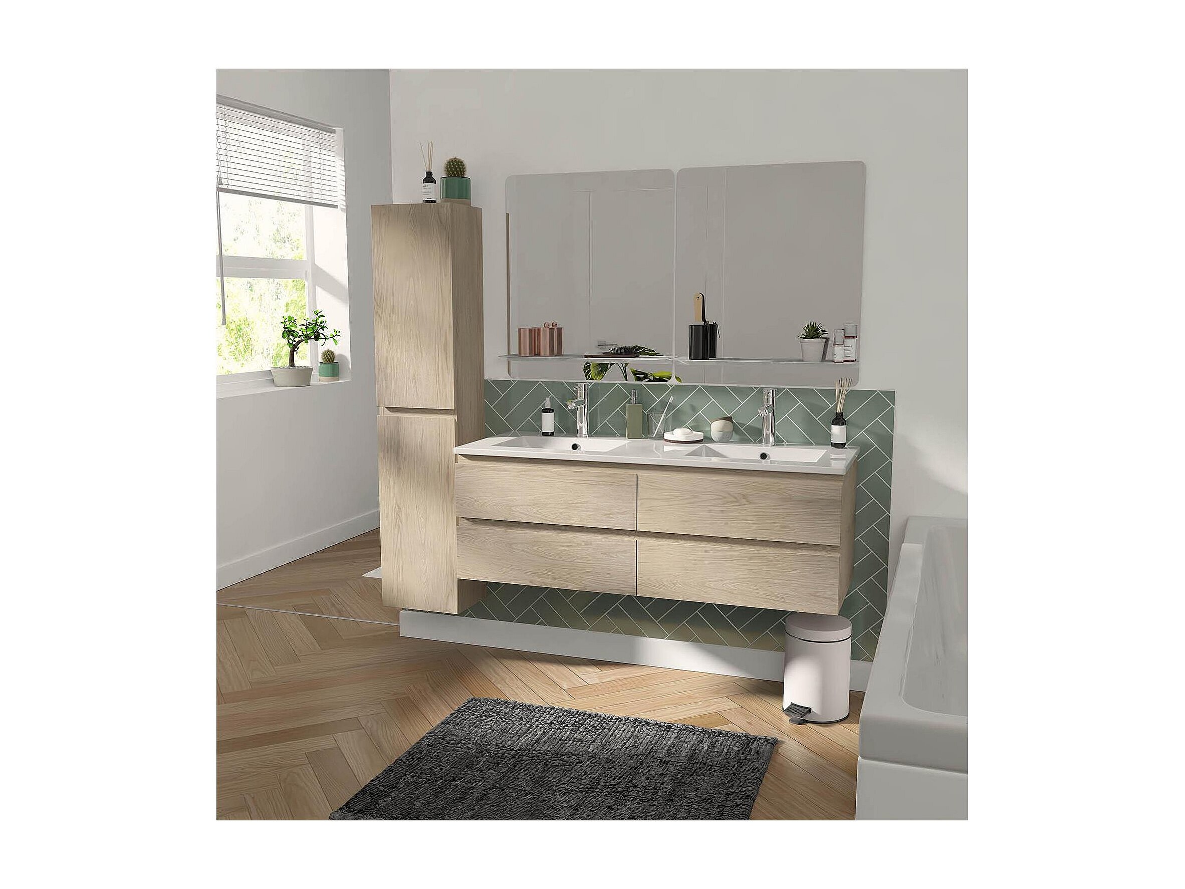 Ensemble meuble double vasque décor chêne 120cm + vasque + 2 miroirs + colonne