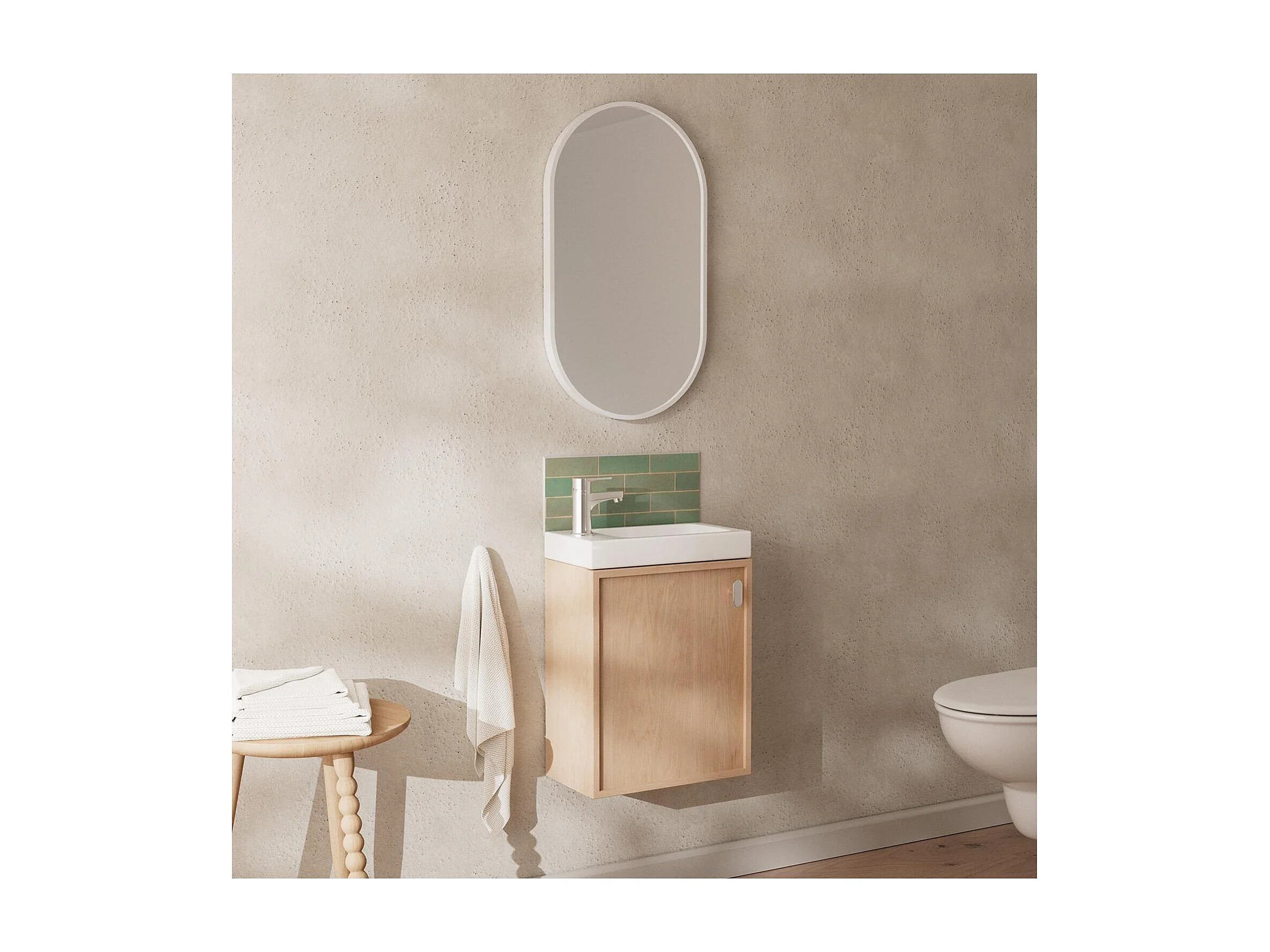 Ensemble meuble lave-mains décor chêne FRAME + robinet + miroir