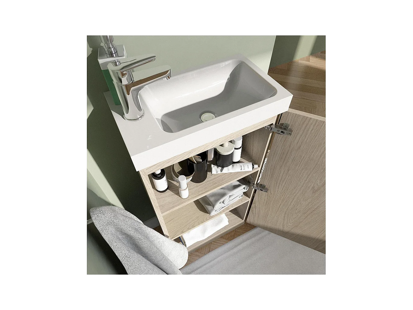 Ensemble lave-mains sur pieds décor chêne avec robinet chromé