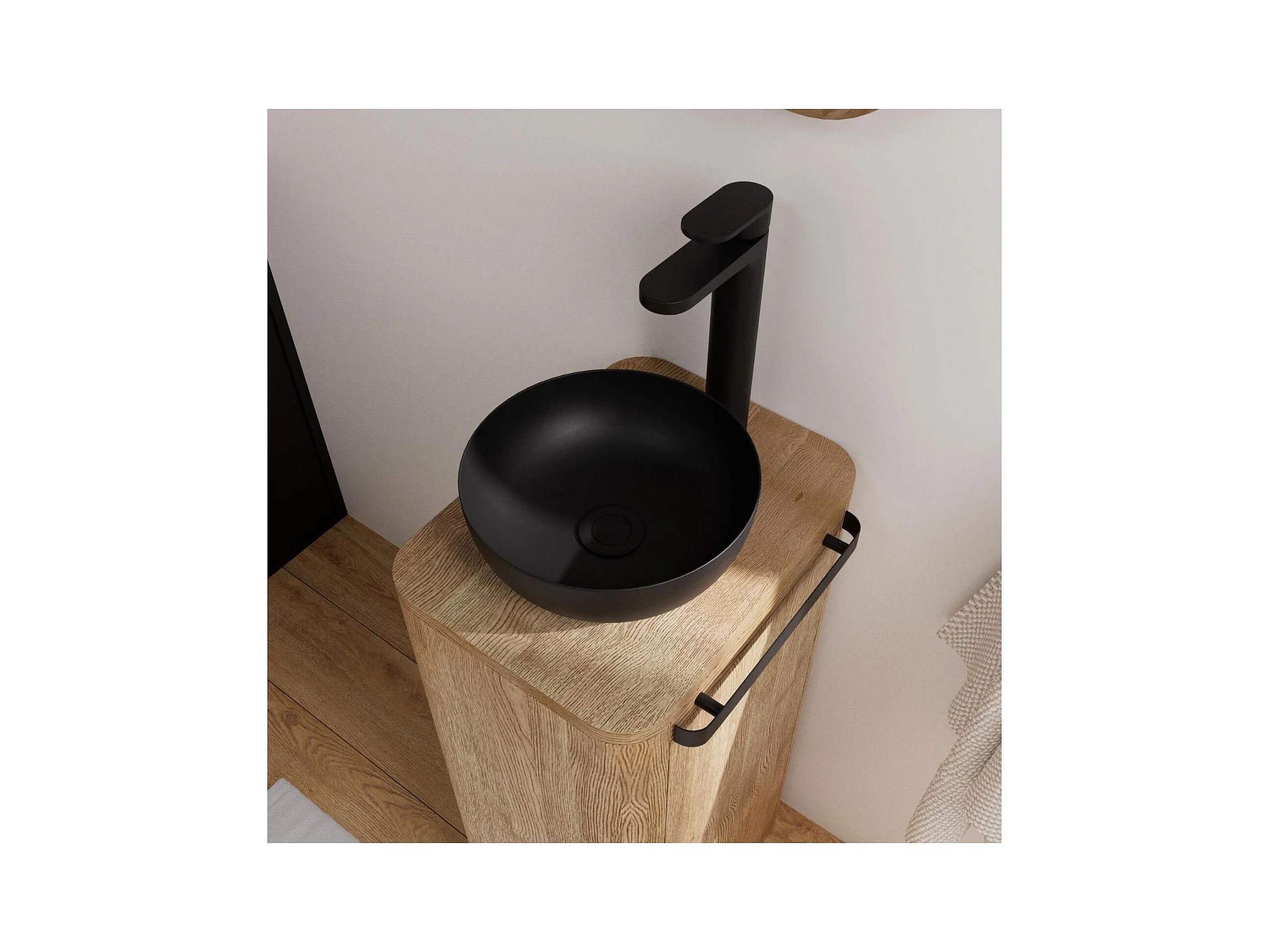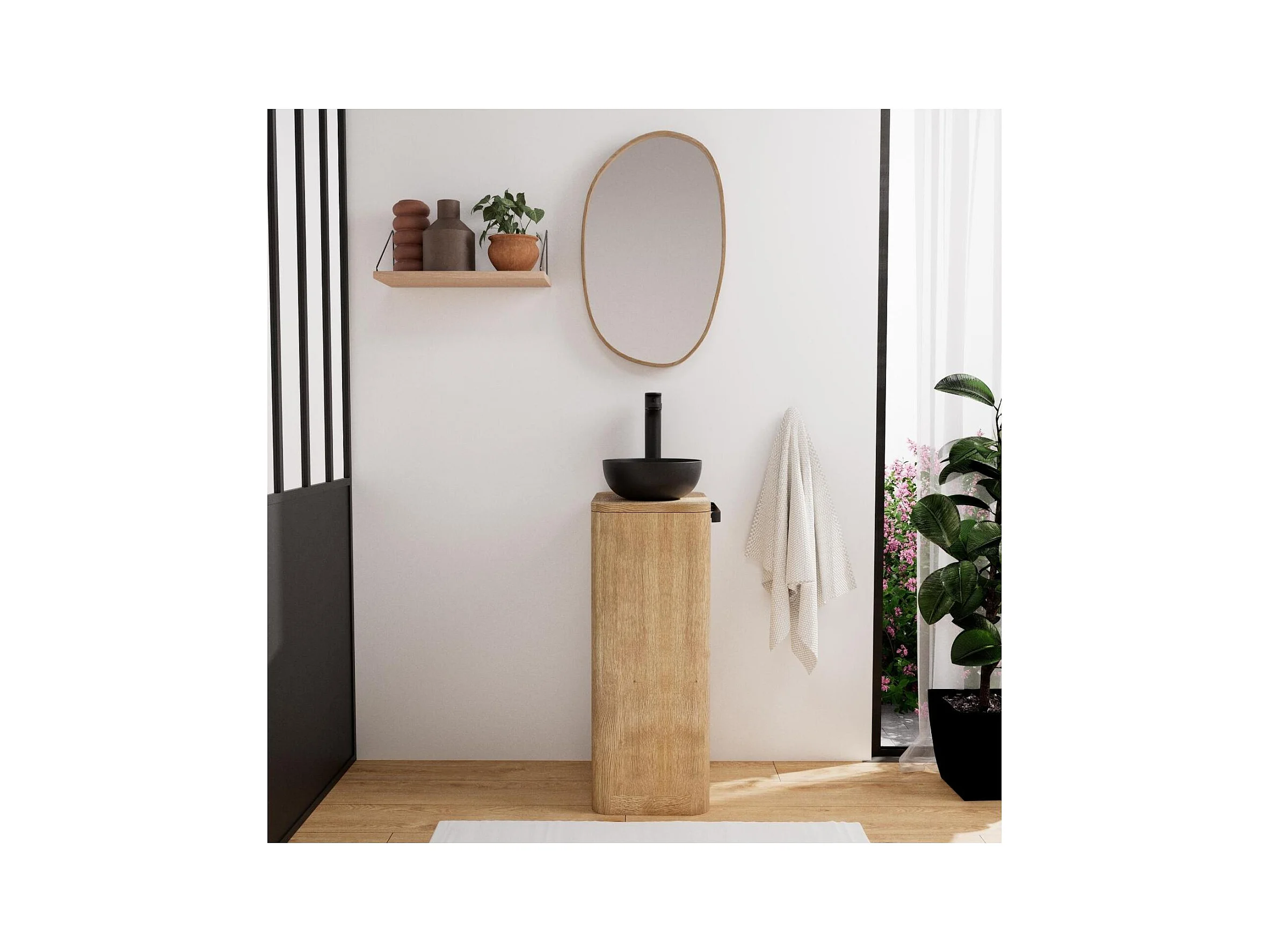 Ensemble lave-mains totem en chêne massif avec vasque et miroir galet