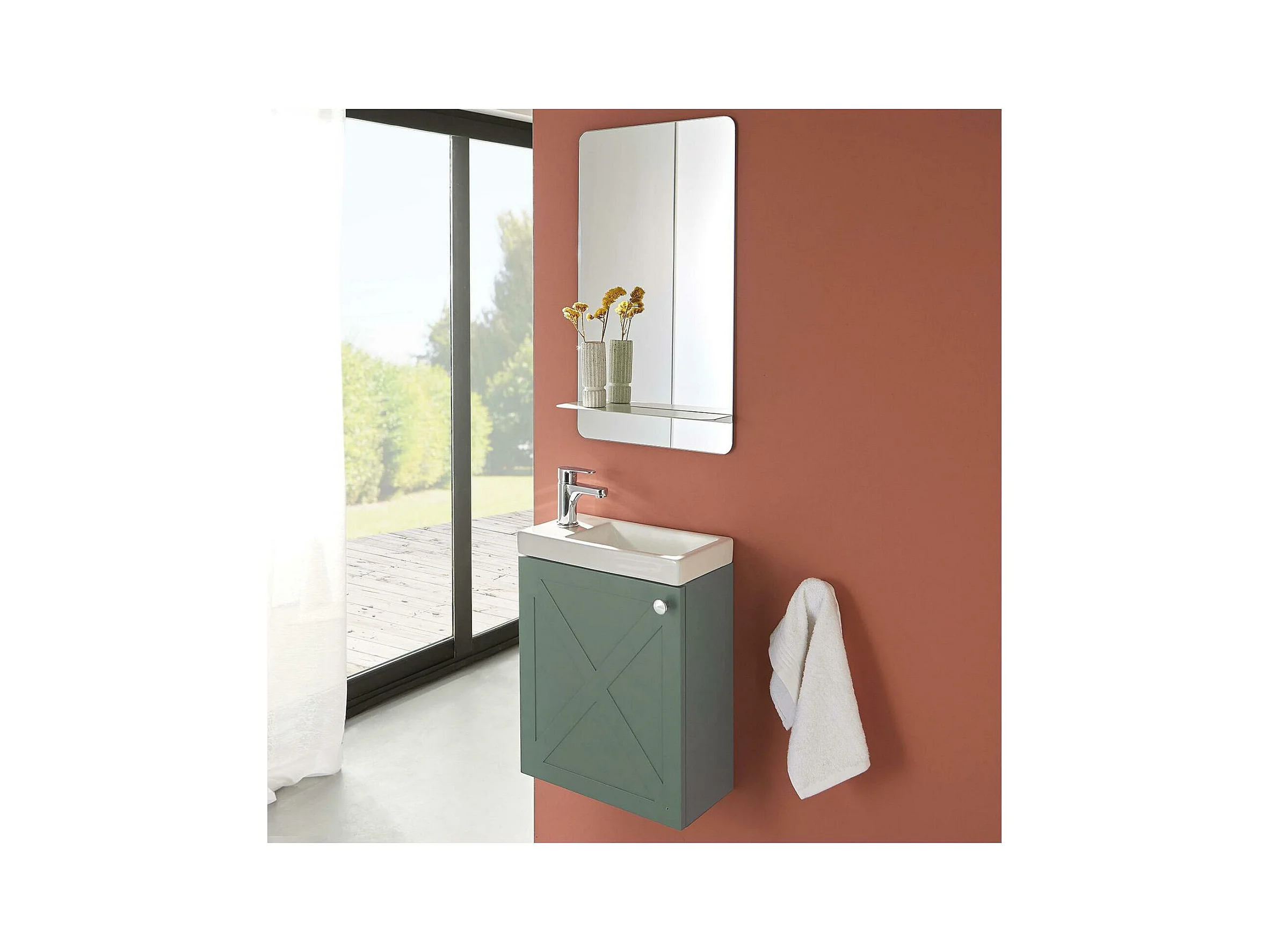 Ensemble meuble lave-mains vert de gris AVA + miroir + robinet chromé