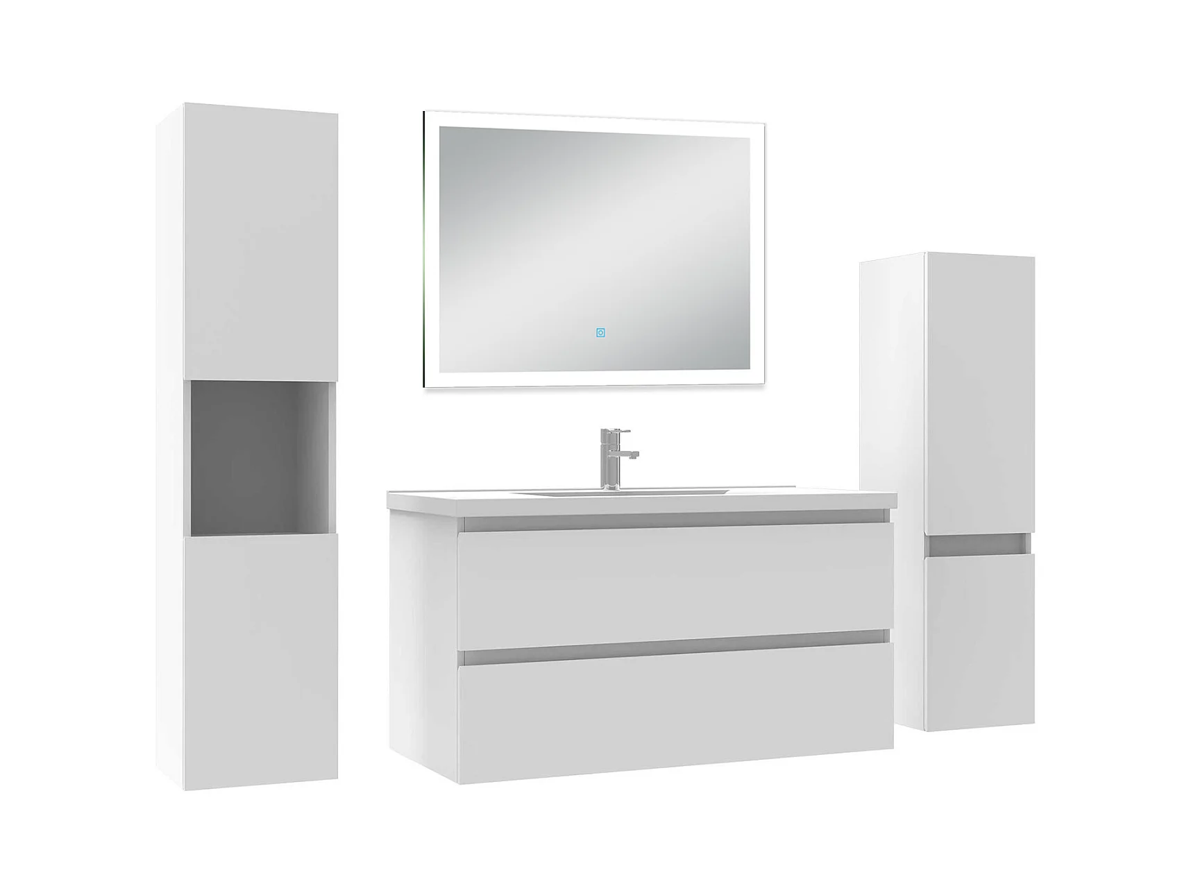 Ensemble meuble Salle de Bain 100cm simple vasque avec colonne et miroir lumineux dimmable blanc