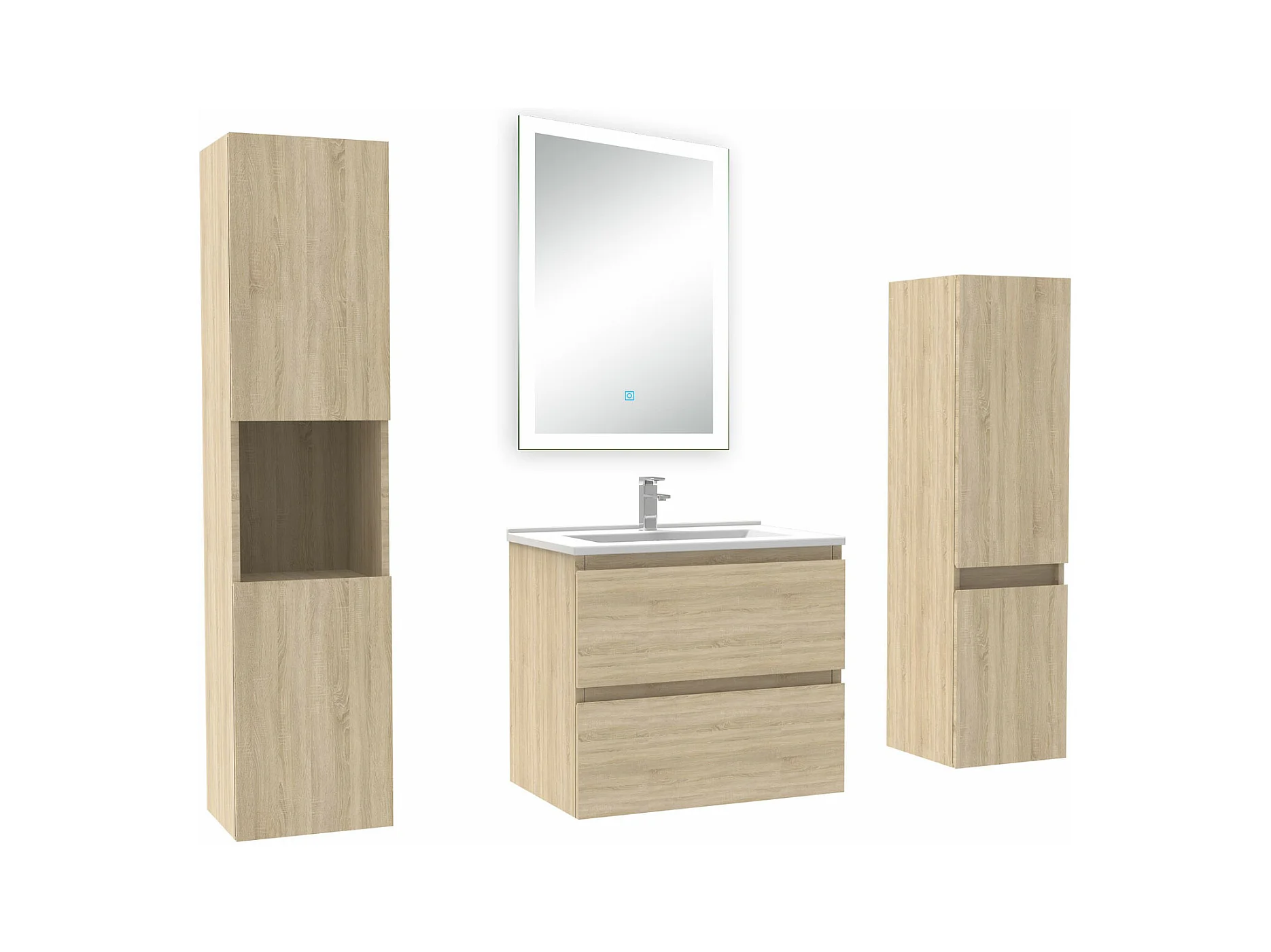 Ensemble meuble Salle de Bain 60cm simple vasque avec colonne et miroir lumineux dimmable chêne wotan