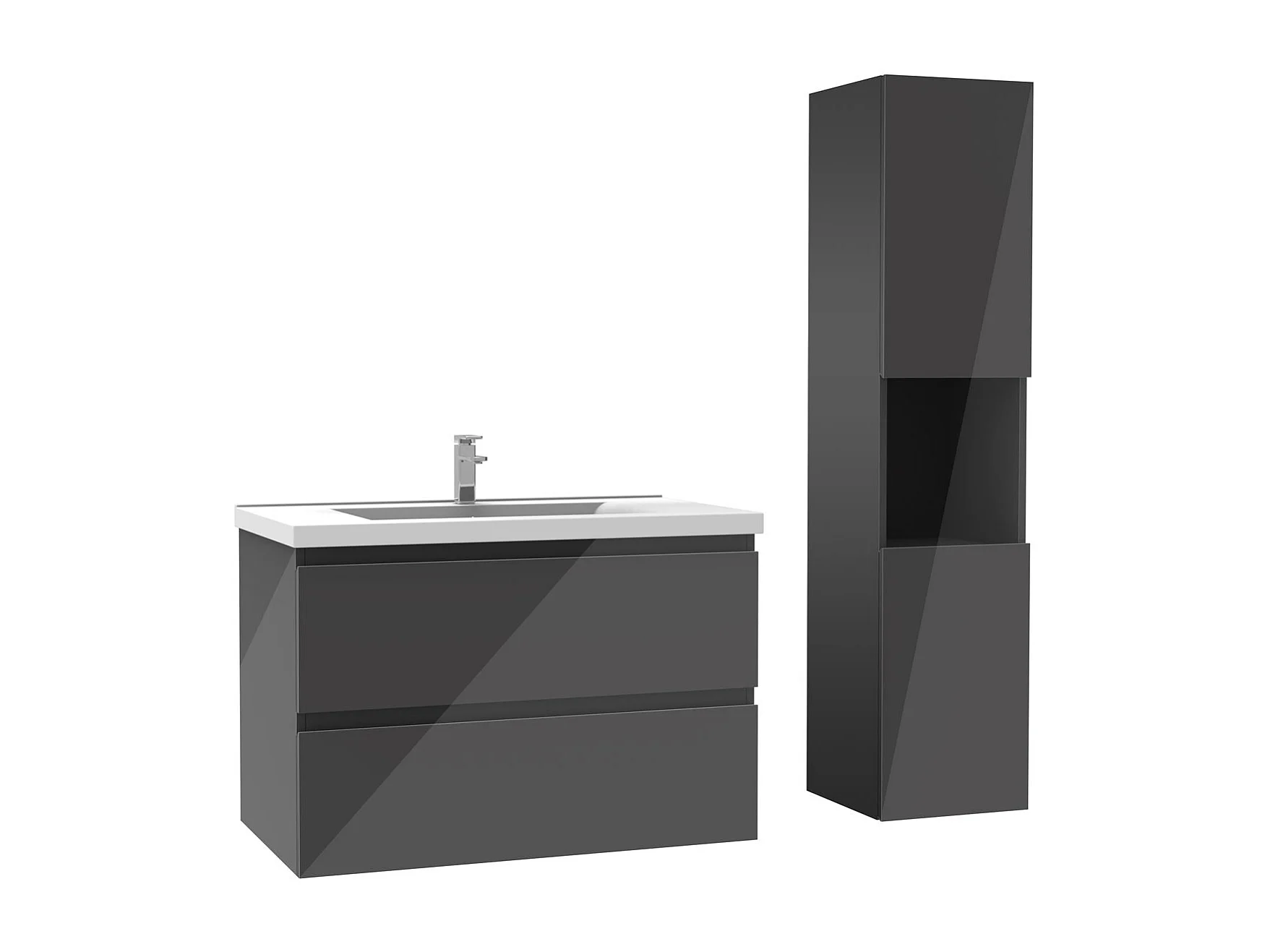 Ensemble meuble salle de bain 80 cm anthracite brillant avec 2 tiroirs à fermeture automatique, lavabo céramique simple + colonne haute, suspendu