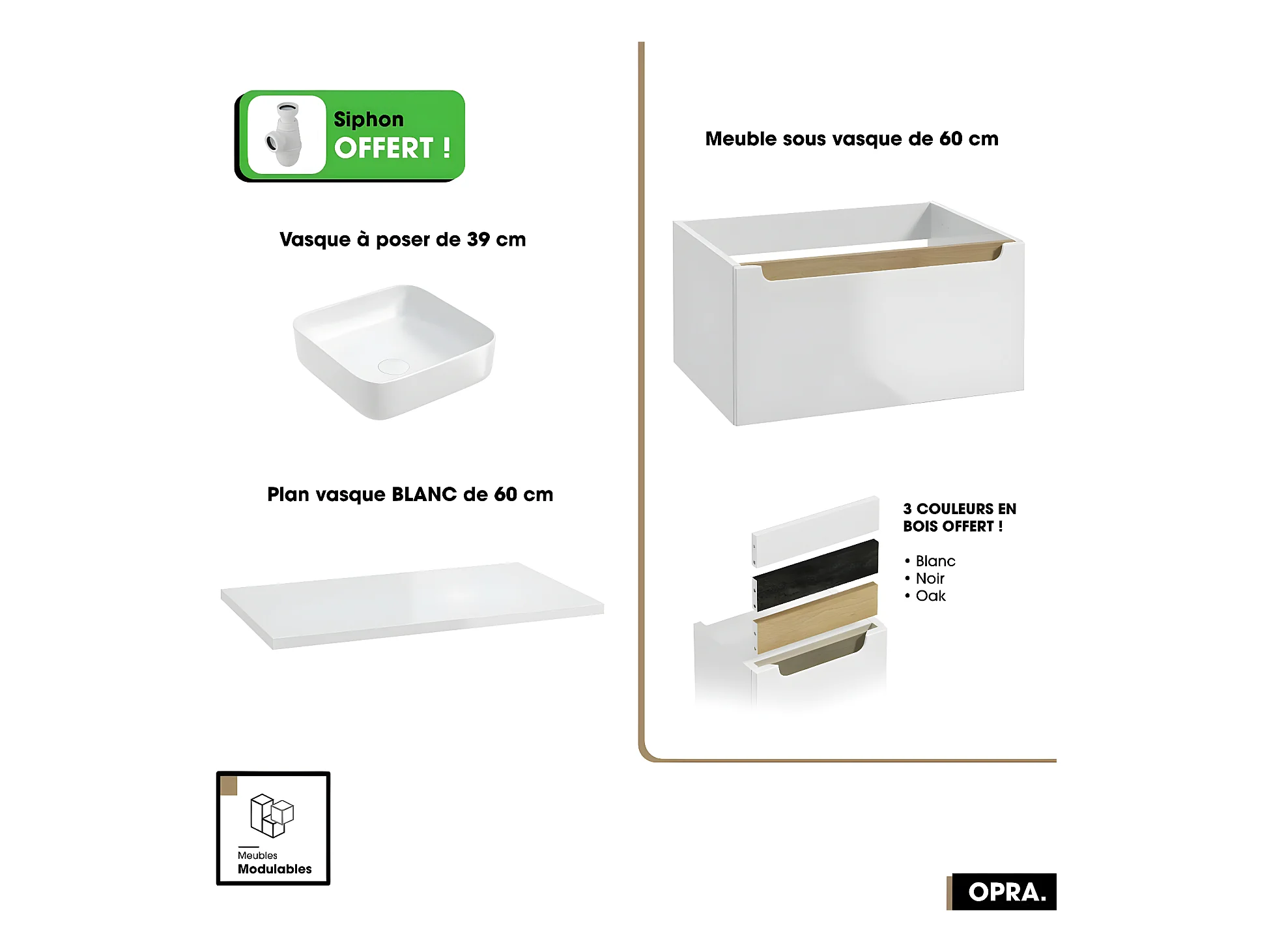 Ensemble meuble sous vasque avec plan et vasque à poser - Siphon OFFERT | OPRA | Blanc | 60 × 30 × 45 cm