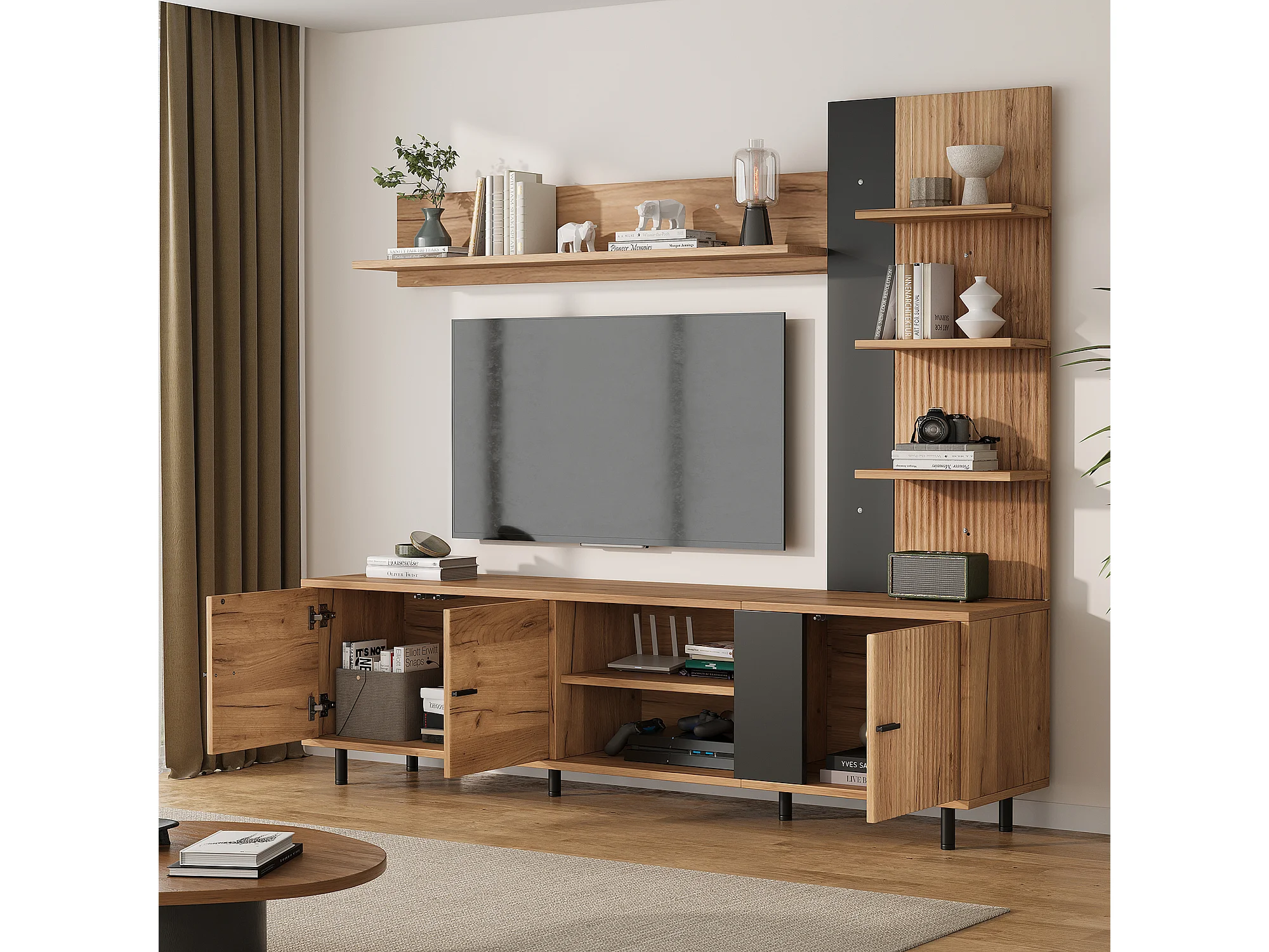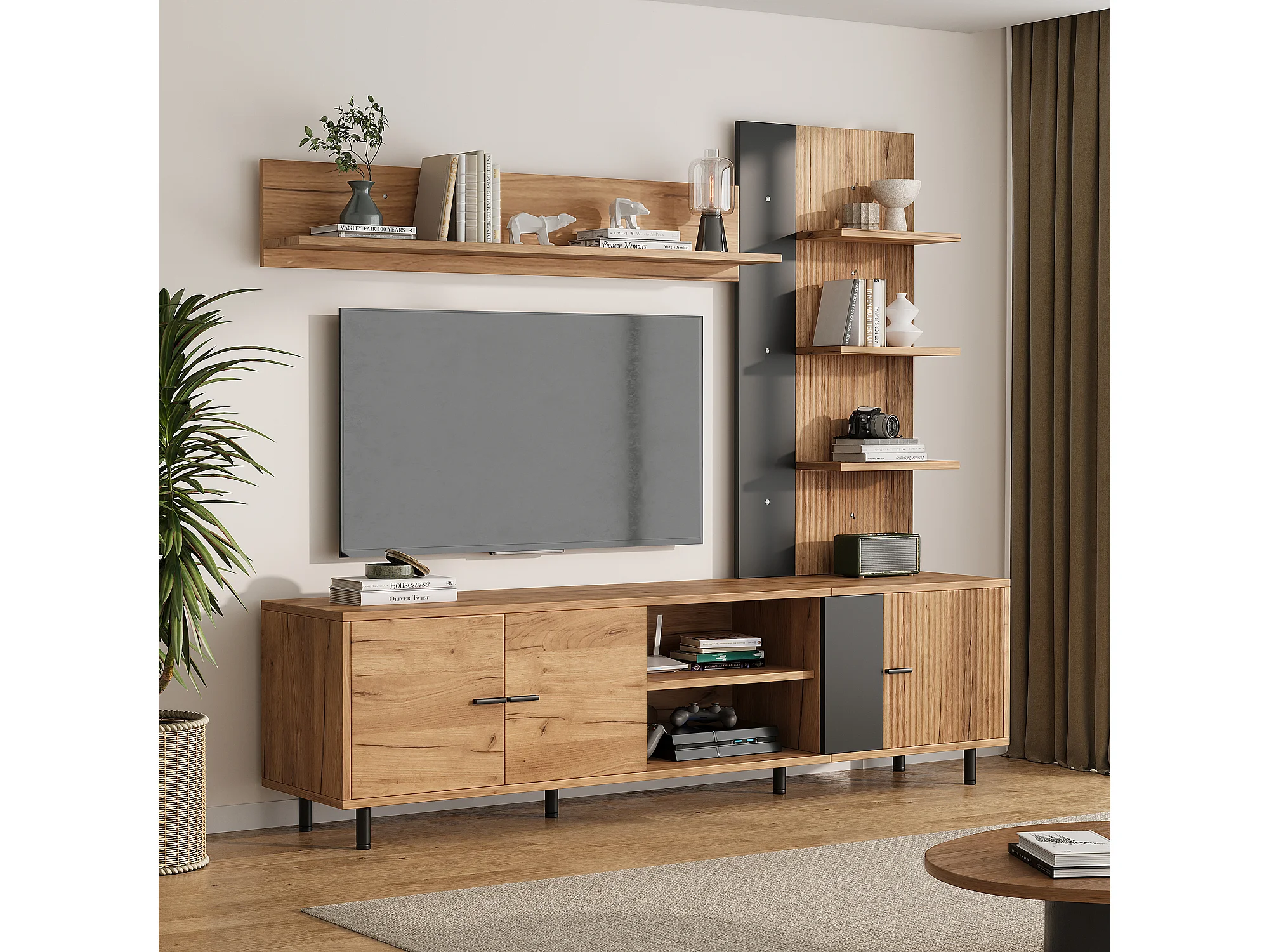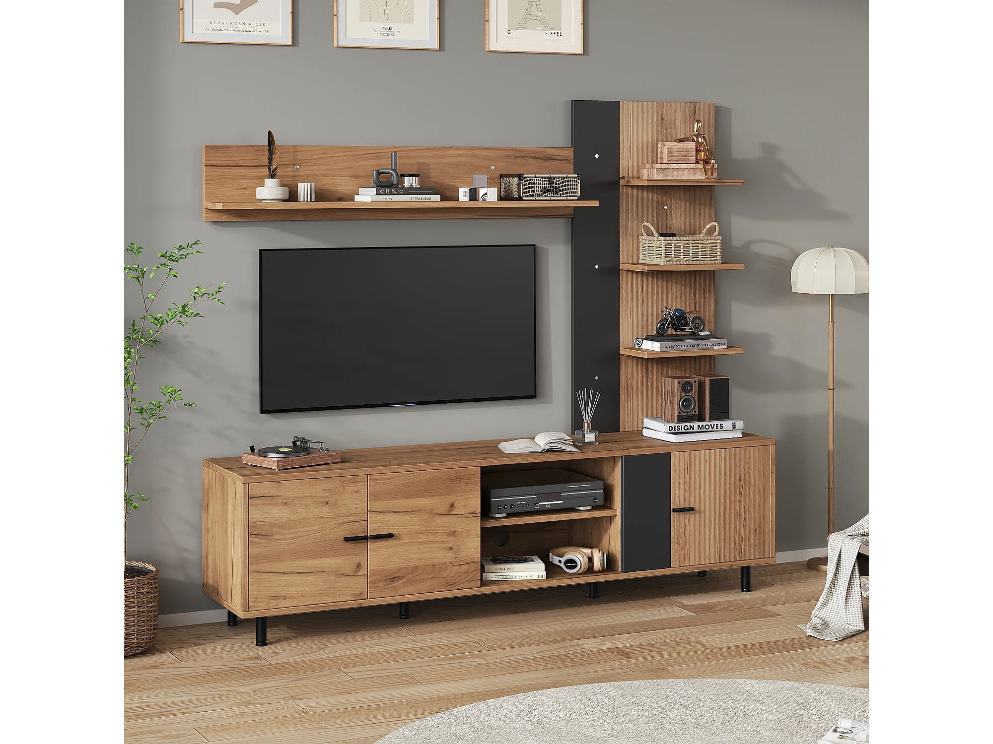 Ensemble meuble TV 187,5x40x167cm - Meuble TV + étagère d'exposition + étagères ouvertes - 3 portes - Panneaux de particules - Naturel et noir