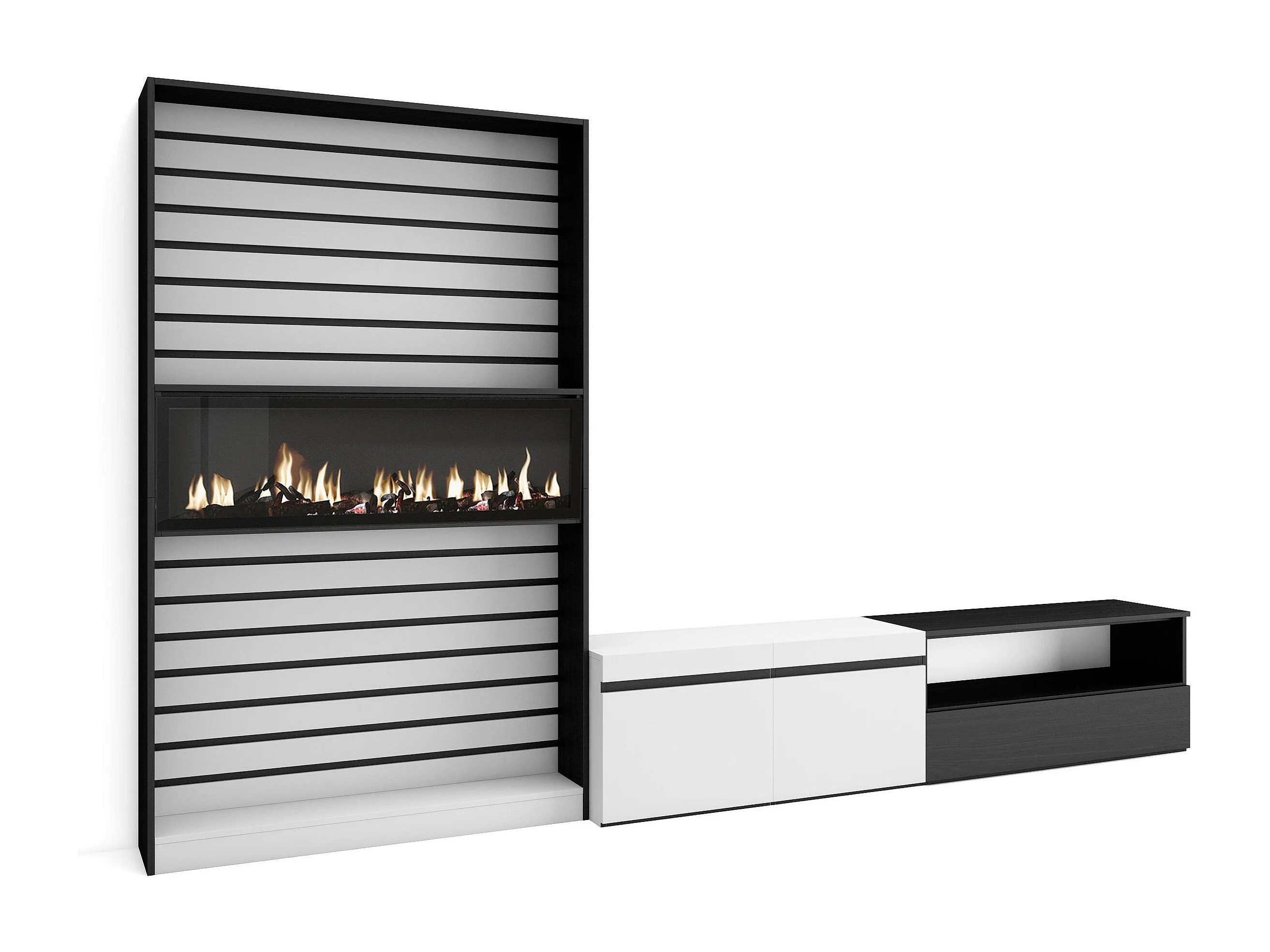 Ensemble Meuble TV, 310x35x186cm, Pour les TV jusqu'à 80", Cheminée électrique, Blanc et noir