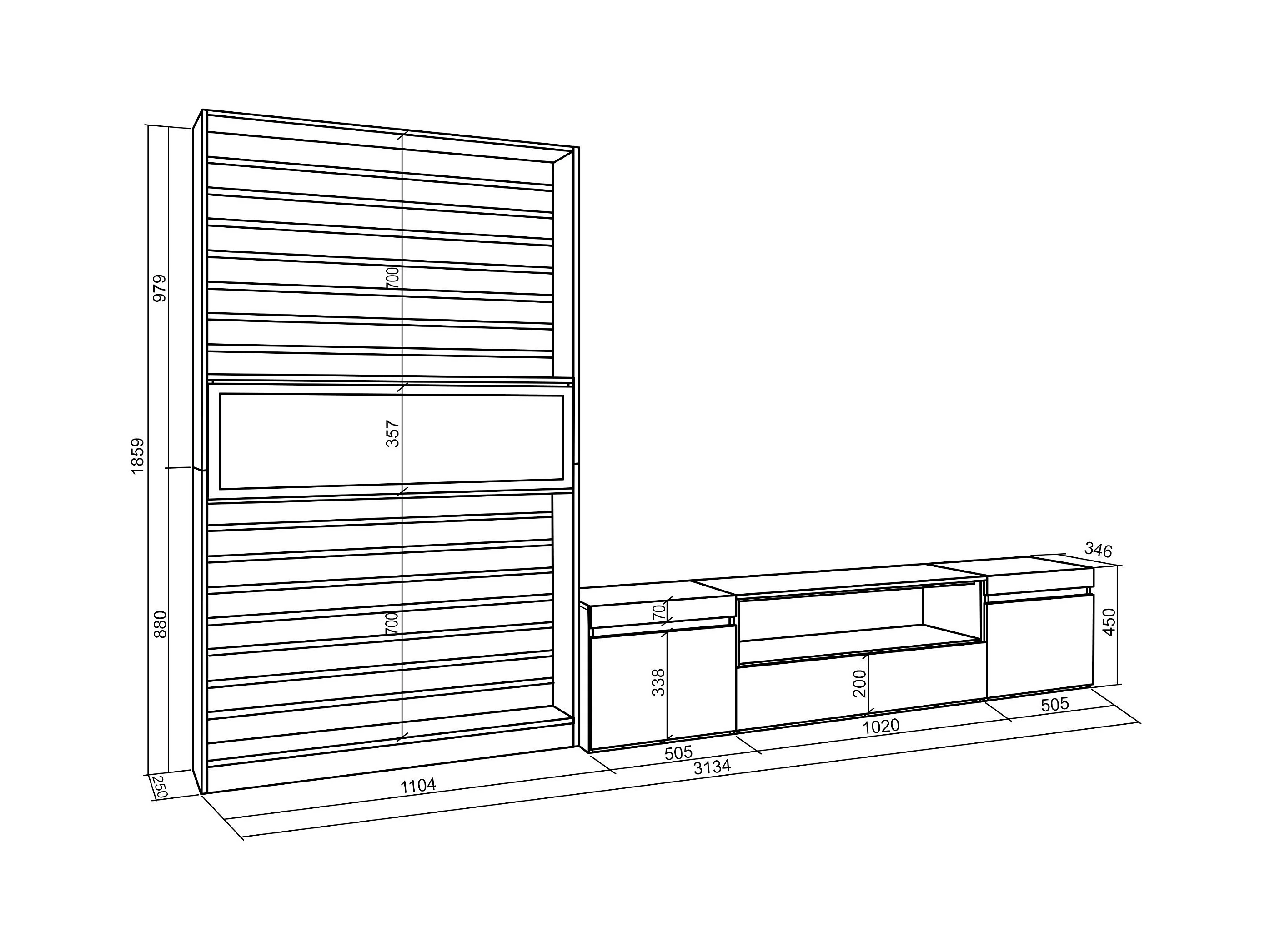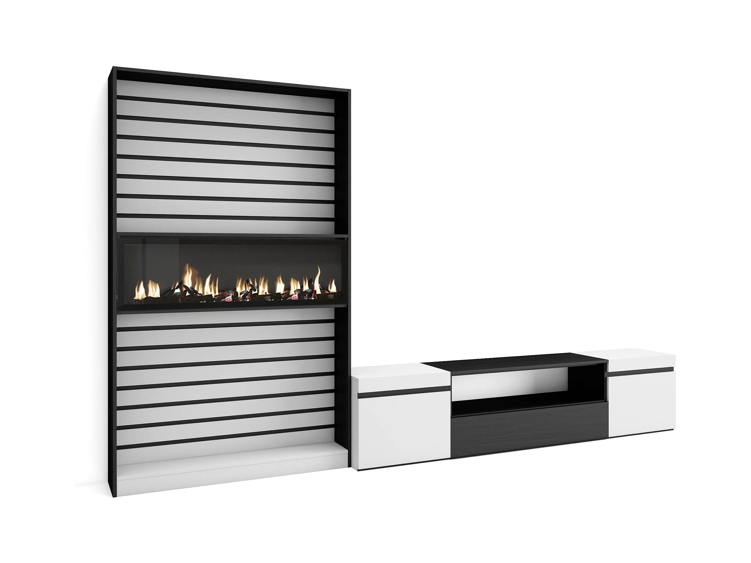 Ensemble Meuble TV, 310x35x186cm, Pour les TV jusqu'à 80", Cheminée électrique, Blanc et noir