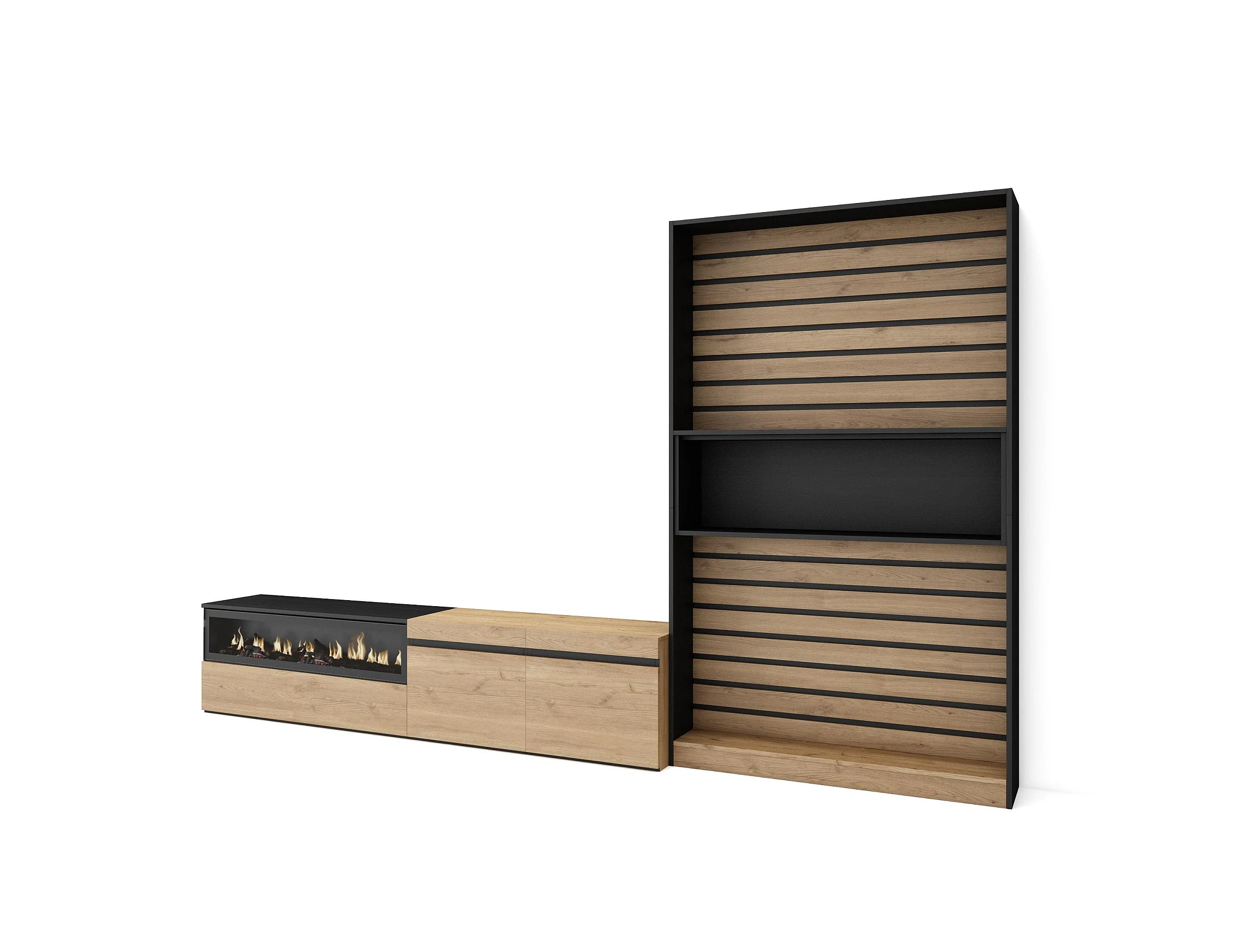 Ensemble Meuble TV, 310x35x186cm, Pour les TV jusqu'à 80", Cheminée électrique, Chêne et noir
