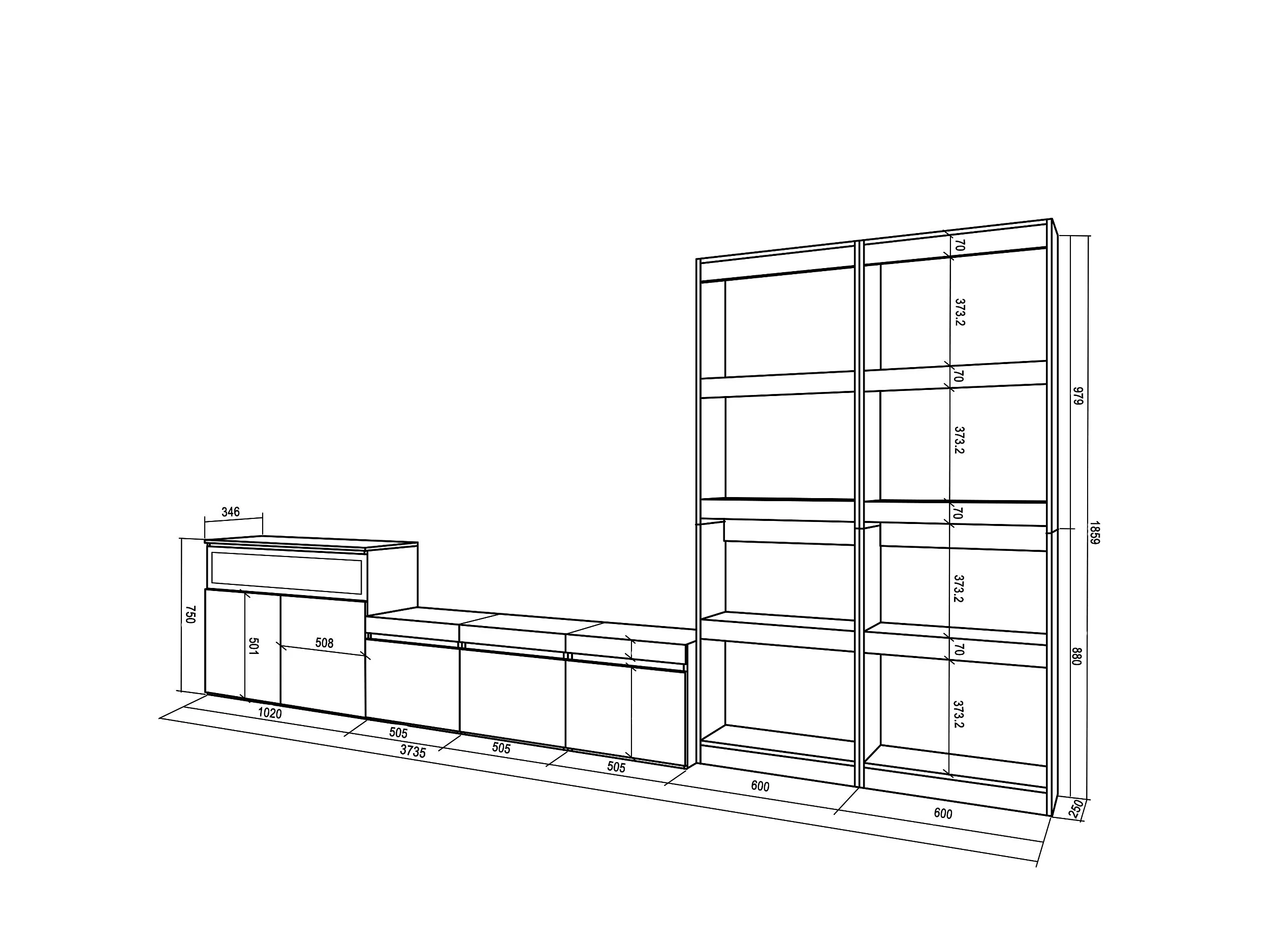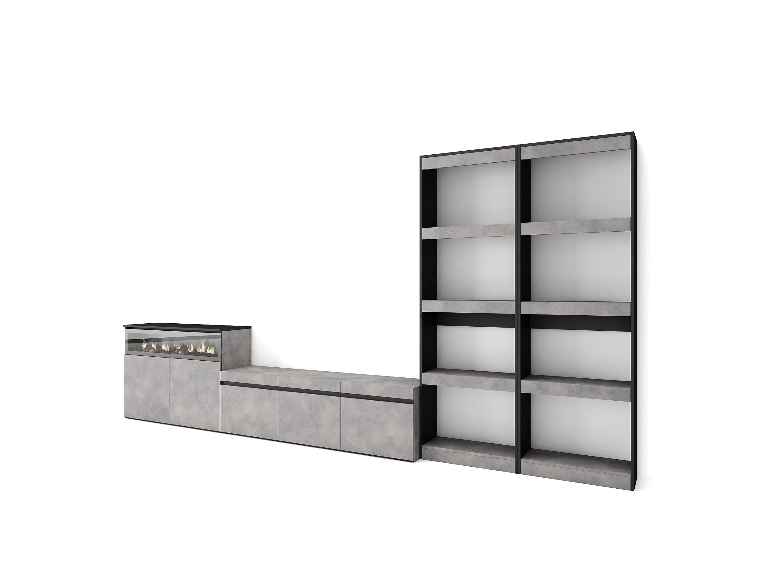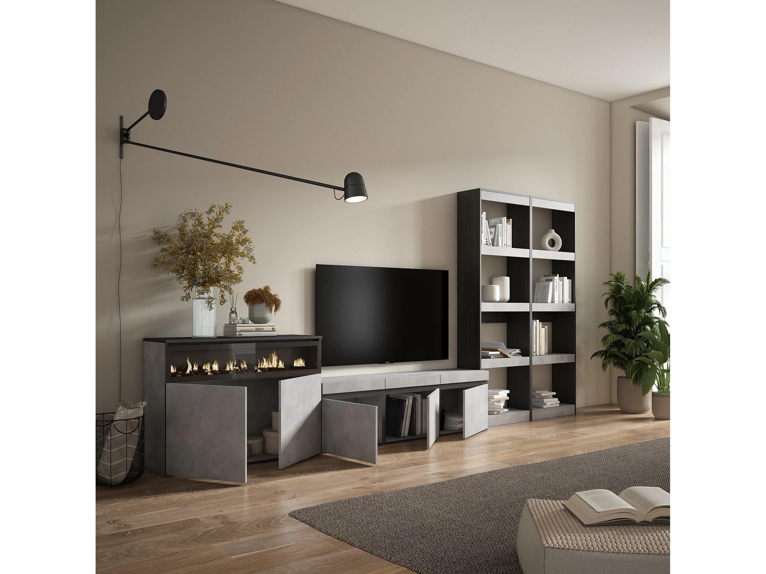 Ensemble Meuble TV, 370x35x186cm, Pour les TV jusqu'à 65", Cheminée électrique, Ciment
