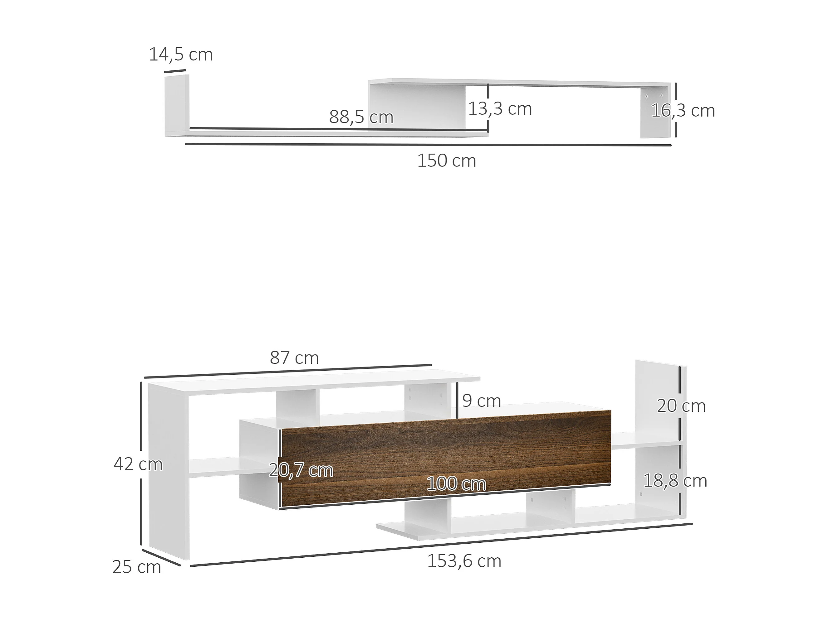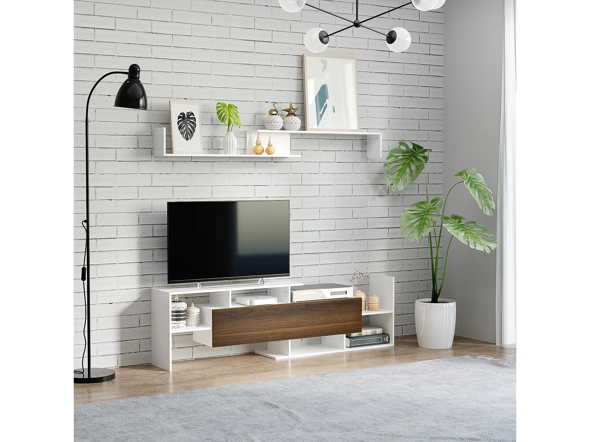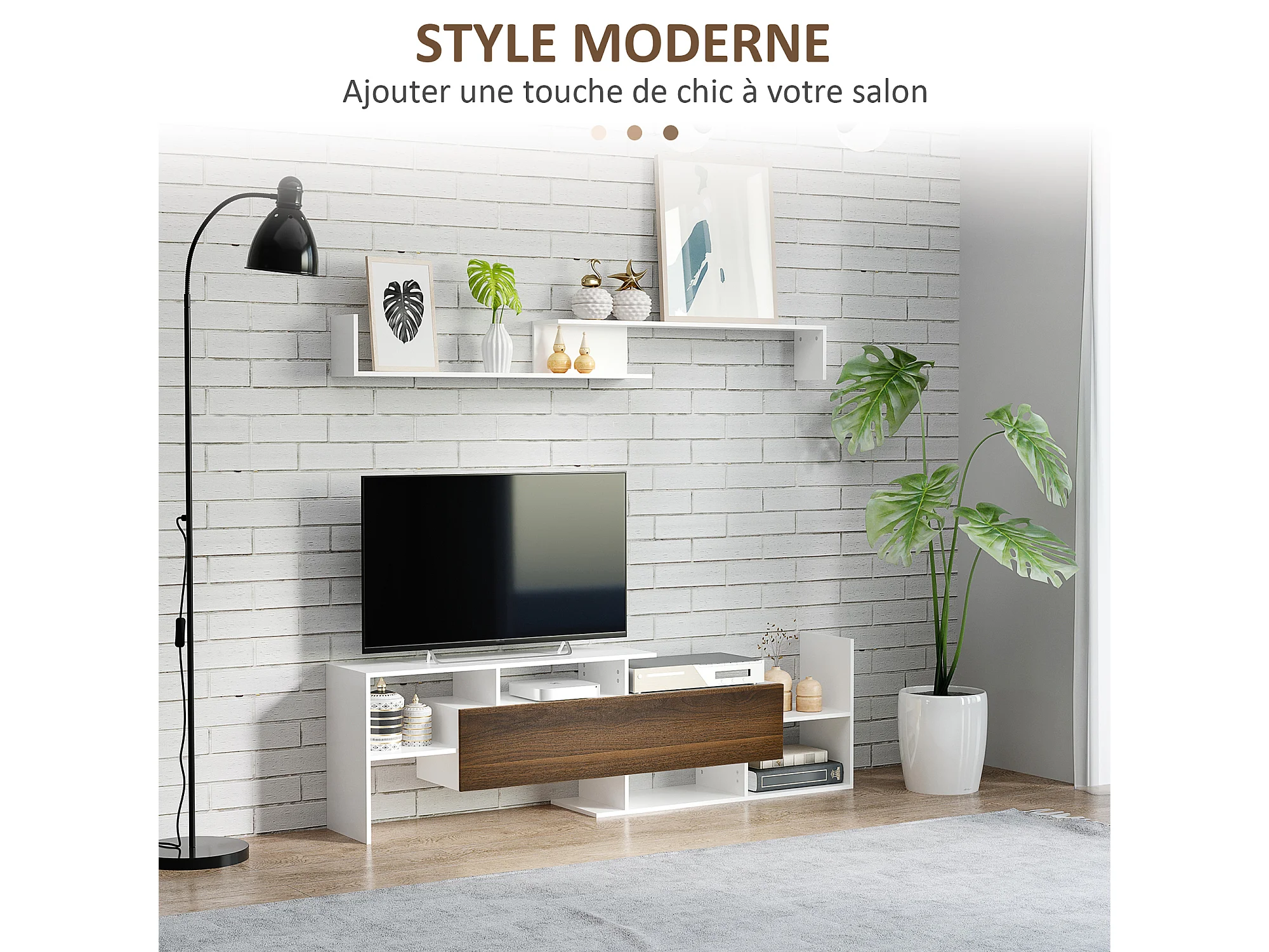 Ensemble meuble TV avec étagère murale style contemporain aspect bois noyer blanc