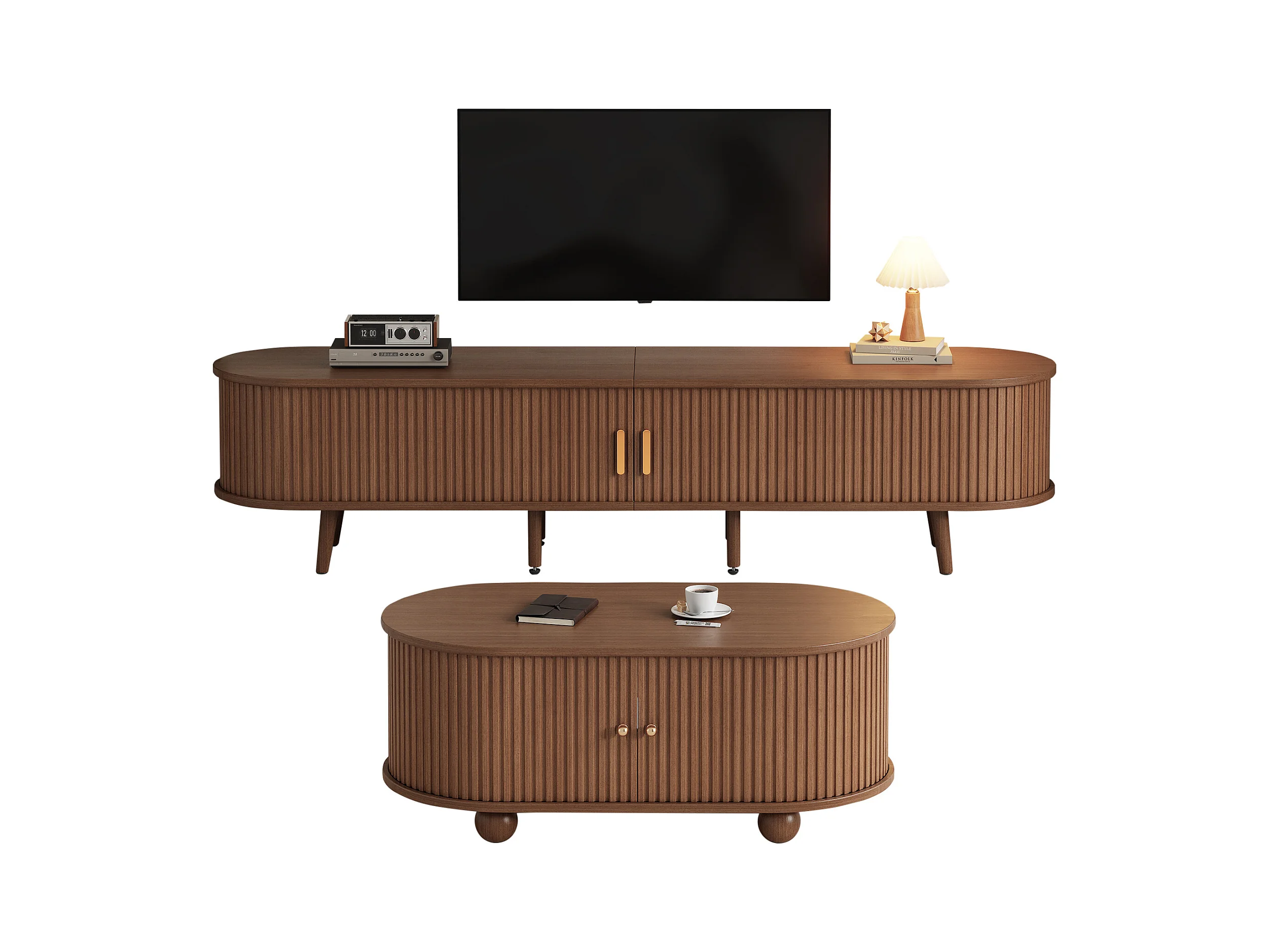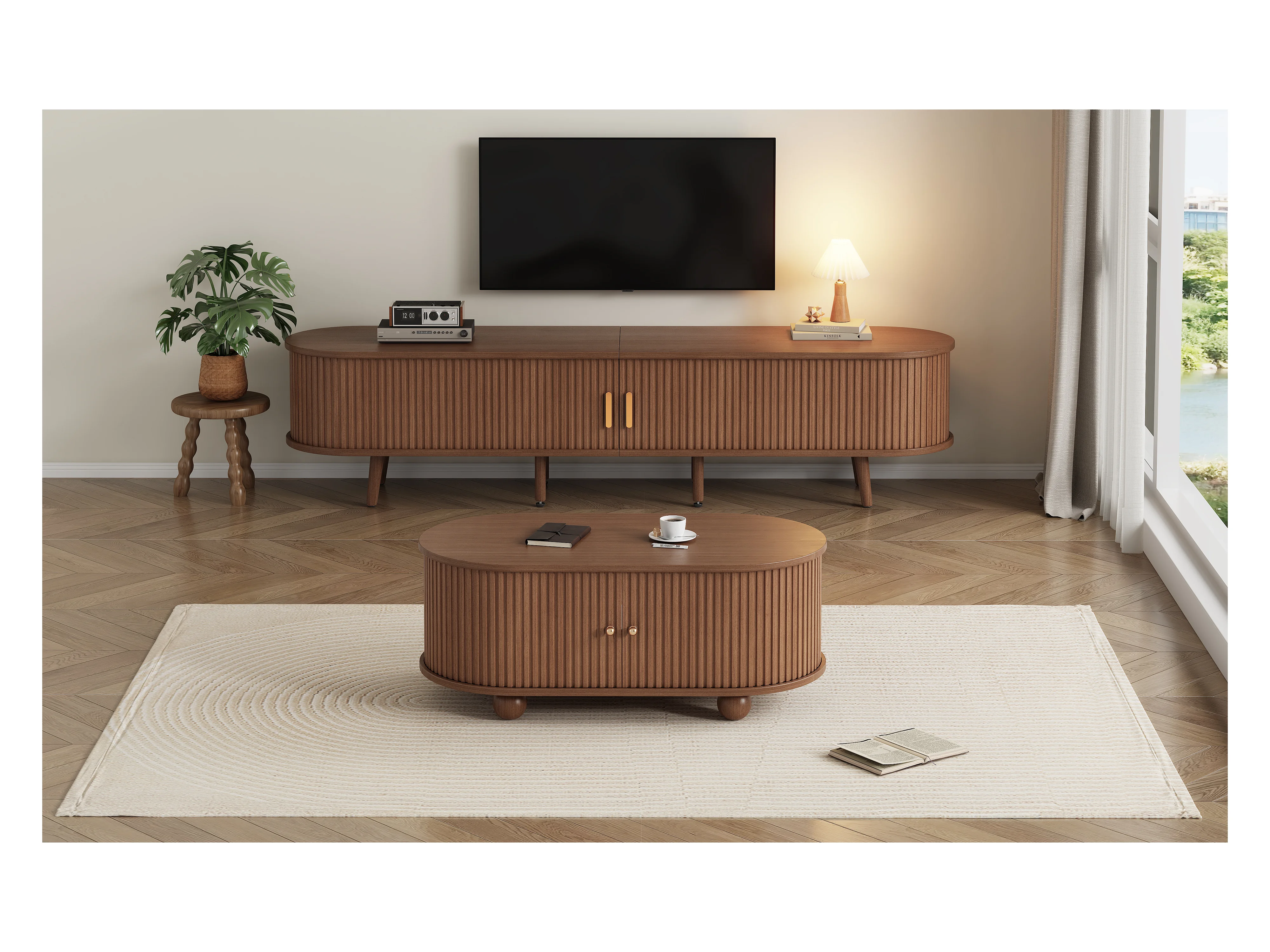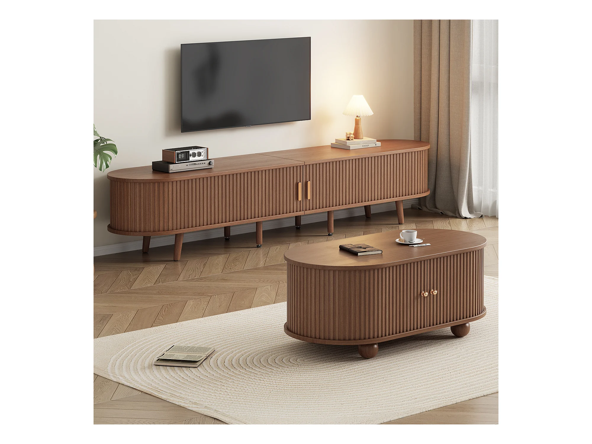 Ensemble meuble TV avec rangement + combinaison table basse - MDF - naturel foncé