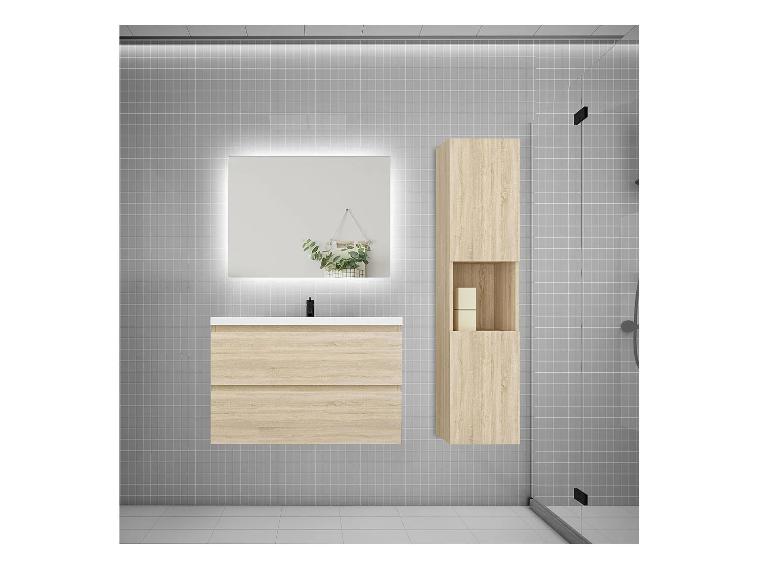 Ensemble meuble vasque 80cm 2 tiroirs + lavabo + colonne + miroir,chêne