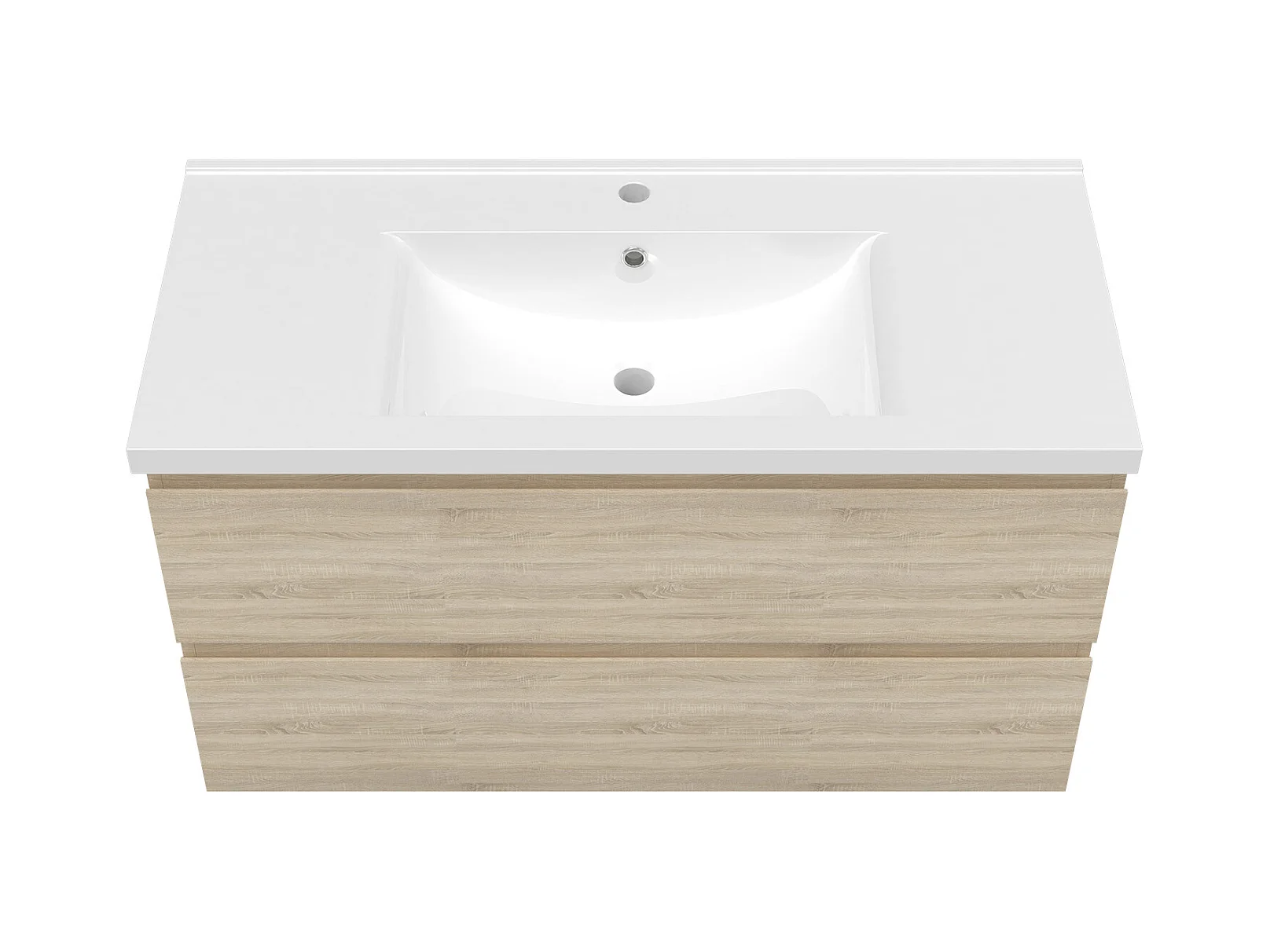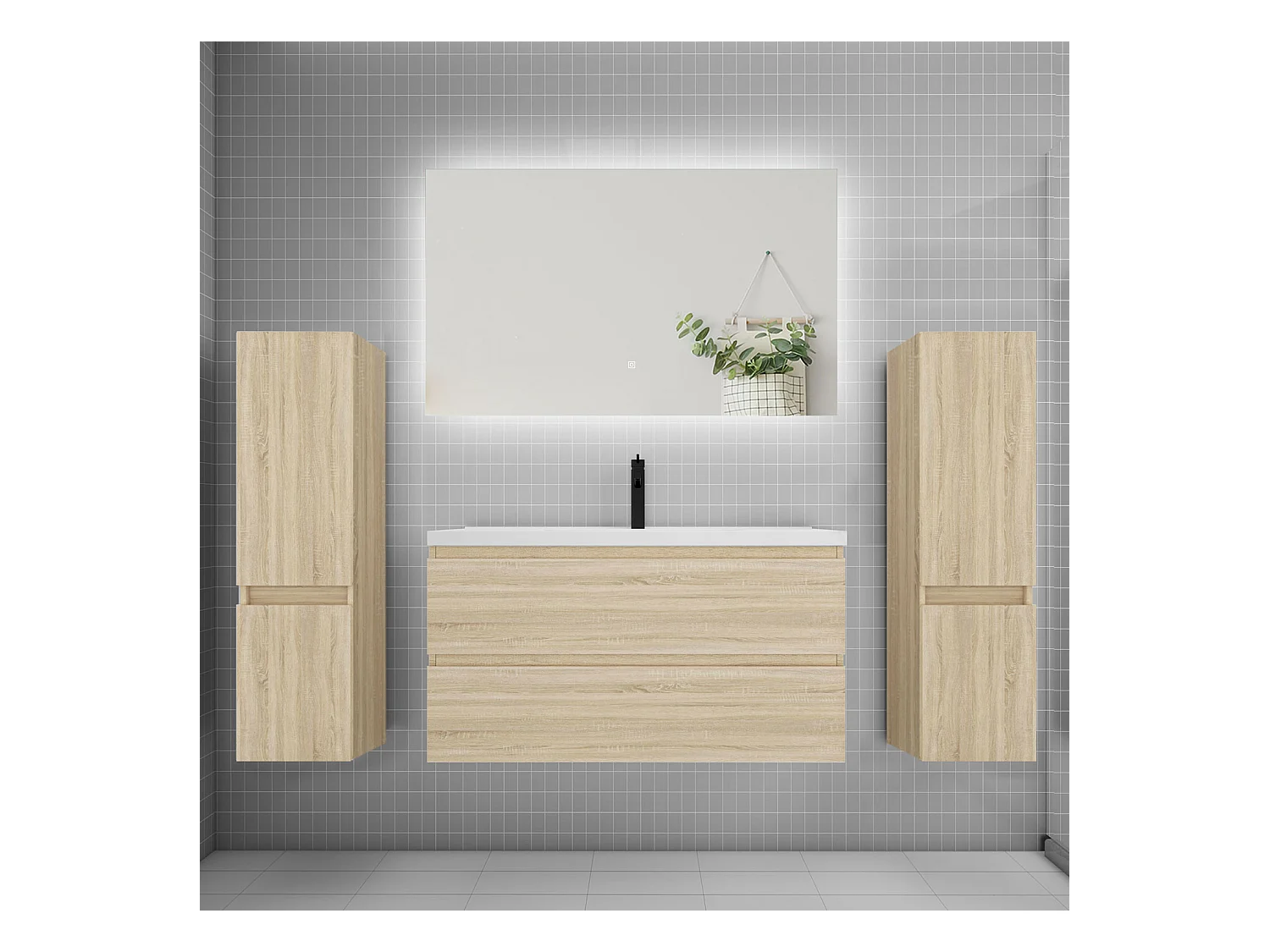 Ensemble meuble vasque L.100cm 2 tiroirs + lavabo + colonne + miroir 100cm,chêne