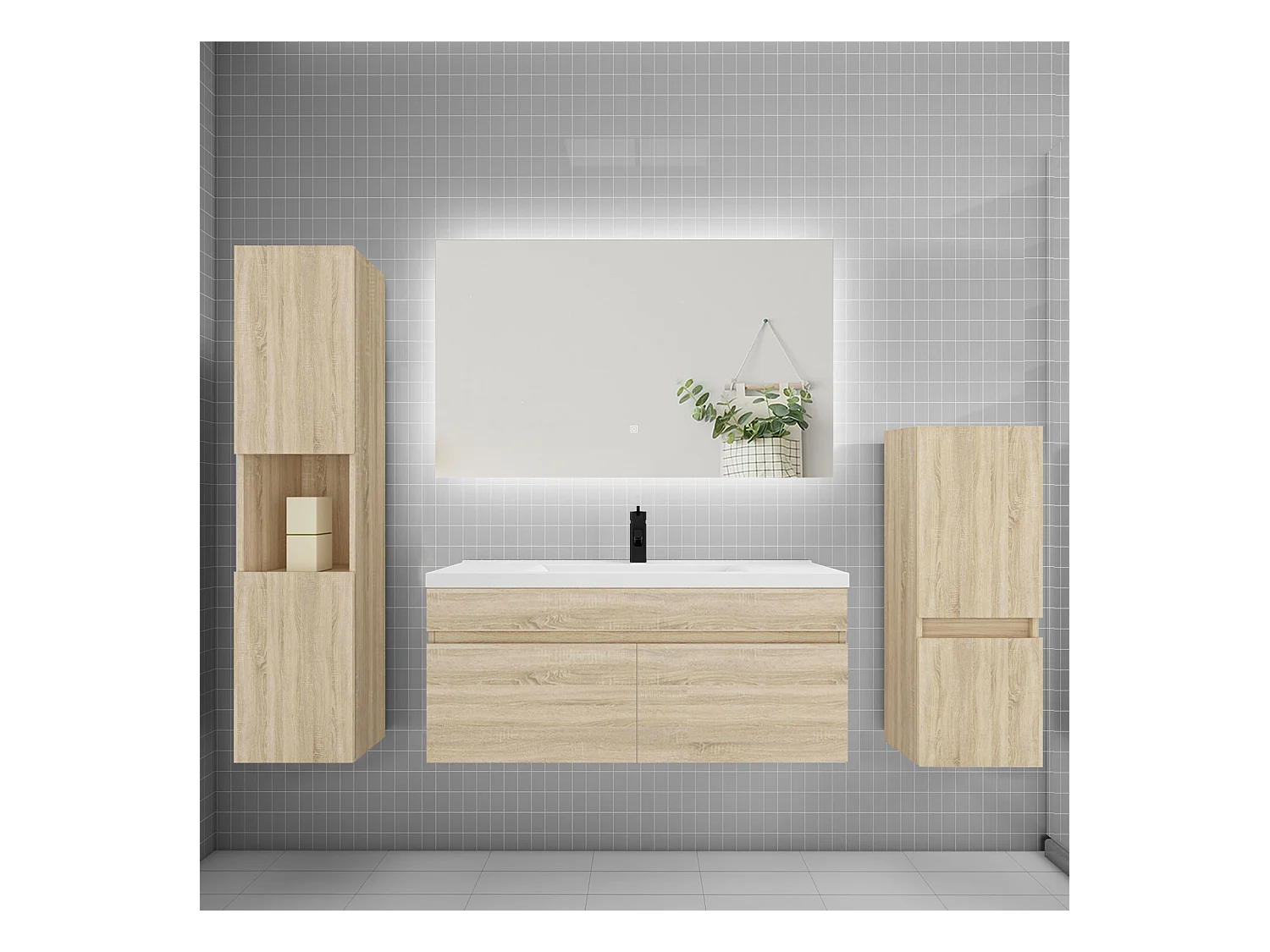 Ensemble meuble vasque L.100cm lavabo + colonne + miroir,chêne