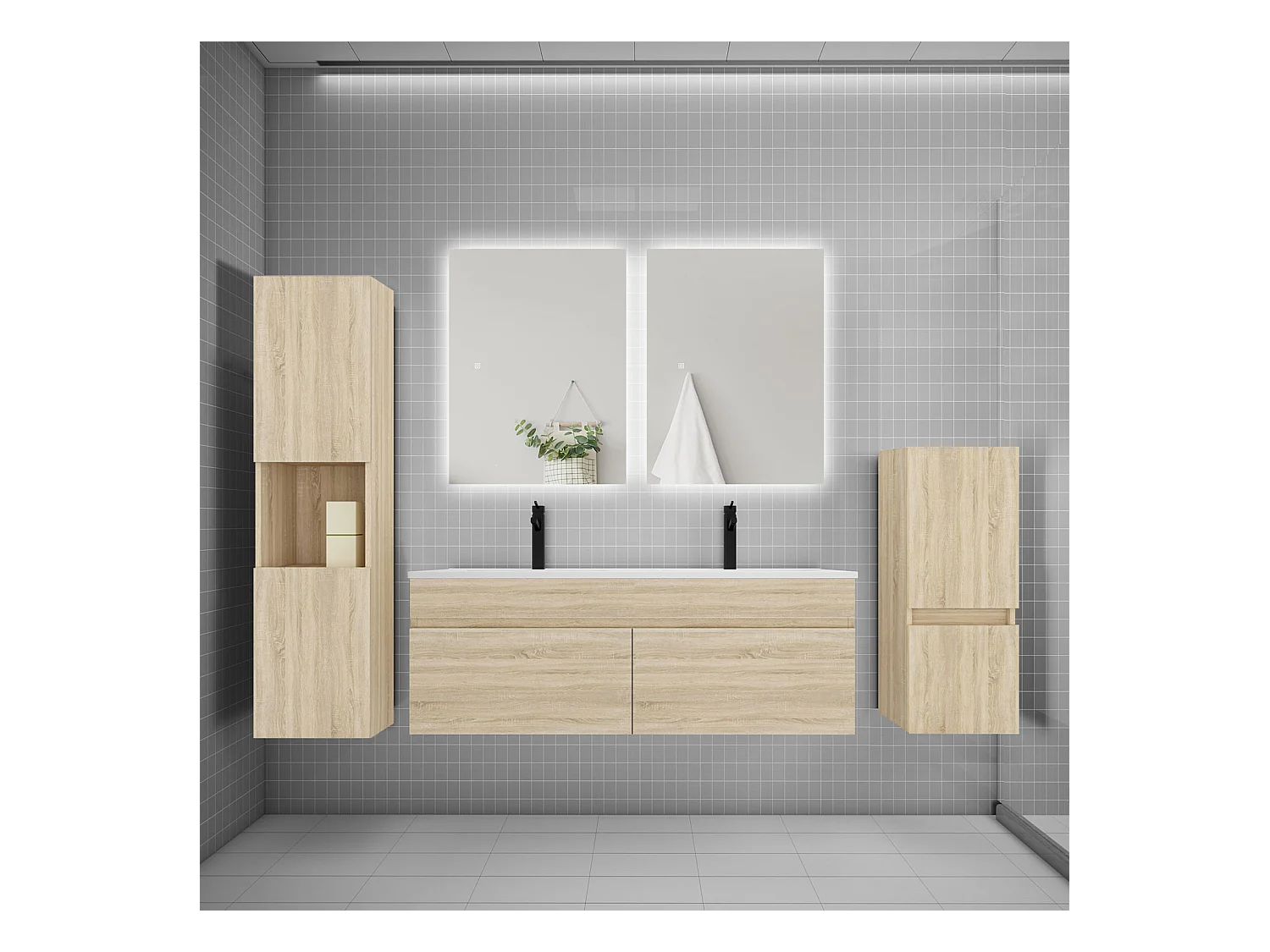Ensemble meuble vasque L.120cm lavabo + colonne + miroir,chêne
