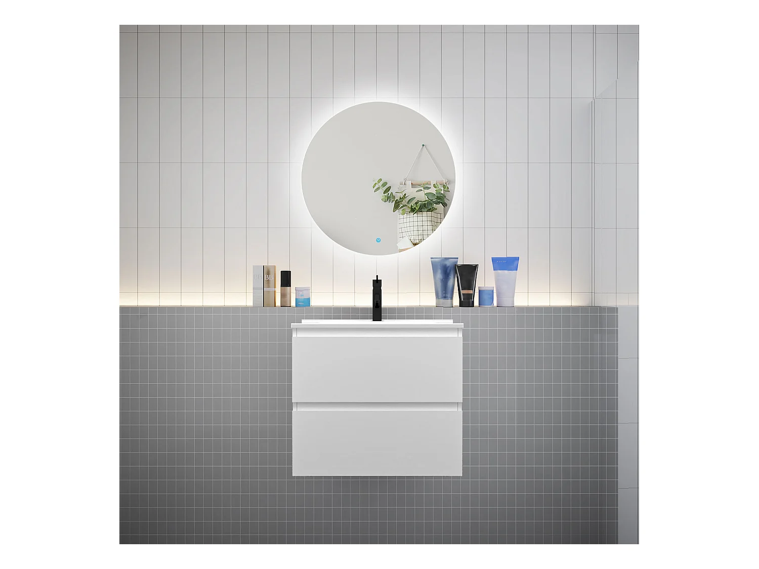 Ensemble meuble vasque L.60cm 2 tiroirs + lavabo + LED miroir rond 60cm,blanc