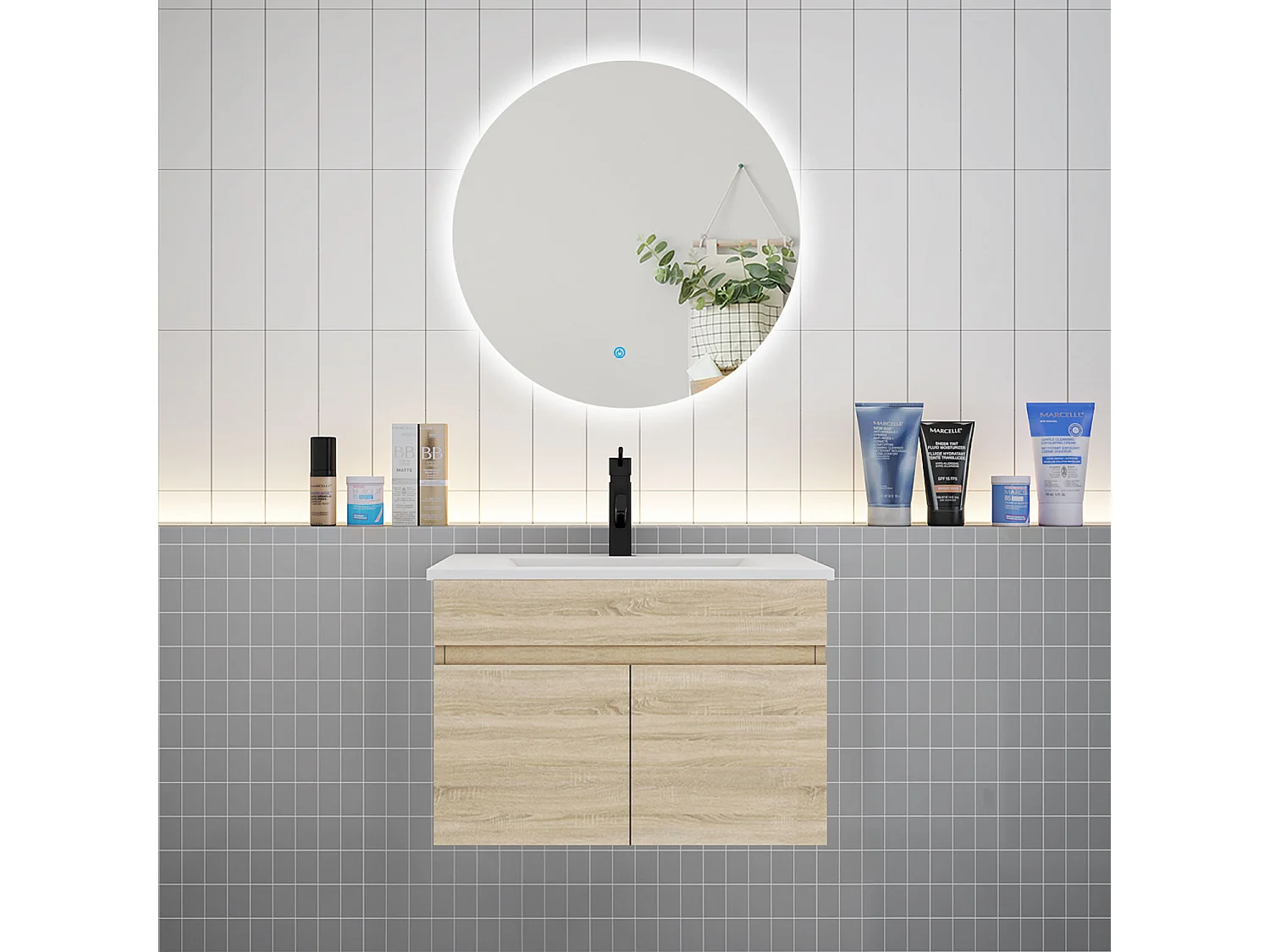 Ensemble meuble vasque L.60cm lavabo + LED miroir rond 60cm,chêne
