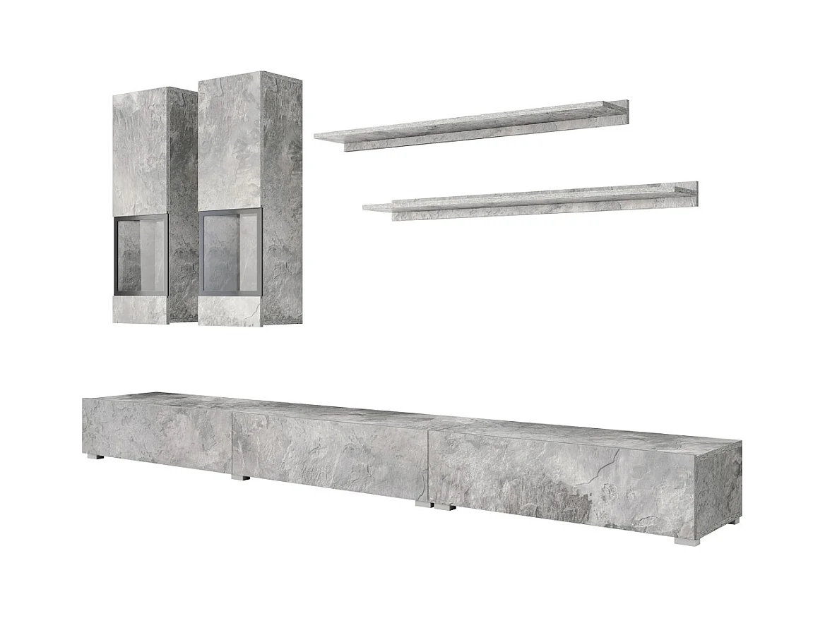 Ensemble salon mural RAMOS – Gris effet béton – Meuble TV XL + vitrines + étagères – Sans LED
