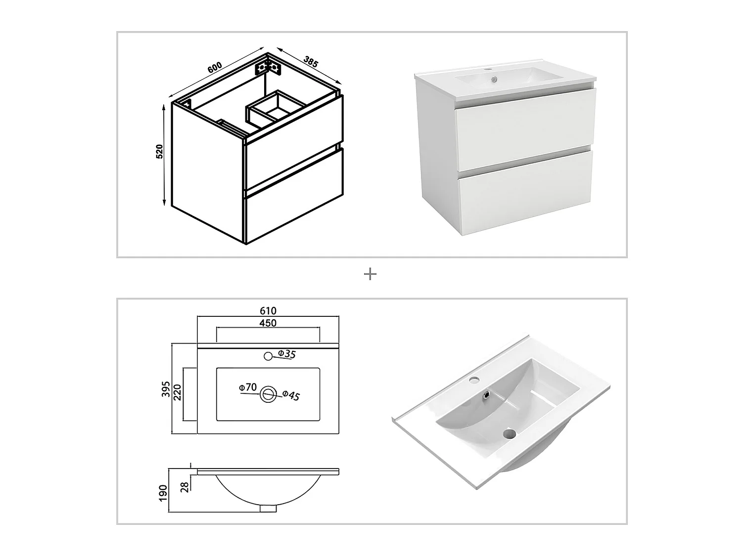 Ensemble meubles salle de bain 3pcs 60cm simple vasque + miroir Blanc, Aica