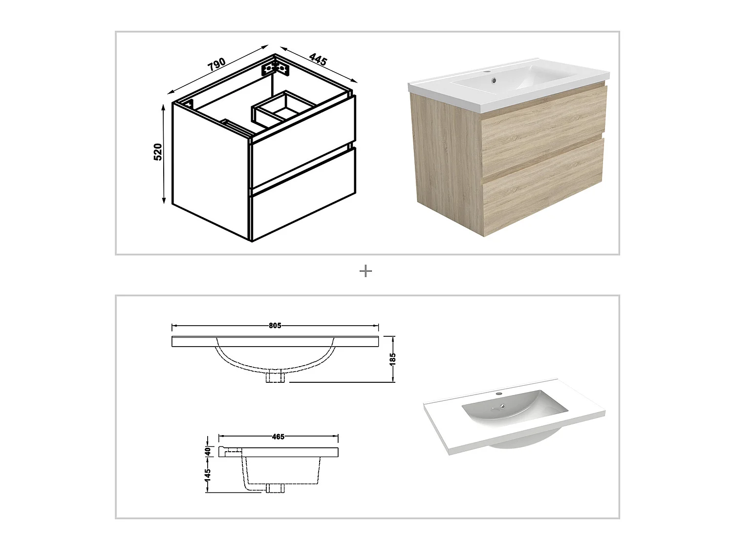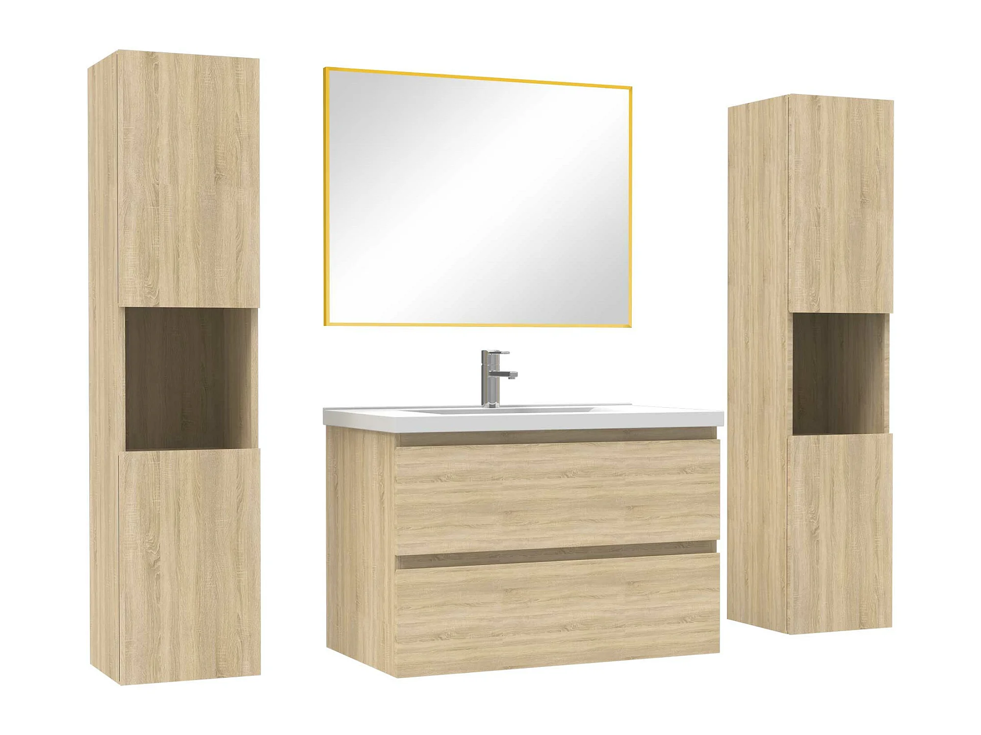 Ensemble meubles Salle de Bain avec colonne et miroir mural 80cm meuble Chêne Wotan