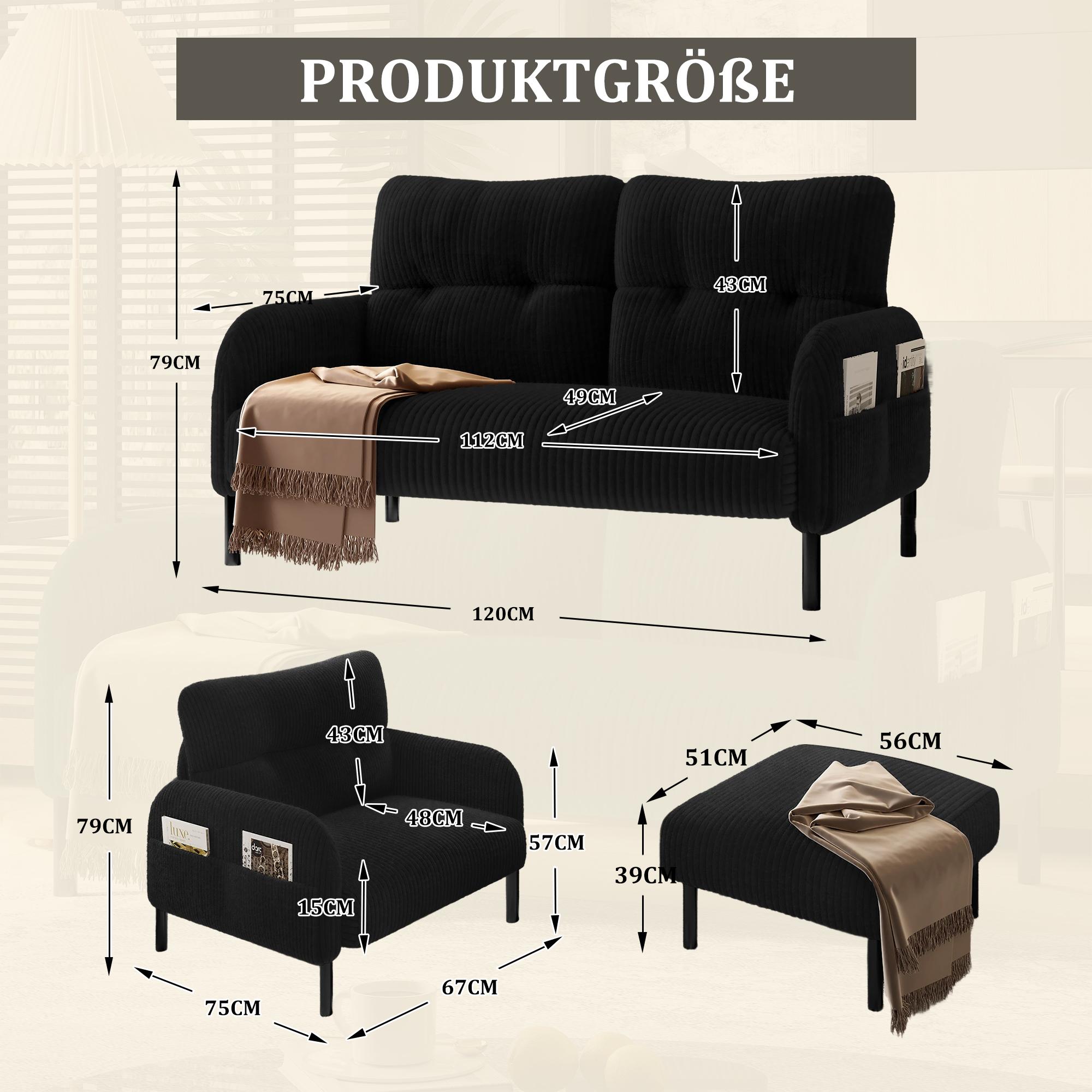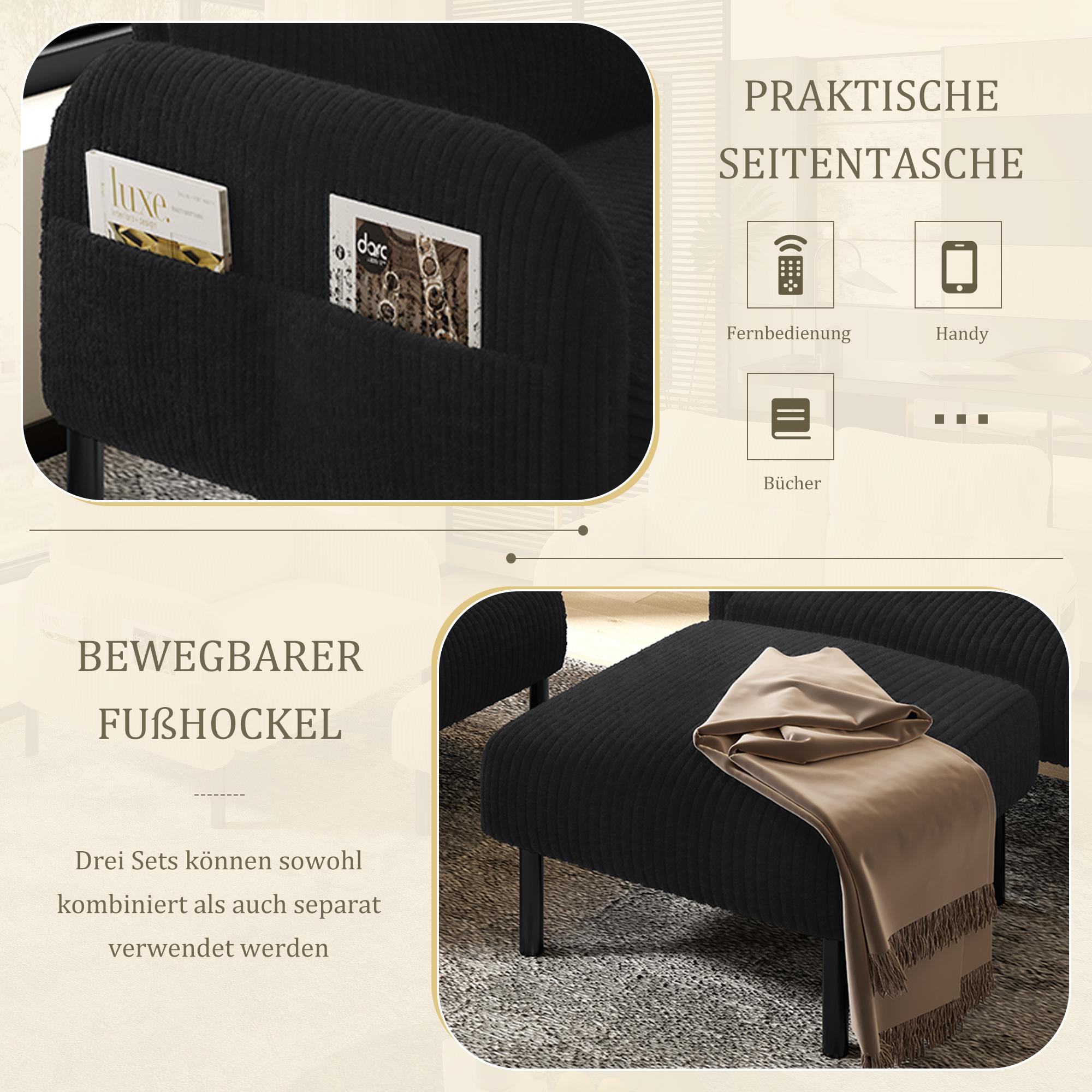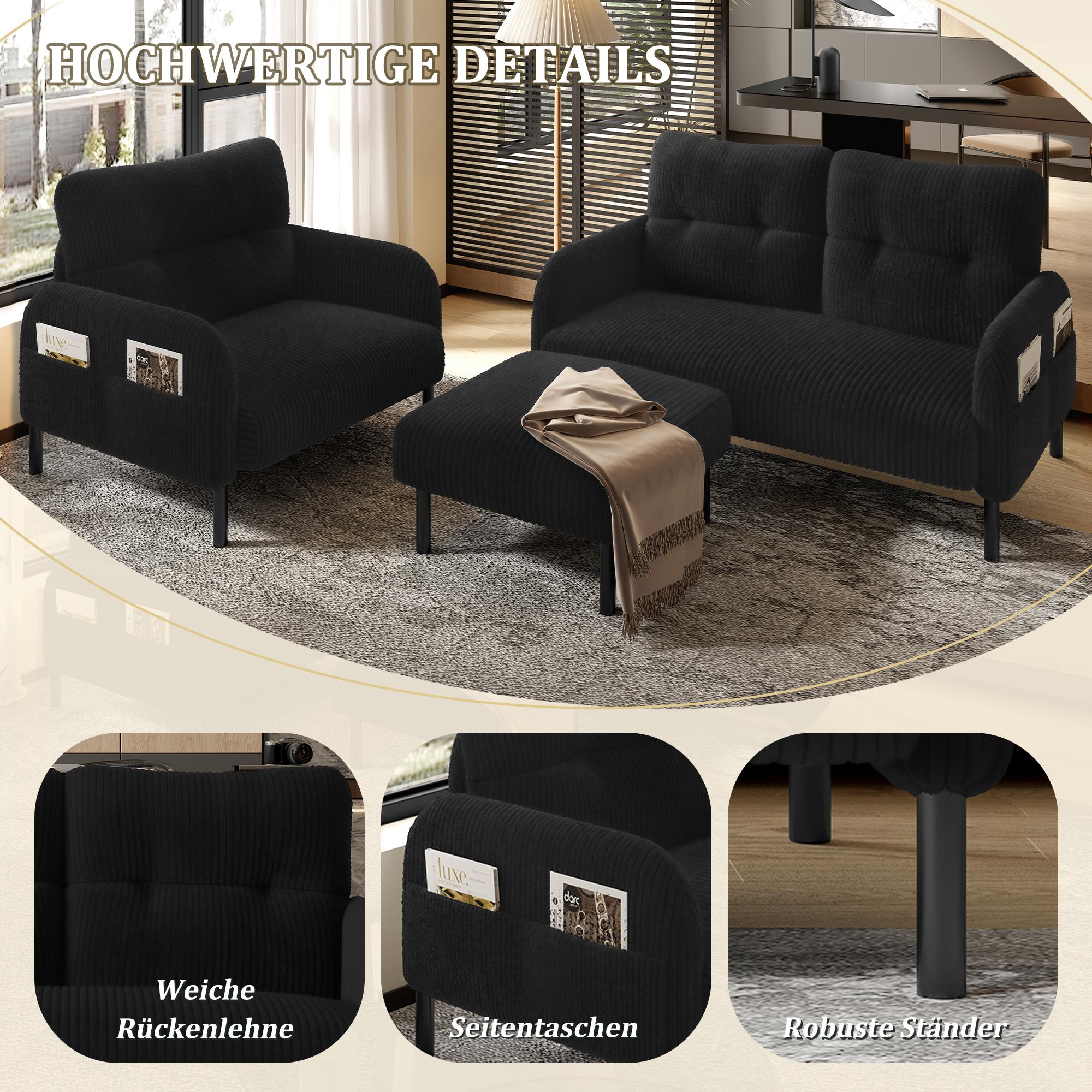 Ensemble 3 pièces velours noir – canapé 2 places et 3 places + pouf – coussins inclus – poches latérales – idéal pour salon, bureau et chambre
