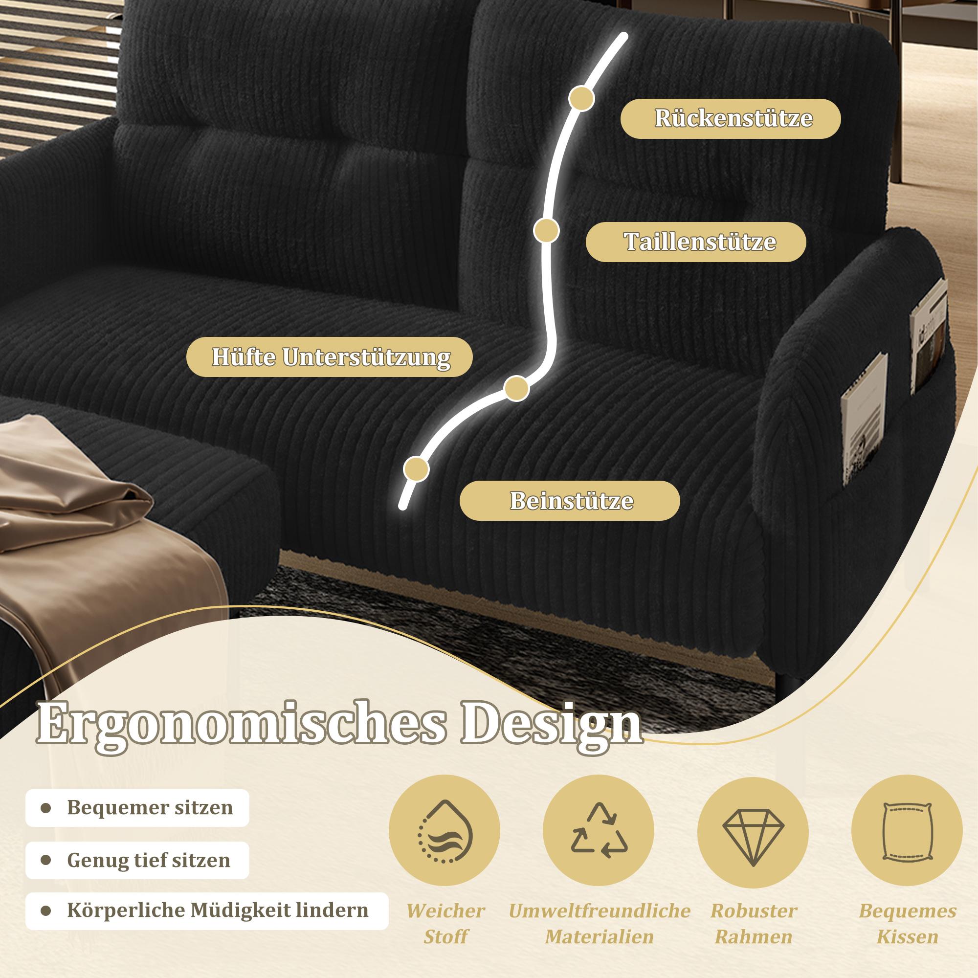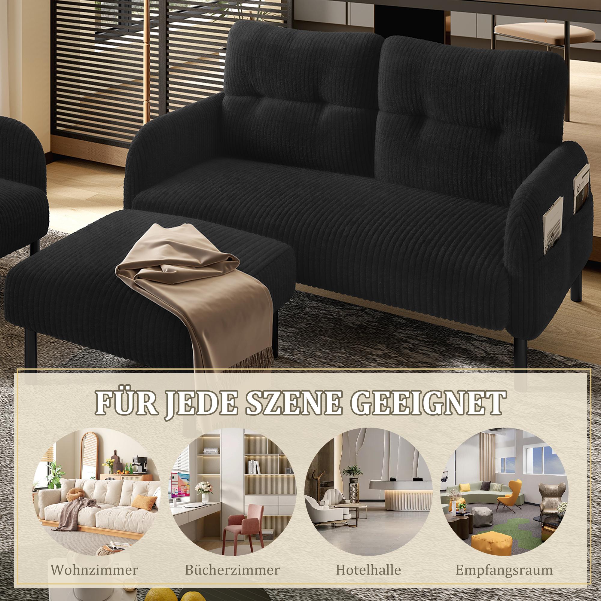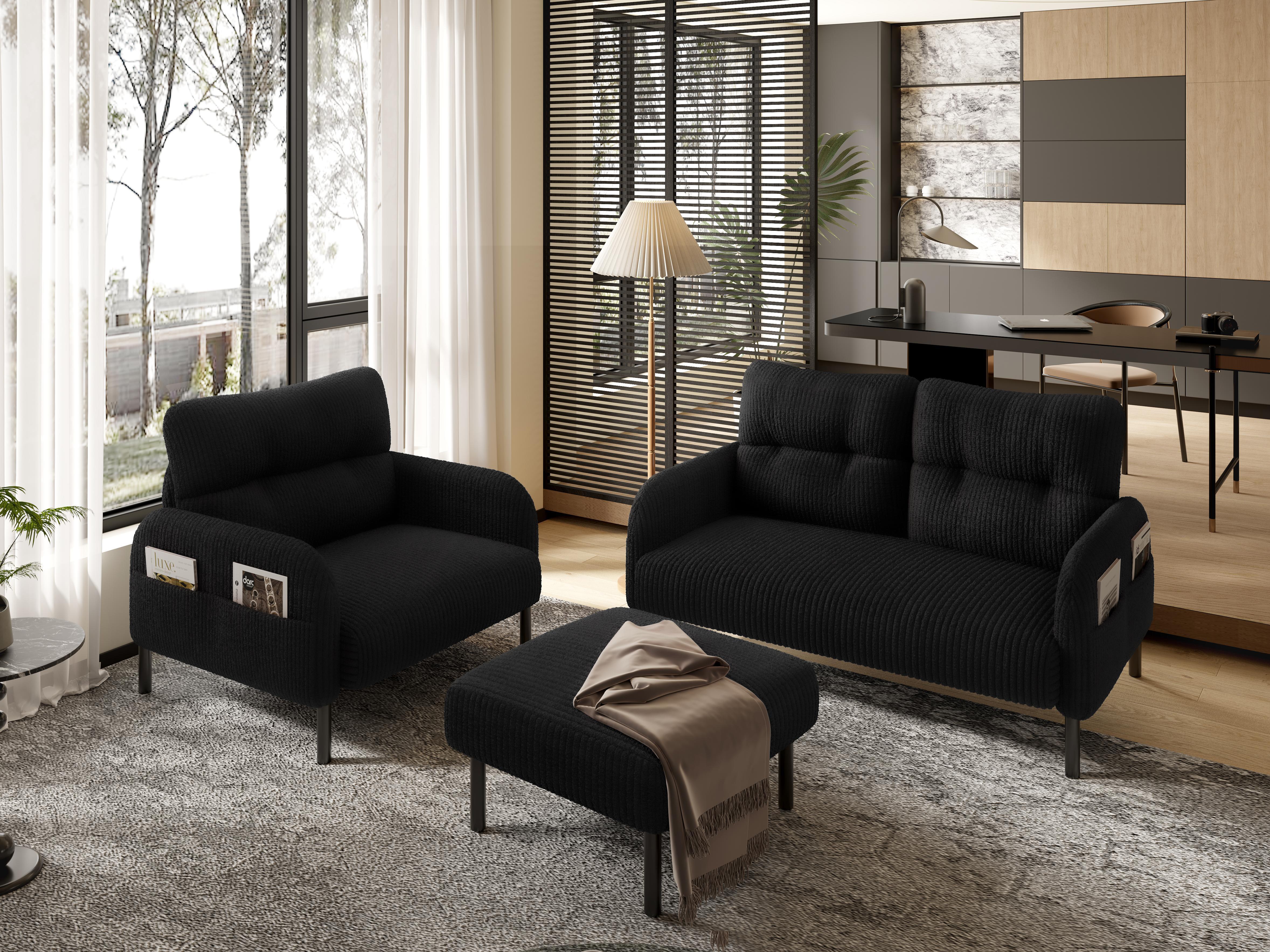 Ensemble 3 pièces velours noir – canapé 2 places et 3 places + pouf – coussins inclus – poches latérales – idéal pour salon, bureau et chambre