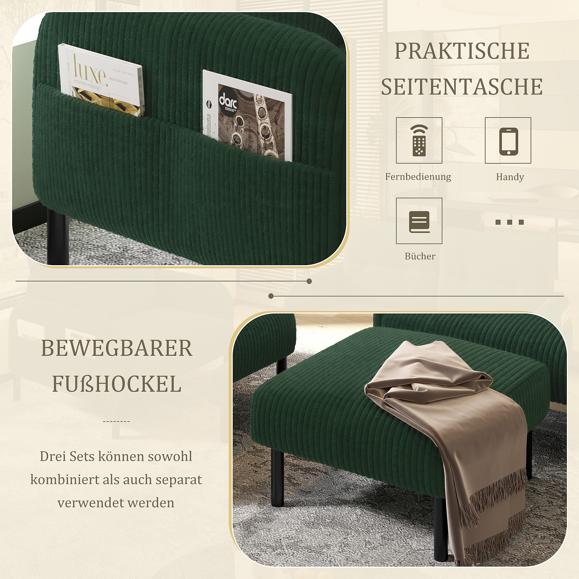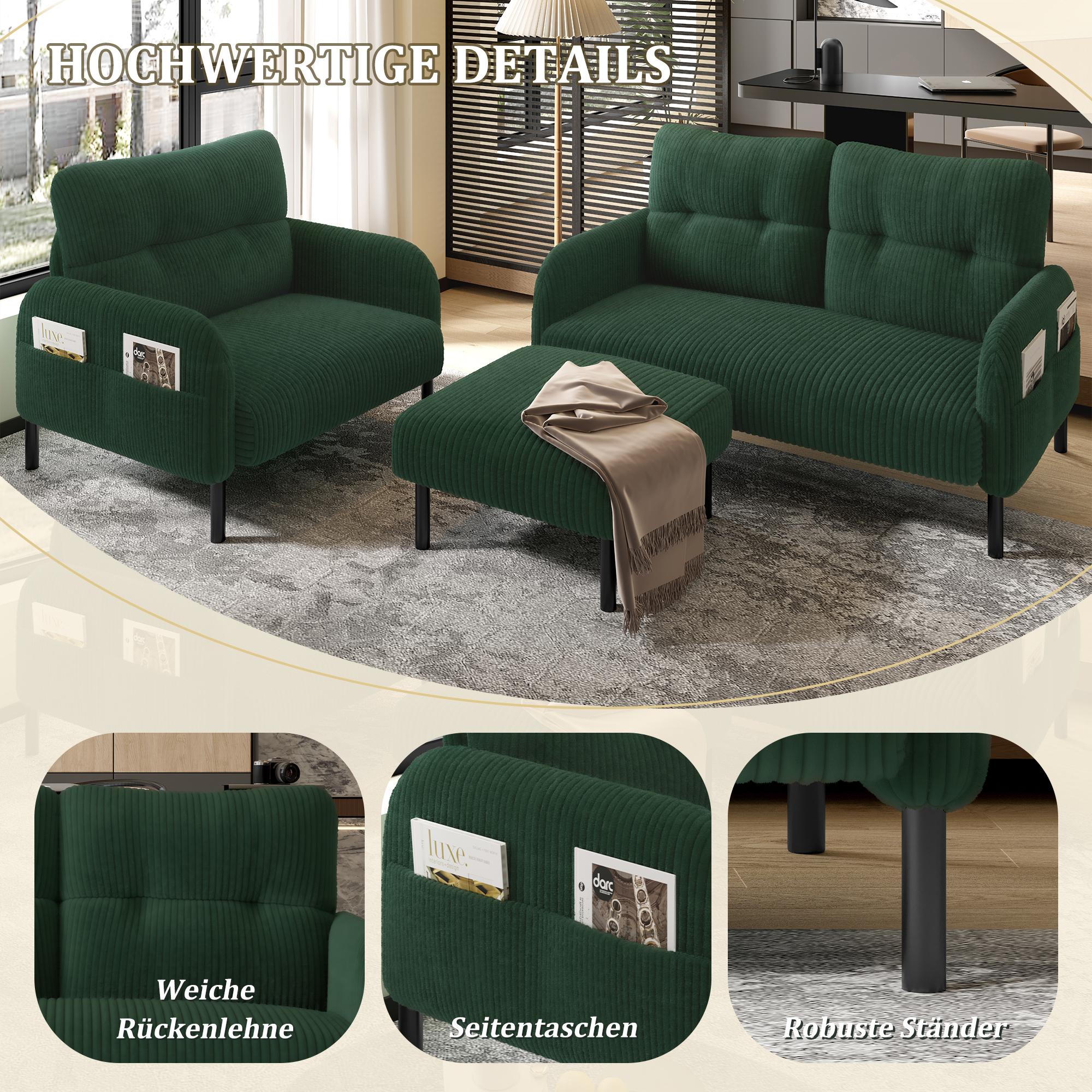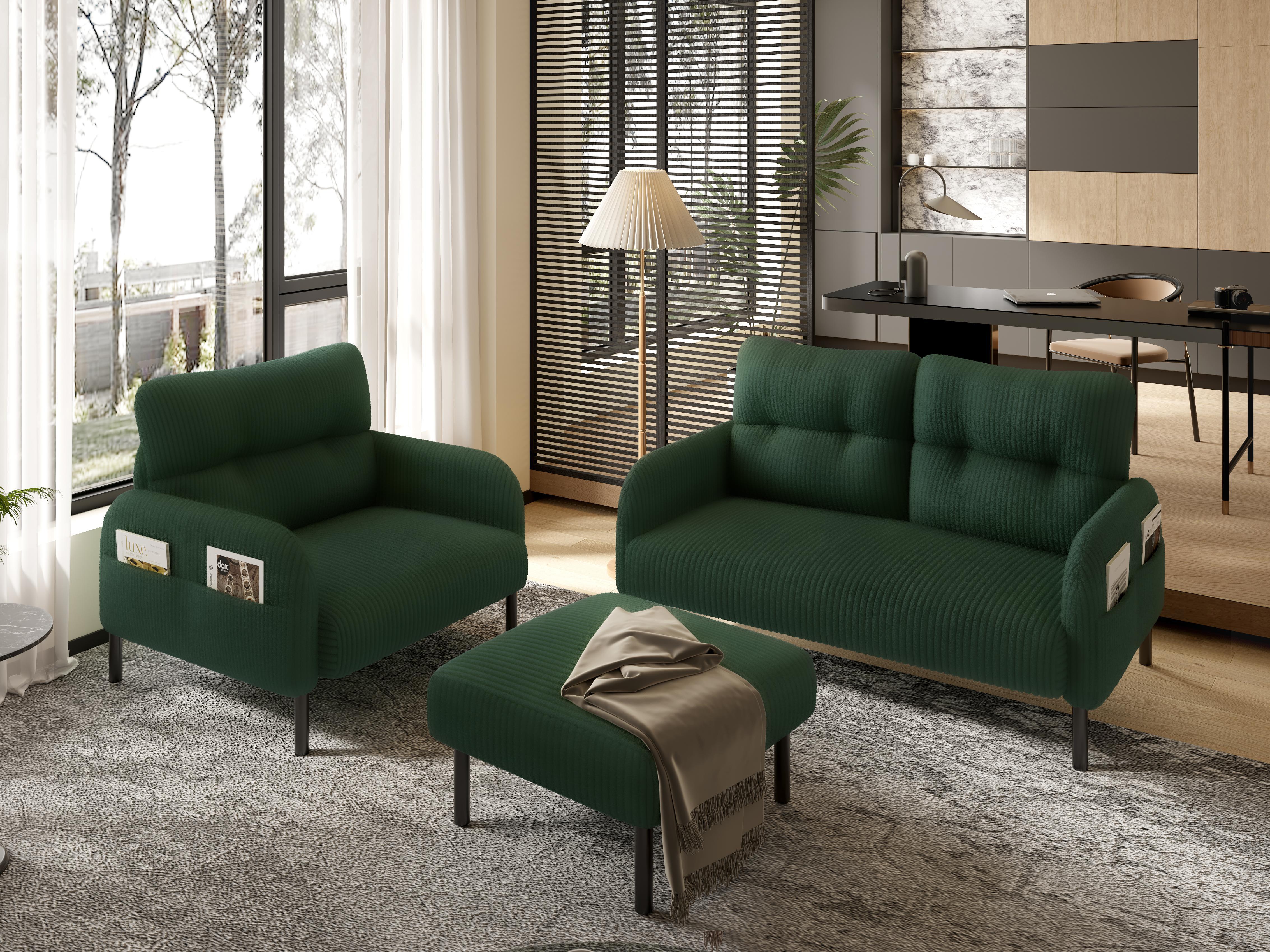 Ensemble 3 pièces velours vert – canapé 2 places et 3 places + pouf – coussins inclus – poches latérales – idéal pour salon, bureau et chambre