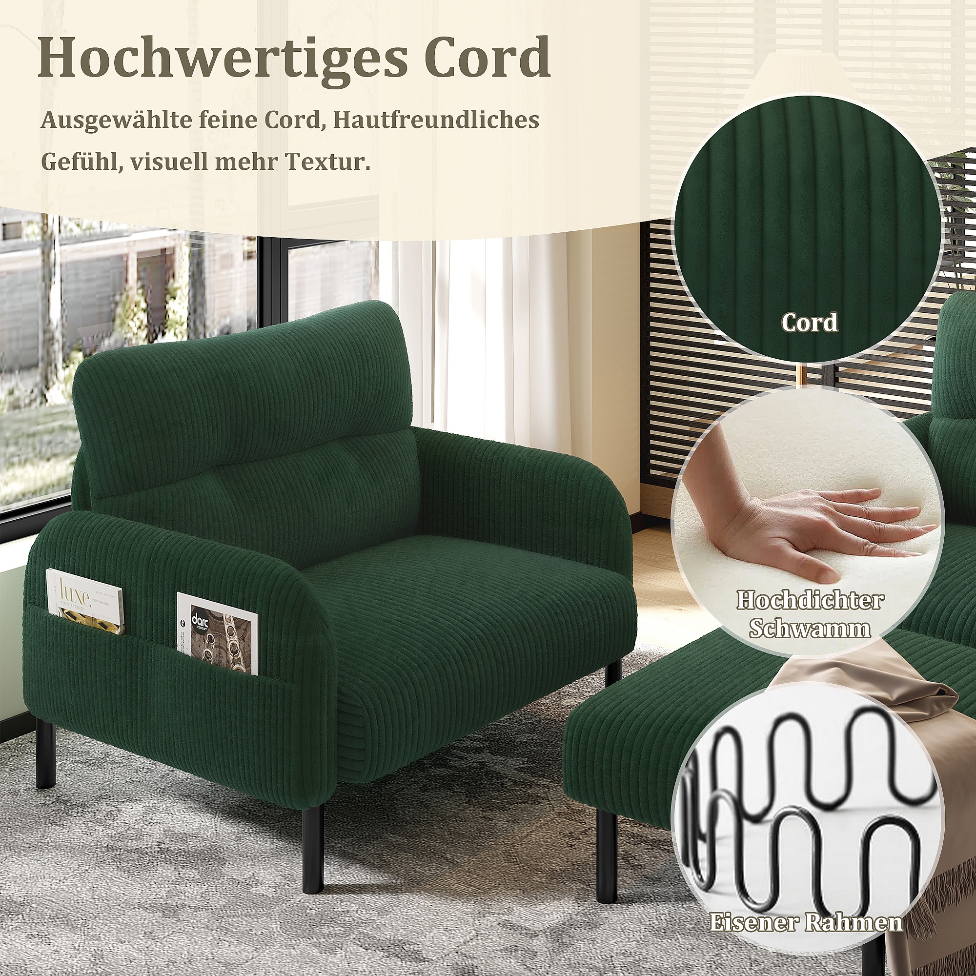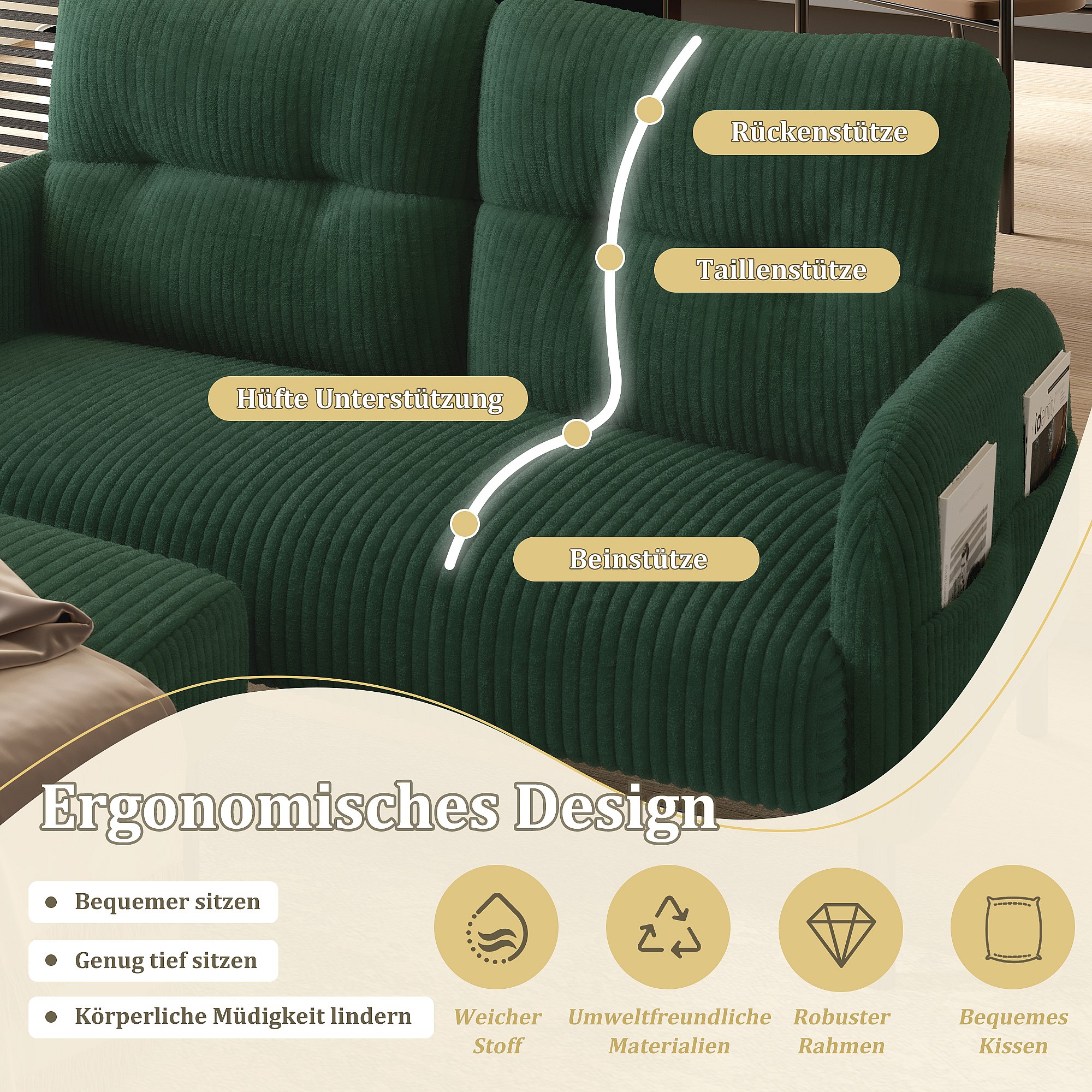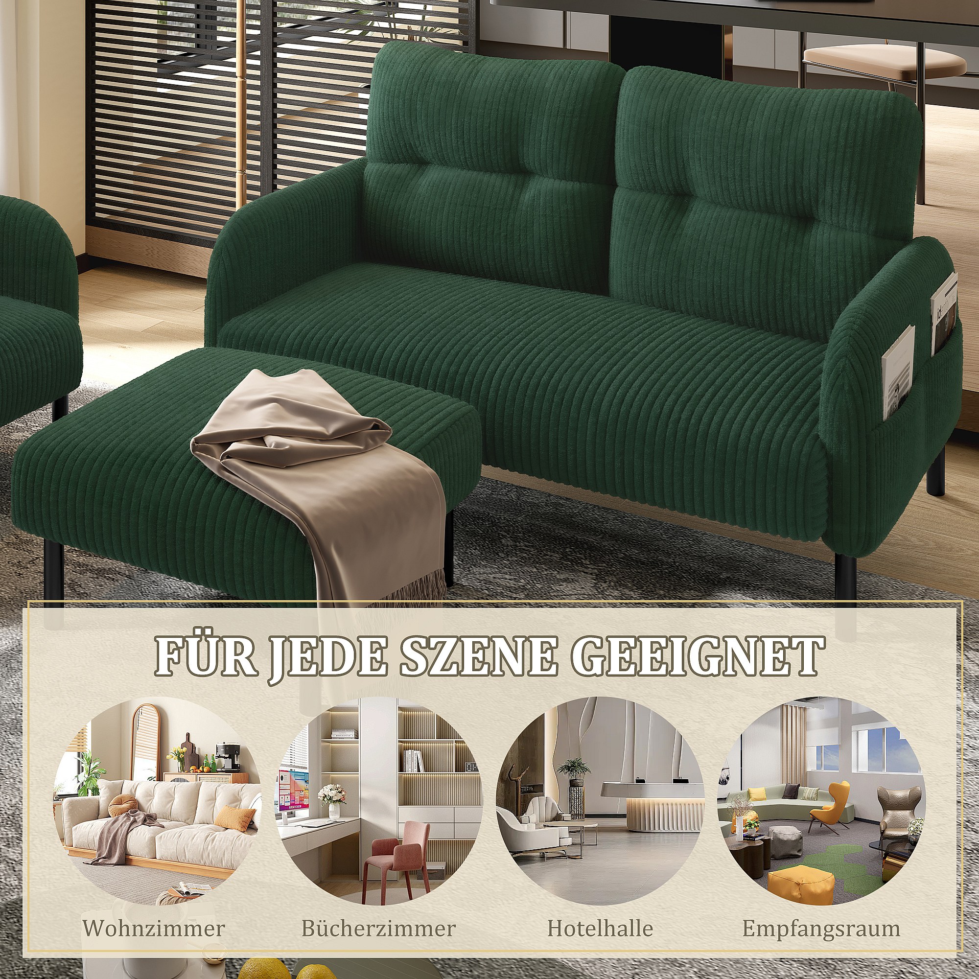 Ensemble 3 pièces velours vert – canapé 2 places et 3 places + pouf – coussins inclus – poches latérales – idéal pour salon, bureau et chambre