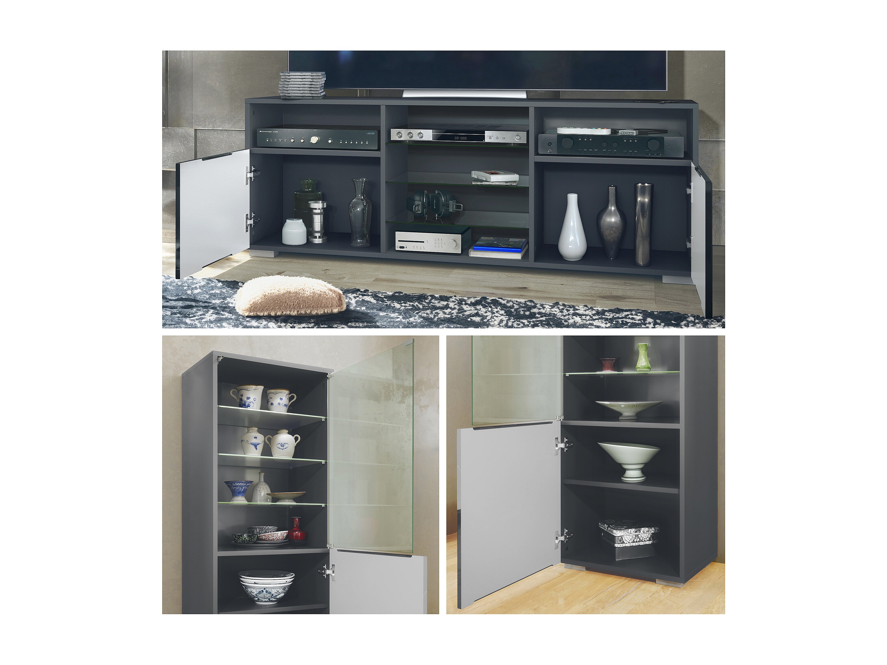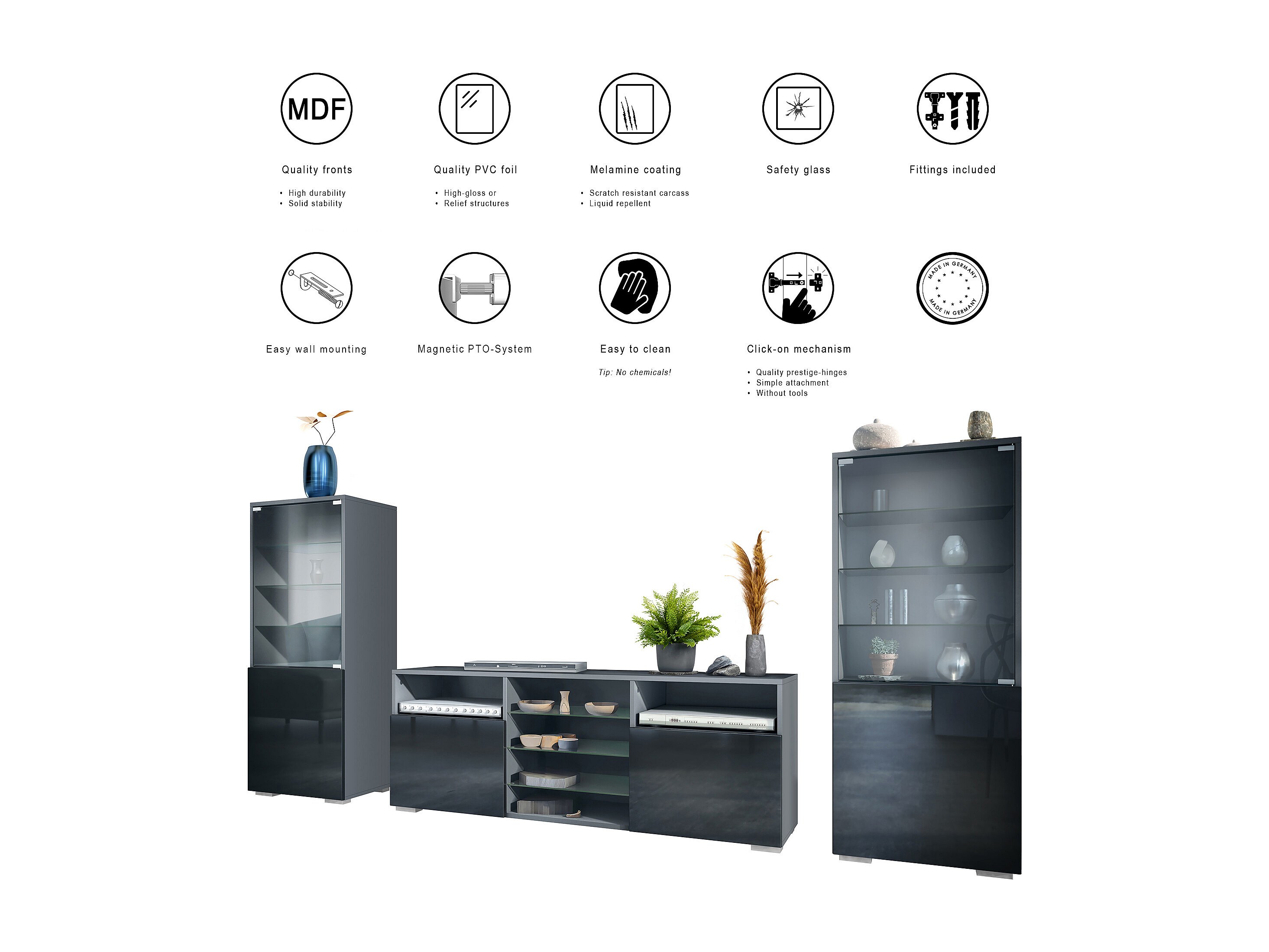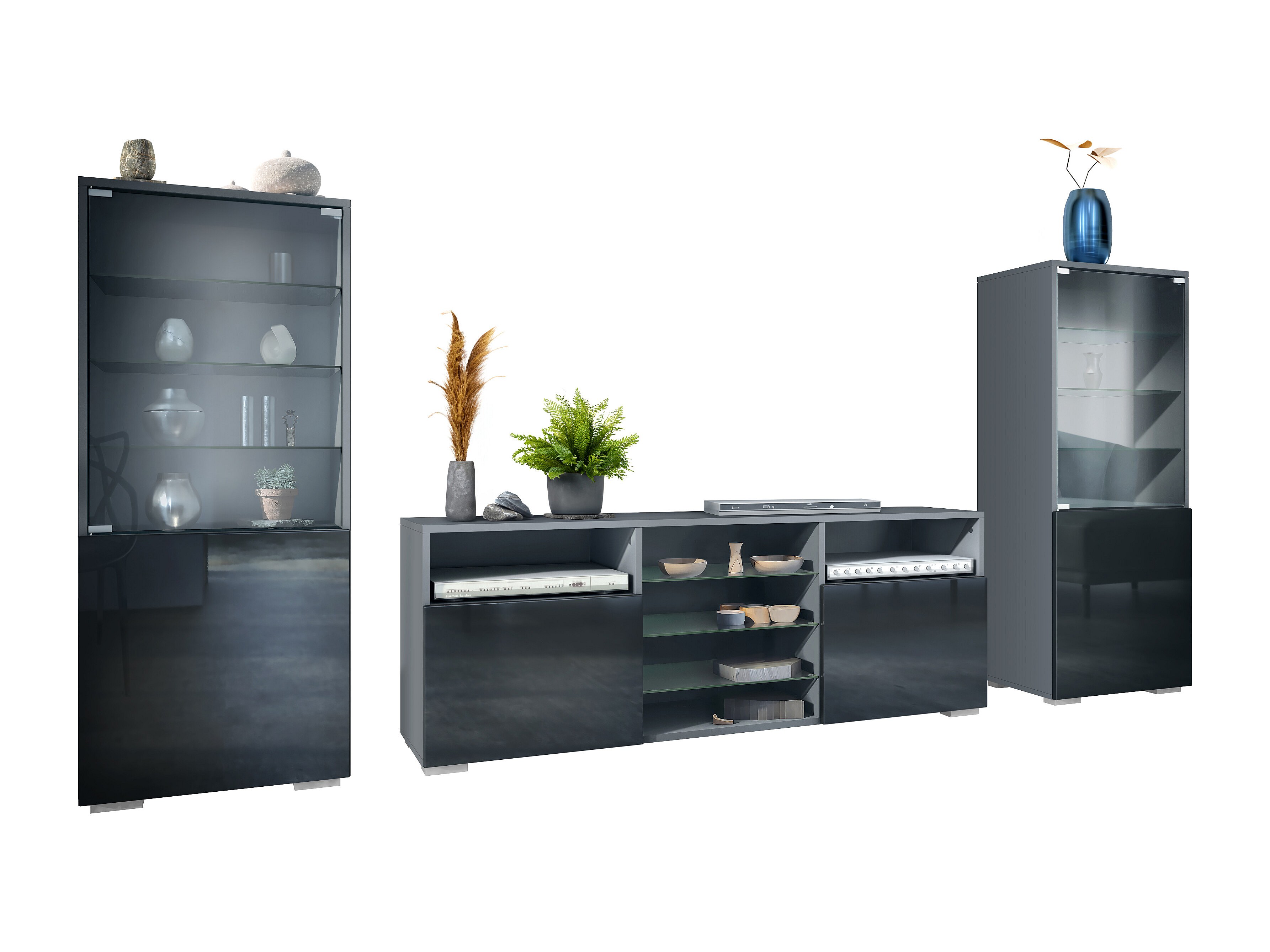 Ensemble mural Granada pour salon, comprenant 2 vitrines et 1 meuble TV, anthracite mat/noir haute brillance (286 x 122,5 x 35 cm)