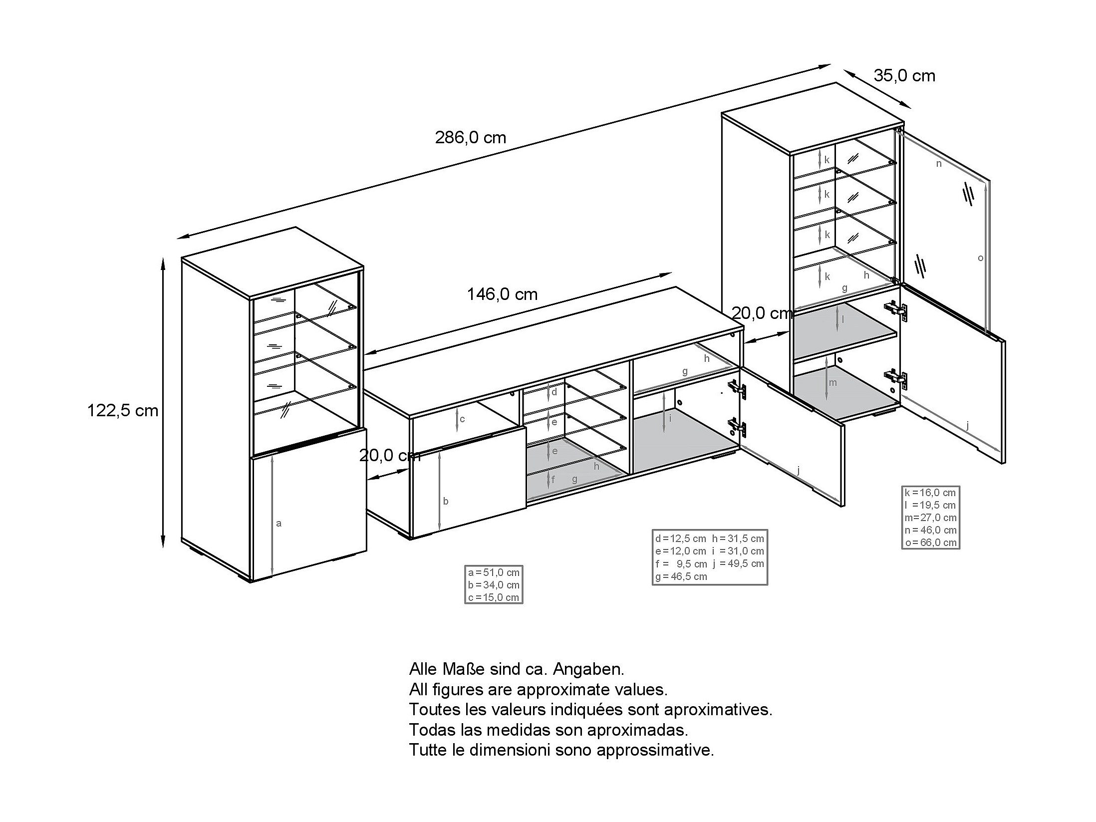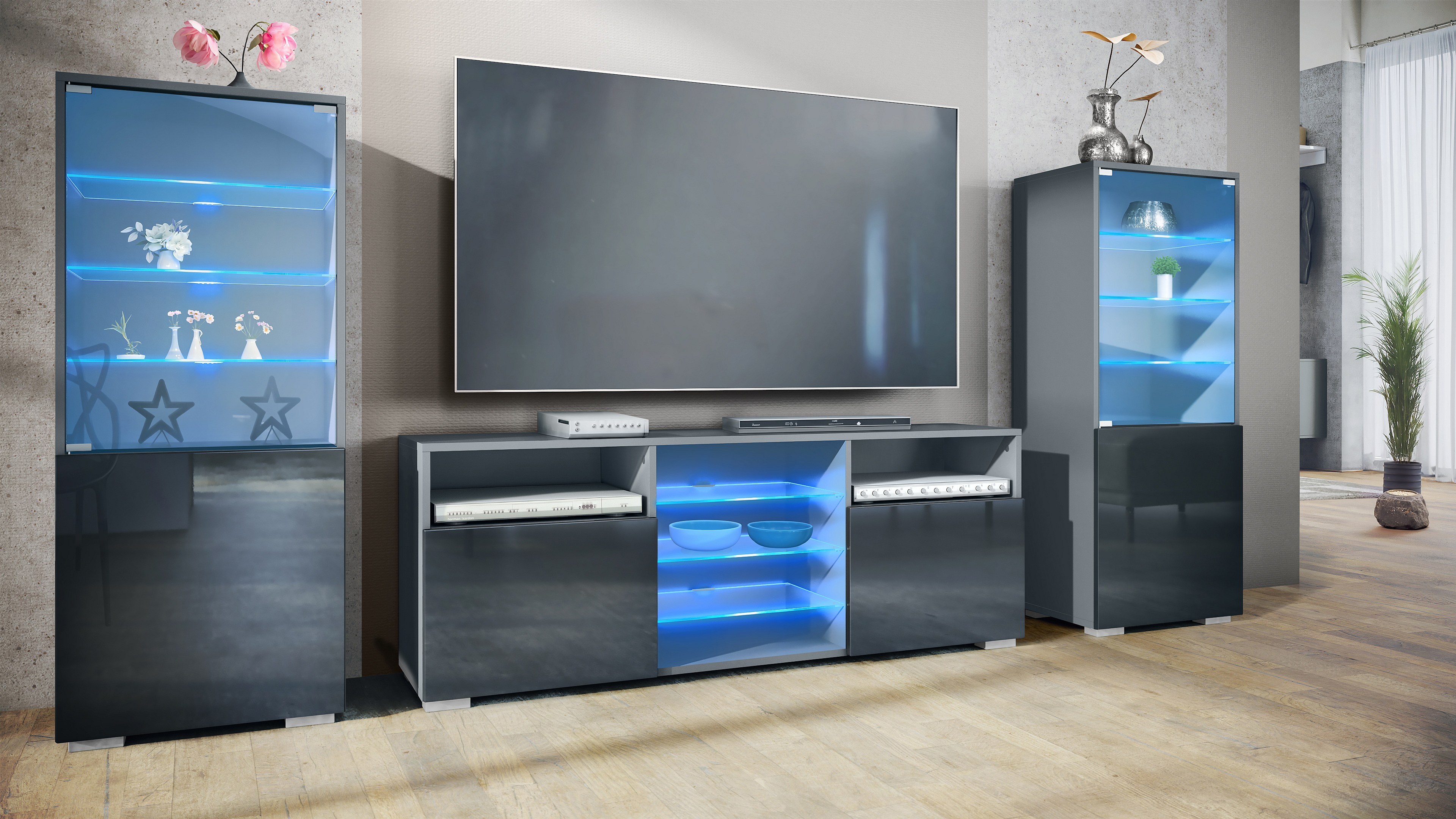Ensemble mural Granada pour salon, comprenant 2 vitrines et 1 meuble TV, anthracite mat/noir haute brillance éclairage LED inclus (286 x 122,5 x 35 cm)