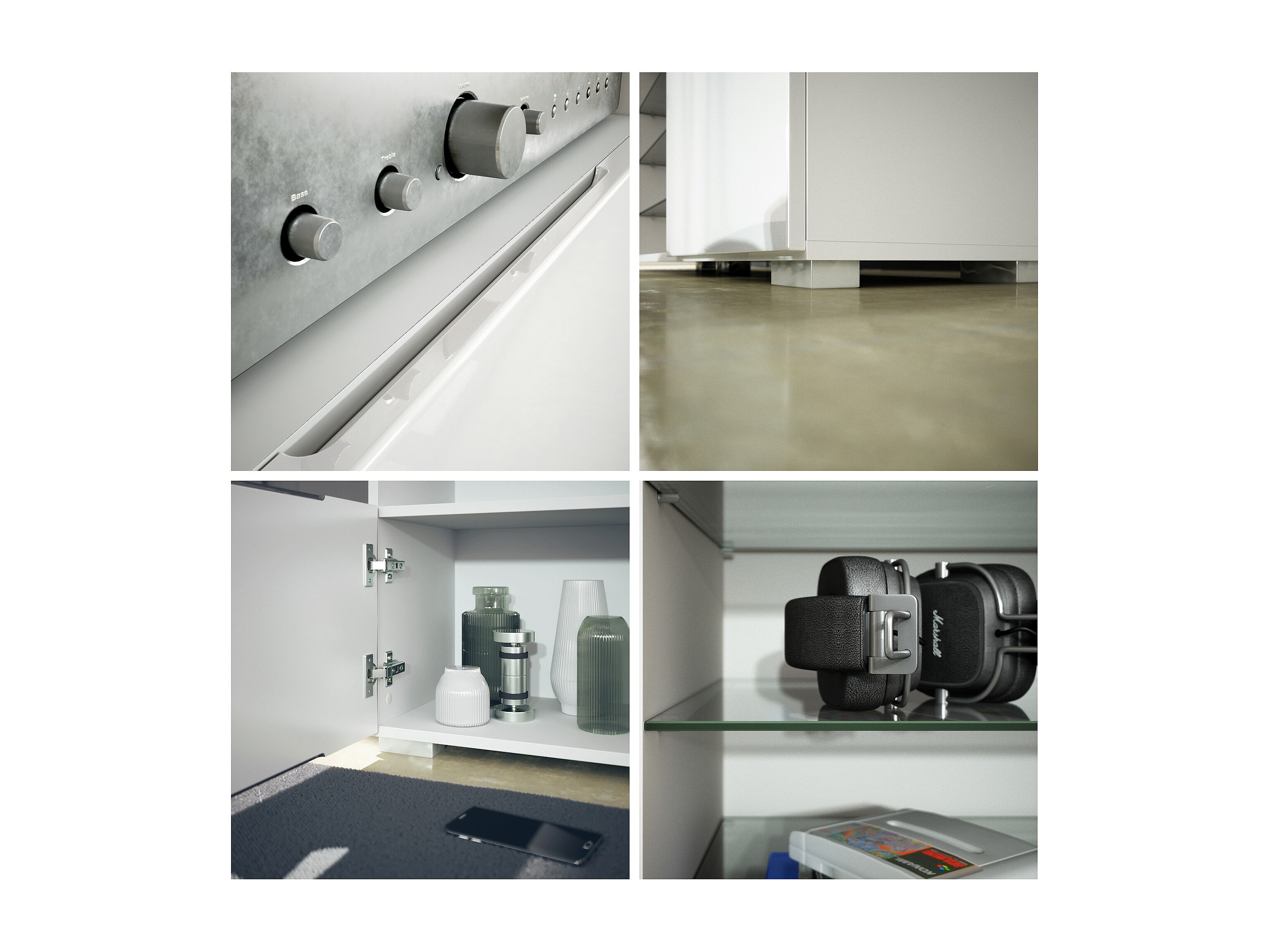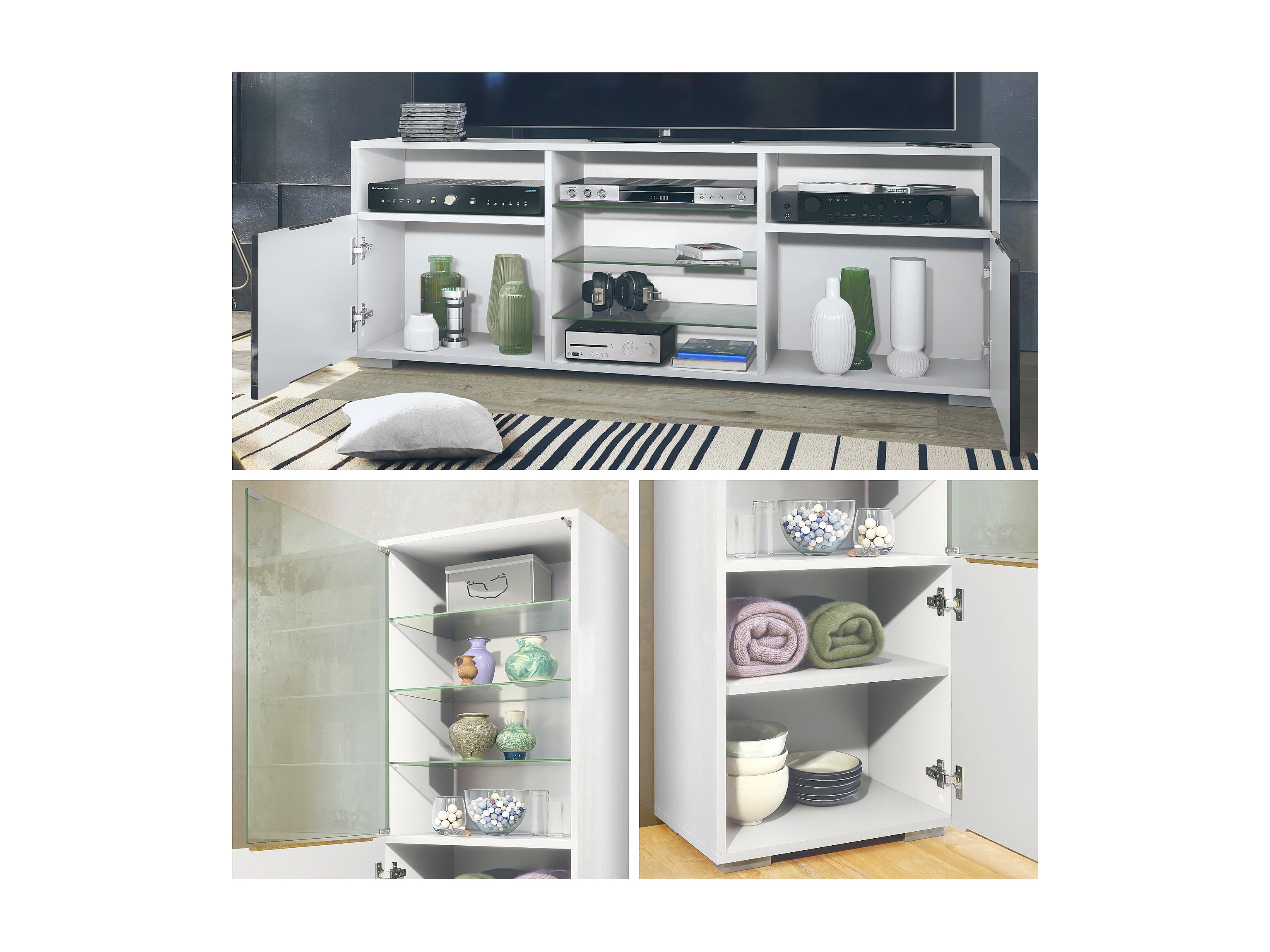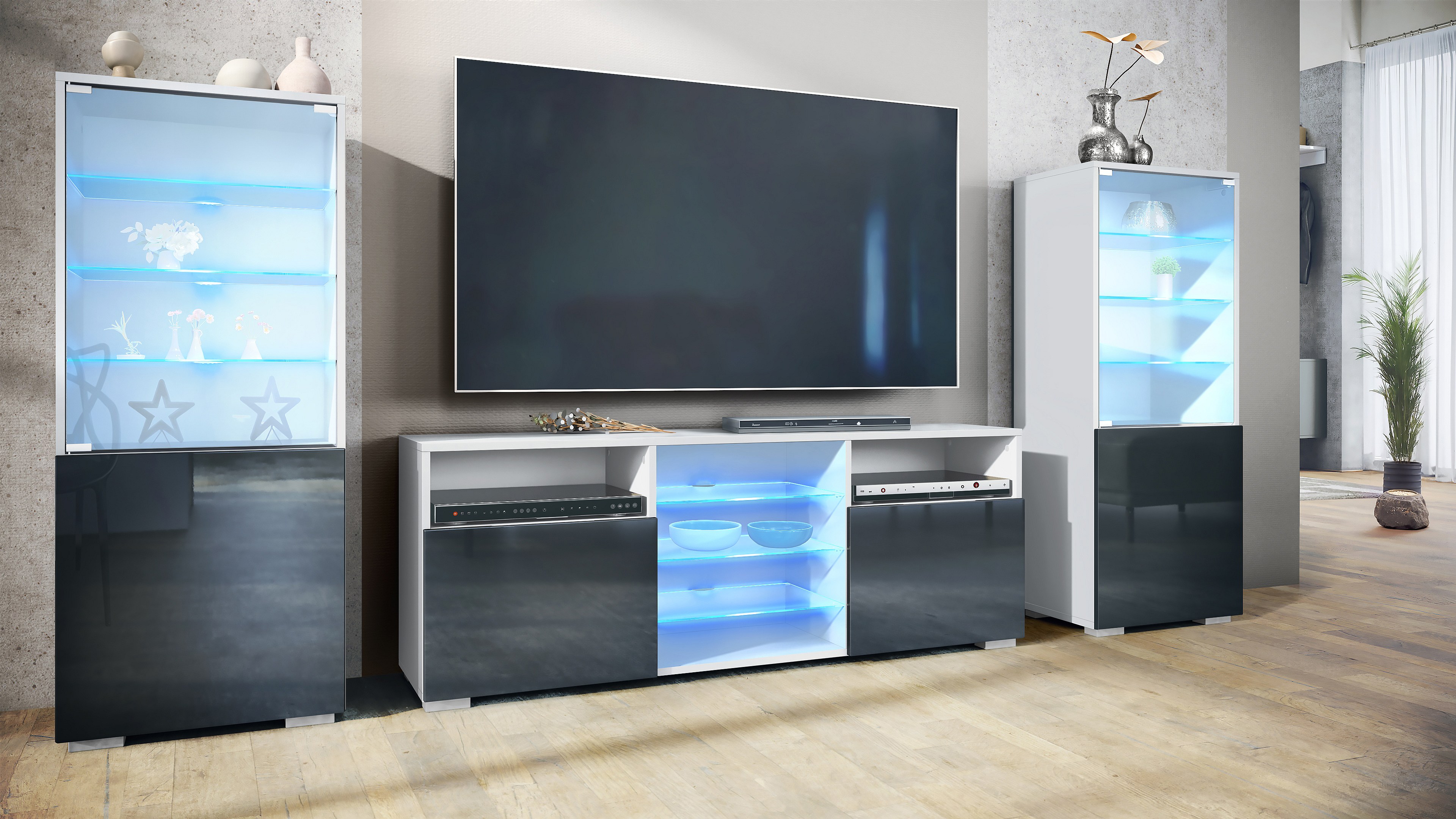 Ensemble mural Granada pour salon, comprenant 2 vitrines et 1 meuble TV, blanc mat/noir haute brillance éclairage LED inclus (286 x 122,5 x 35 cm)