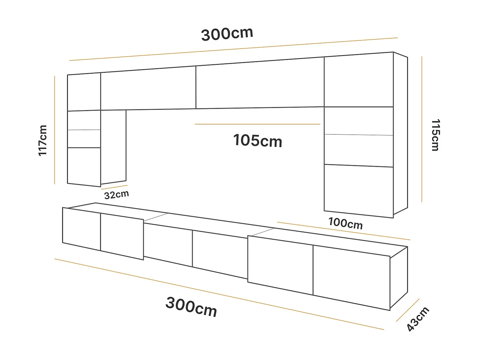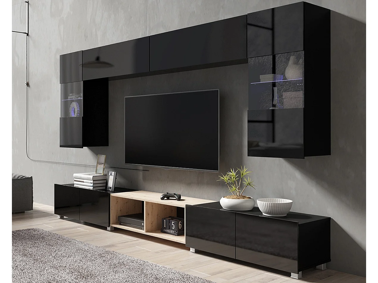 Ensemble Mural Montreal XIII - Noir Brillant & Chêne Artisan - LED Bleu
