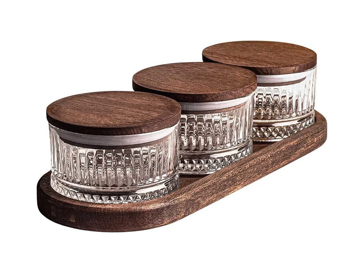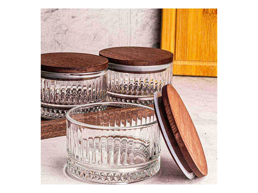 Ensemble pots en verre avec couvercle et plateau bois 3 pots ronds - Bella rond
