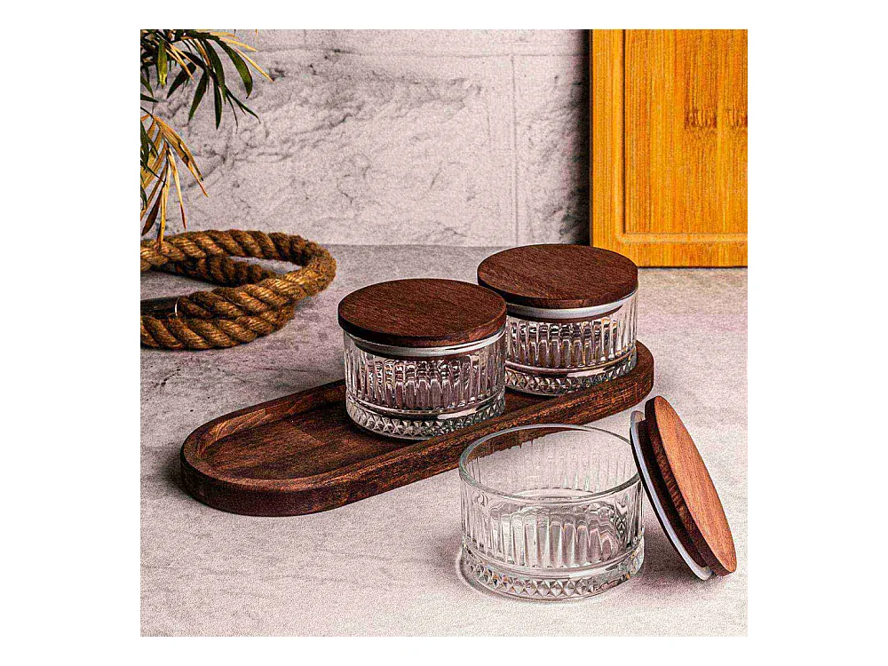 Ensemble pots en verre avec couvercle et plateau bois 3 pots ronds - Milla