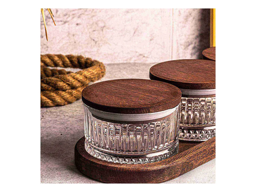 Ensemble pots en verre avec couvercle et plateau bois 4 pots ronds - Doria