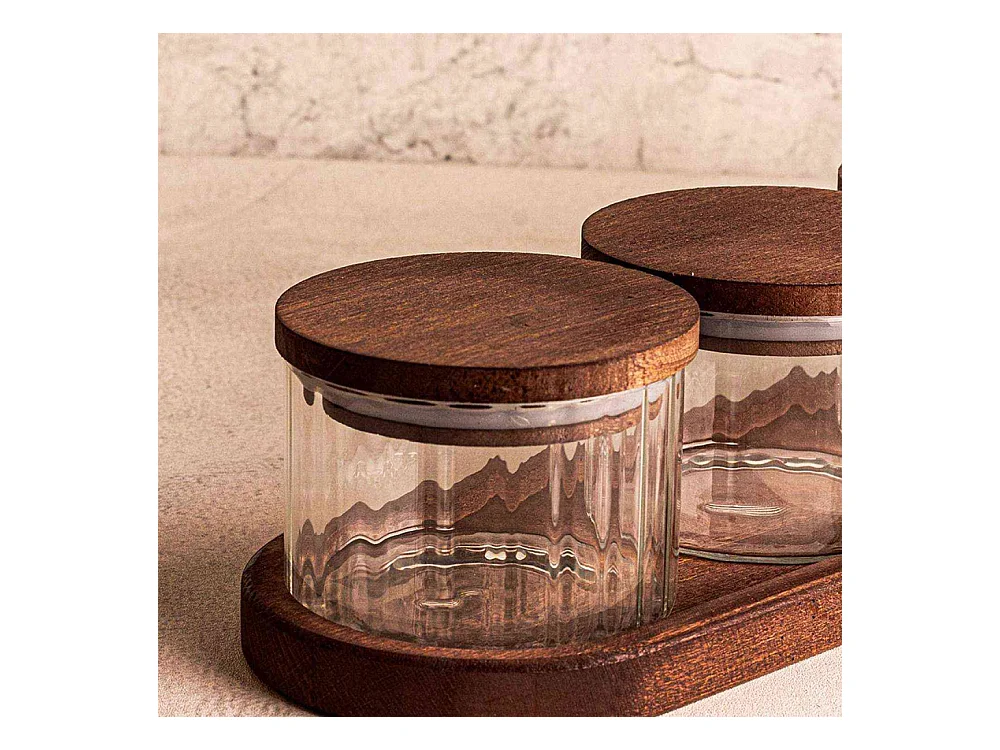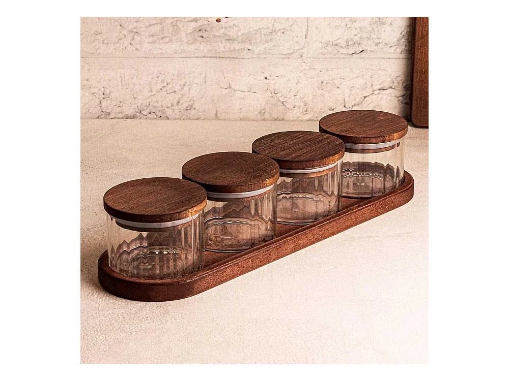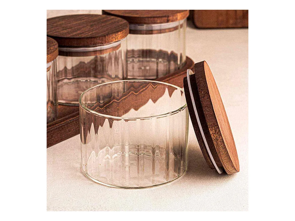 Ensemble pots en verre avec couvercle et plateau bois 4 pots ronds - Doria