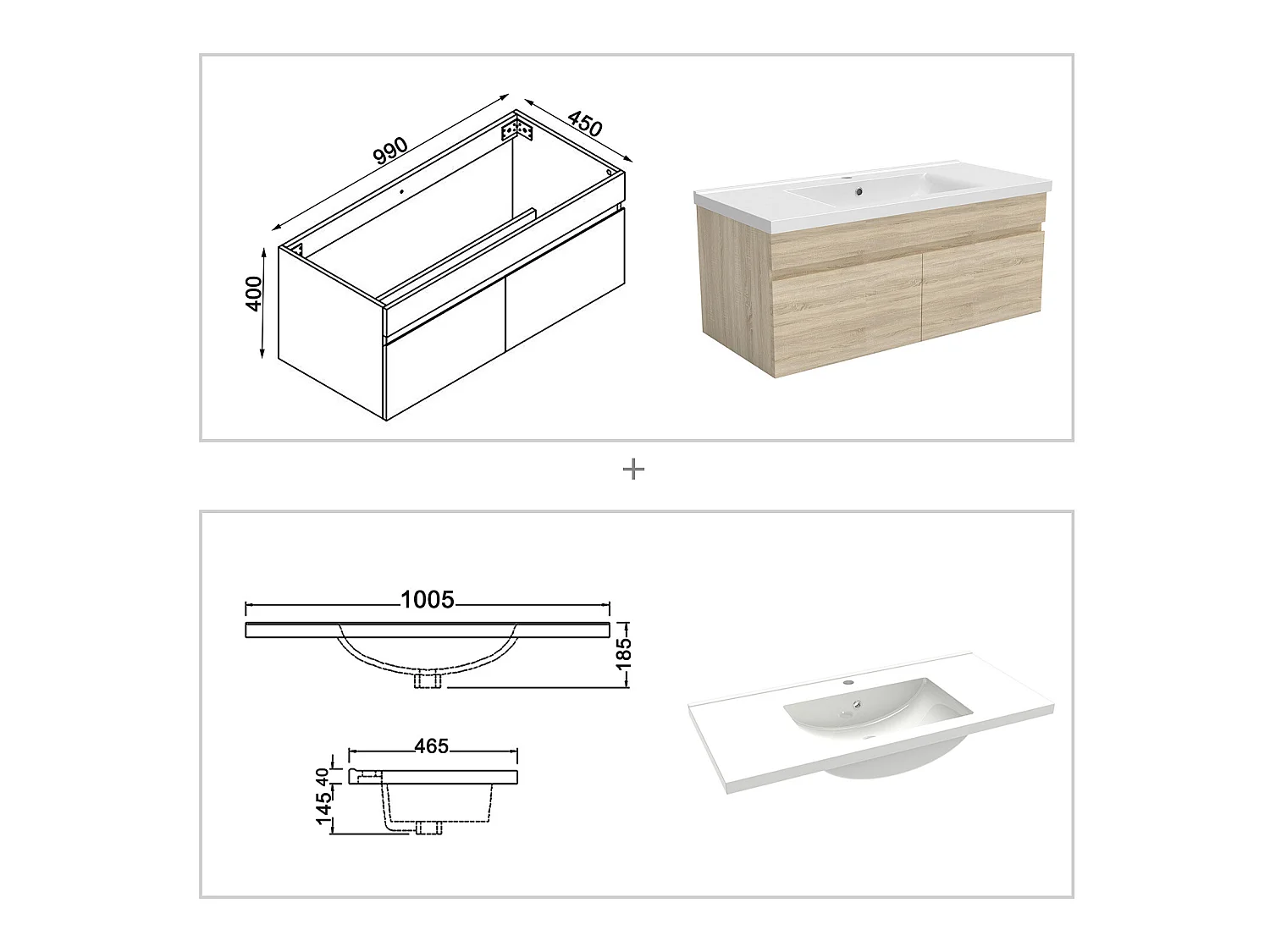Ensemble Salle De Bain 100cm meuble Chêne Wotan avec miroir lumineux, Aica