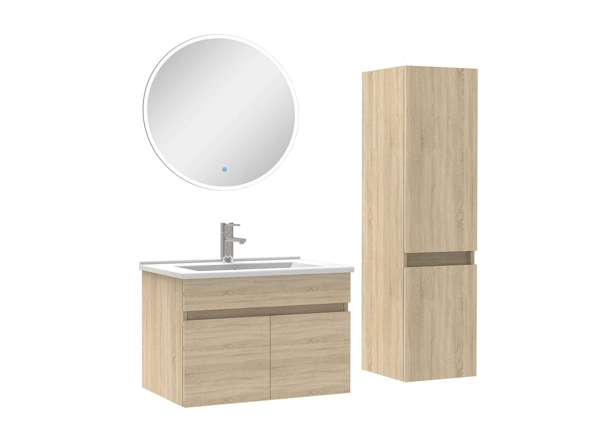 Ensemble Salle De Bain simple vasque avec colonne et miroir rond 60cm meuble Chêne Wotan