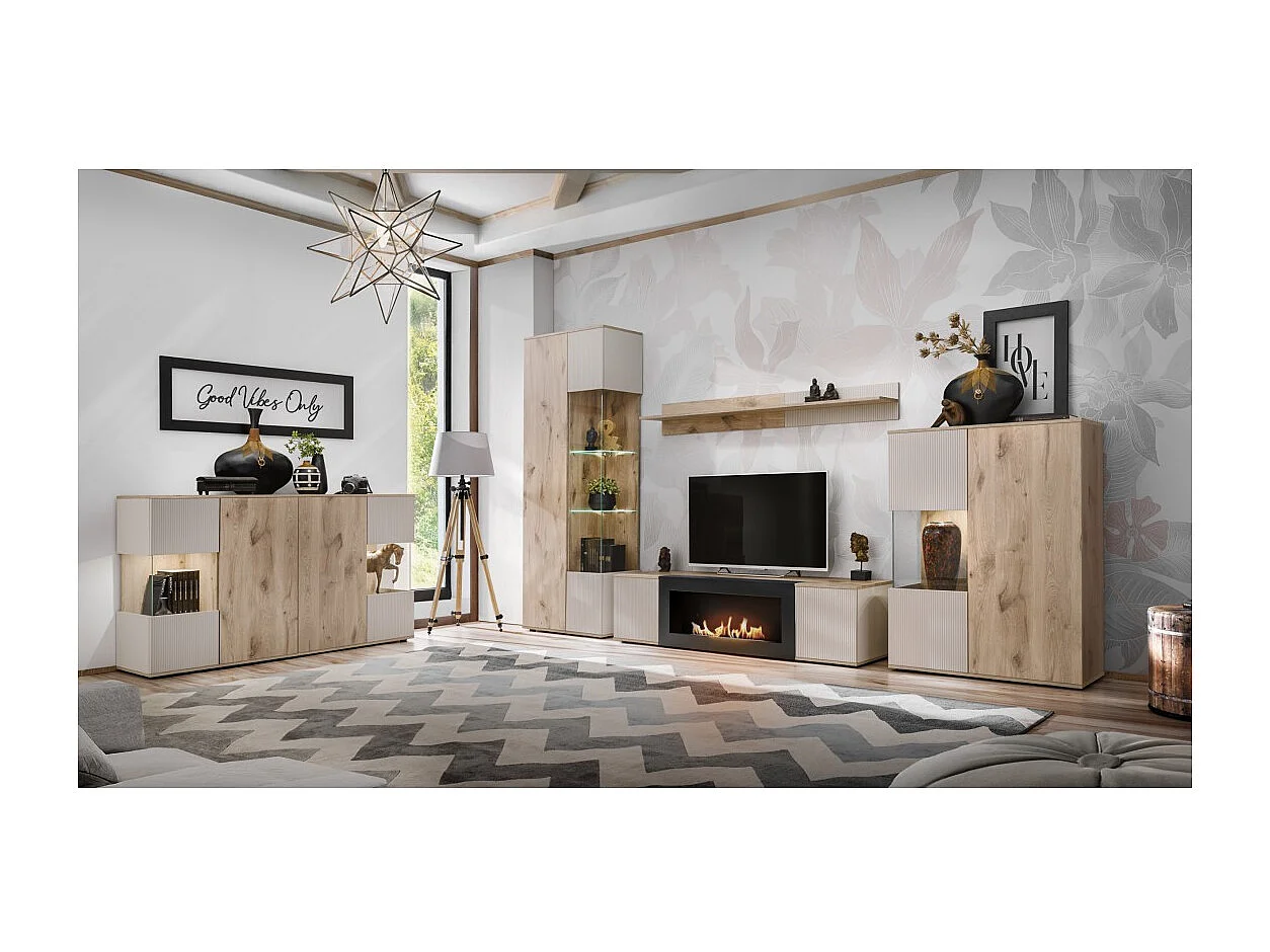 Ensemble salon complet ERINA – Buffet bas, Buffet haut, Vitrine, Étagère, Meuble TV cheminée bio-éthanol – Chêne clair et beige