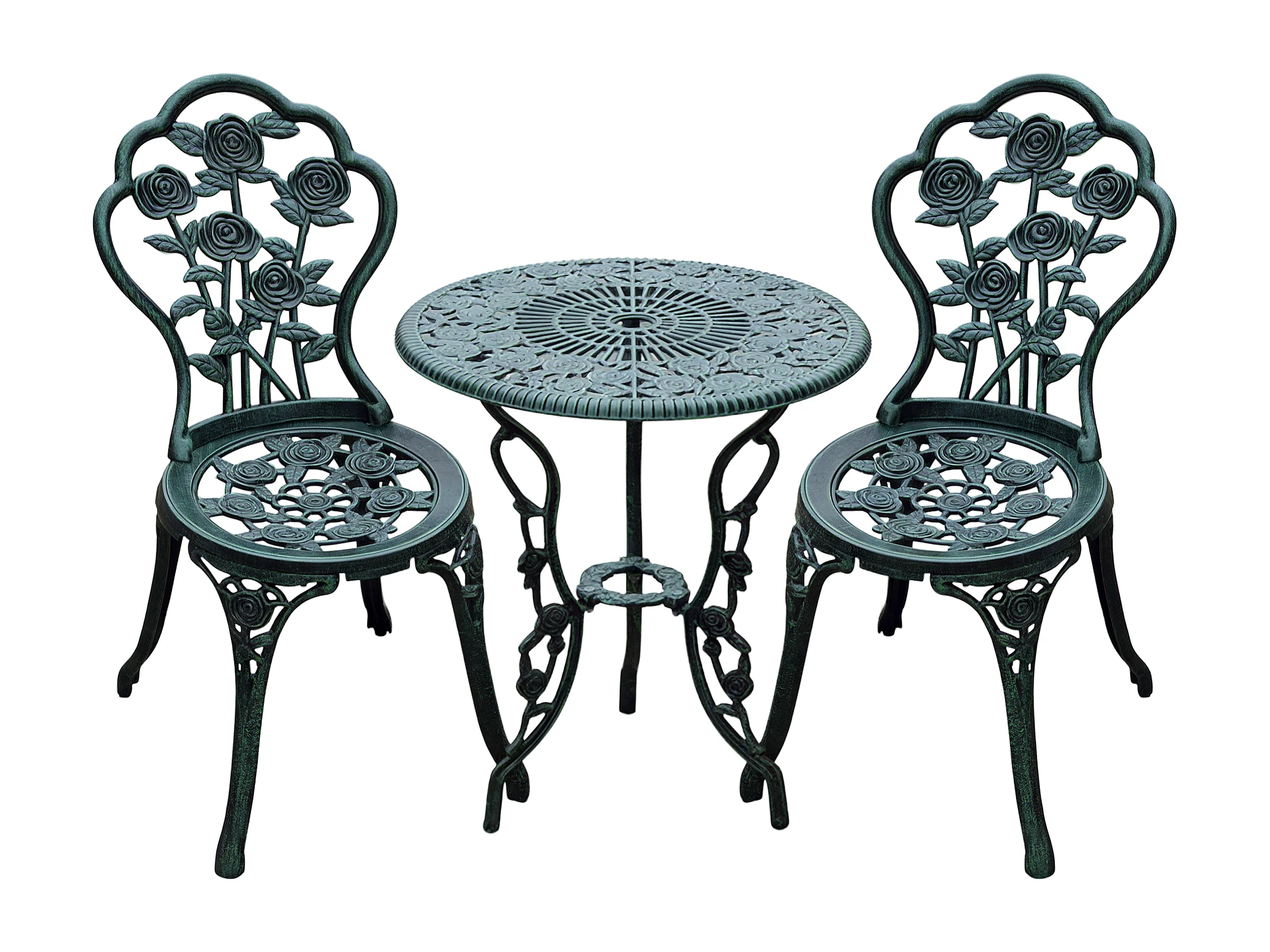 Ensemble salon de jardin 2 places 2 chaises + table ronde style néo-rétro motif rose lignes fuselées fonte d'aluminium vert vieilli