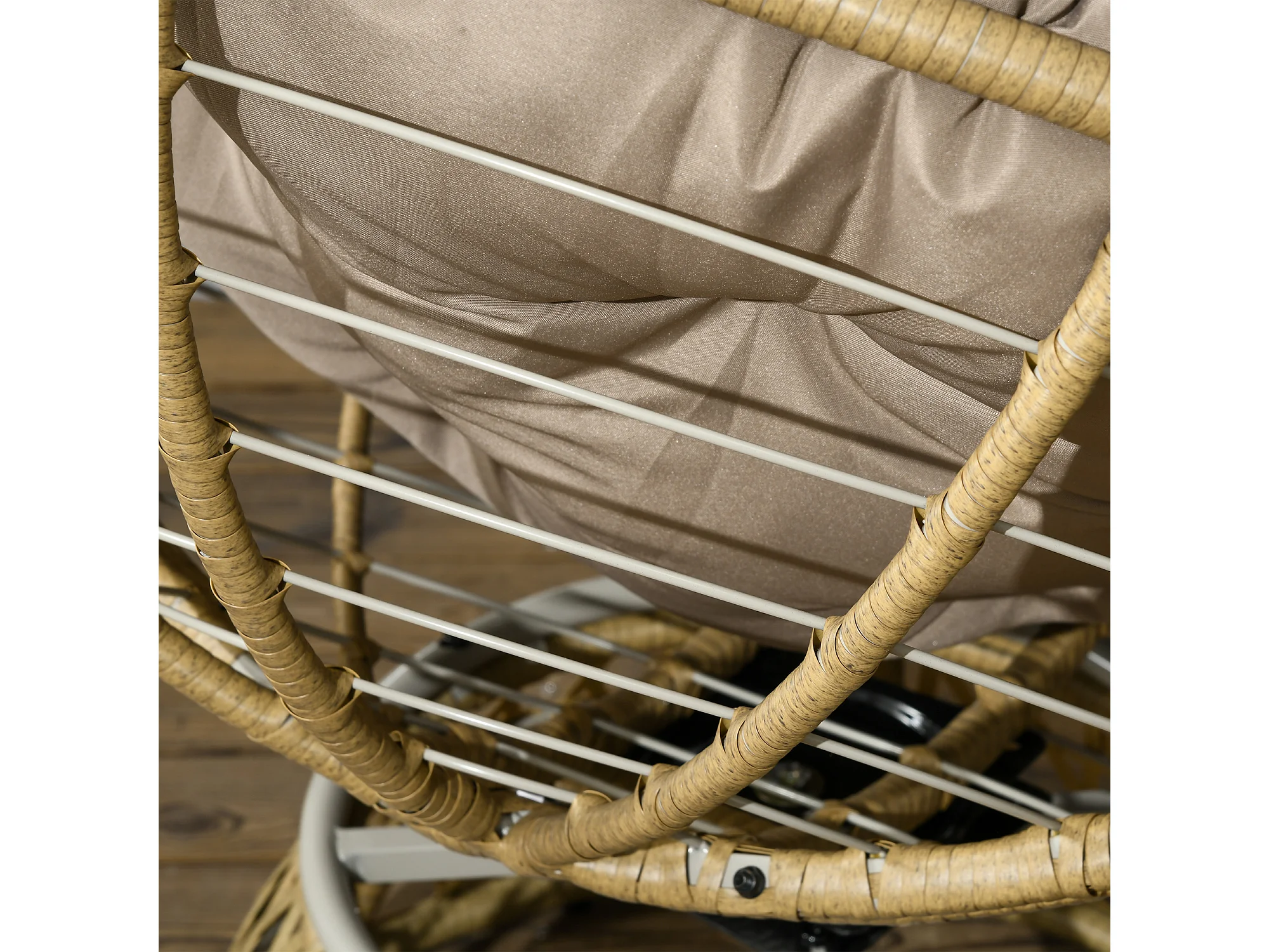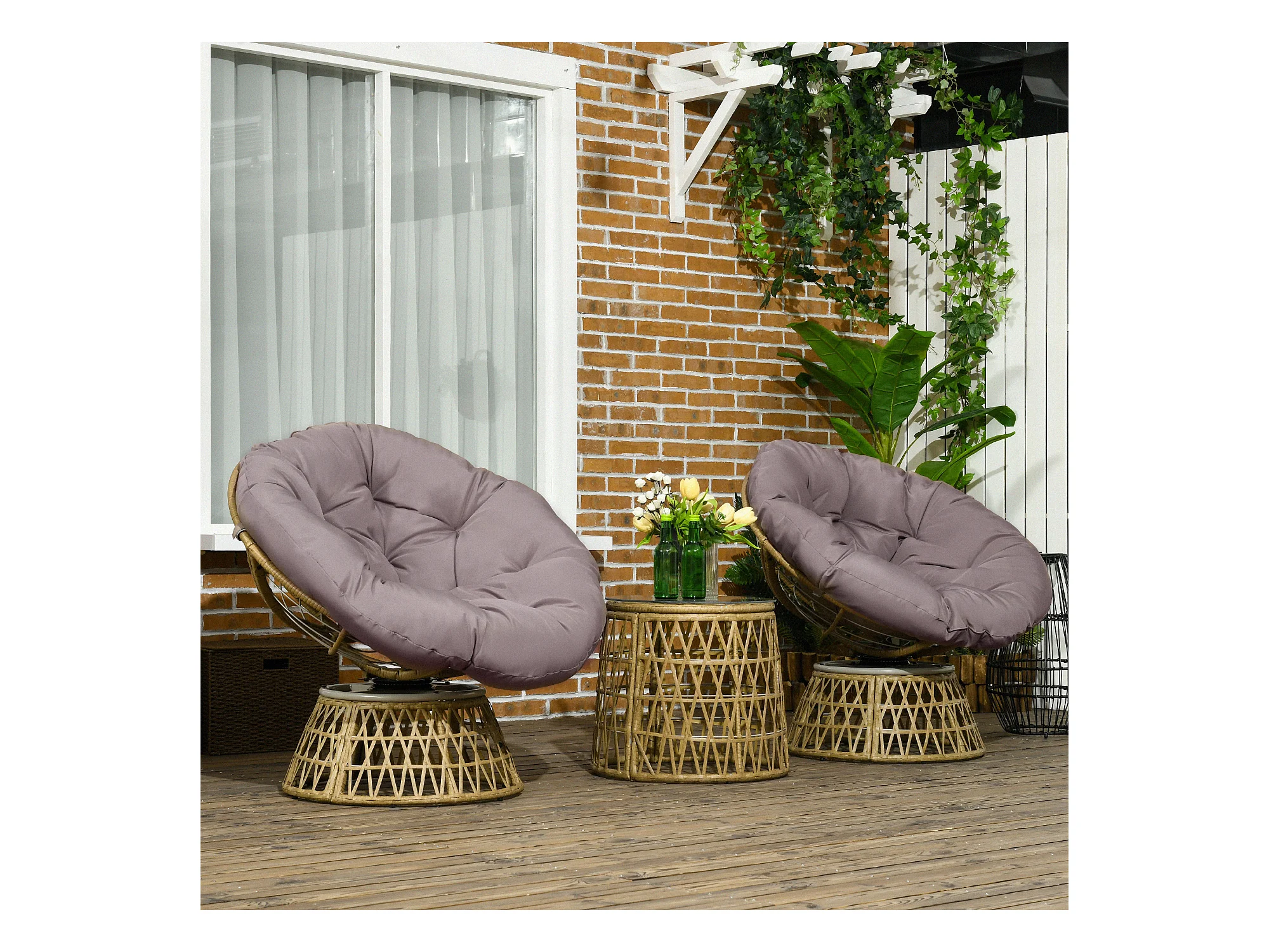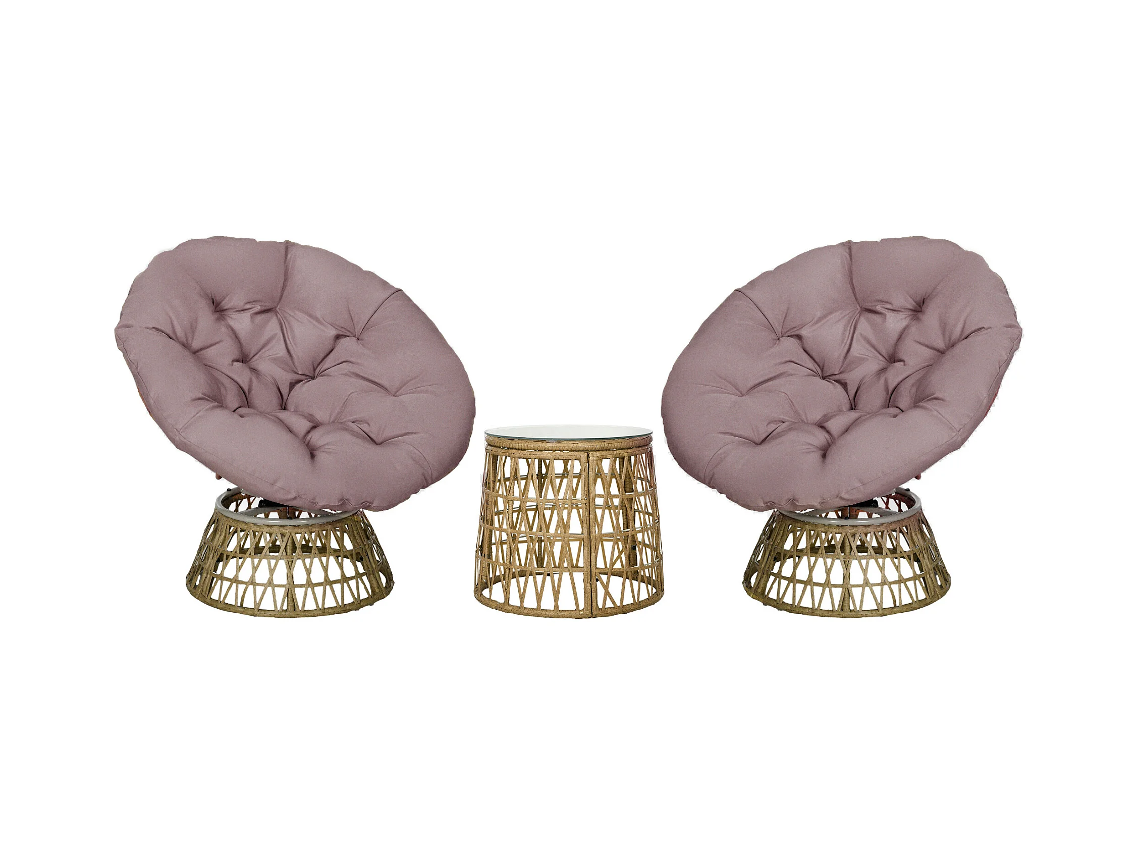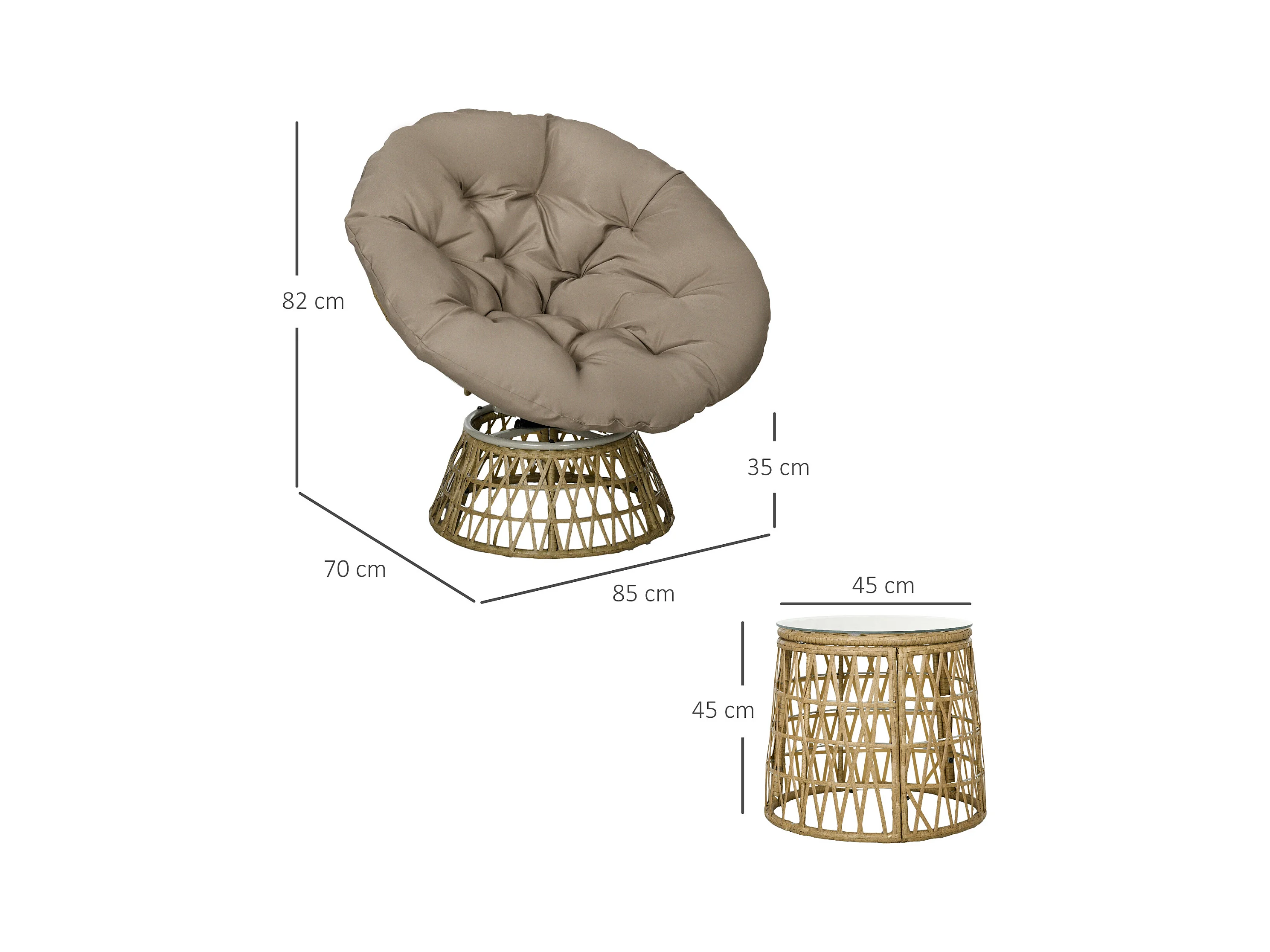 Ensemble salon de jardin 3 pièces - 2 fauteuils papasan, table basse - coussins taupe - résine tressée aspect rotin