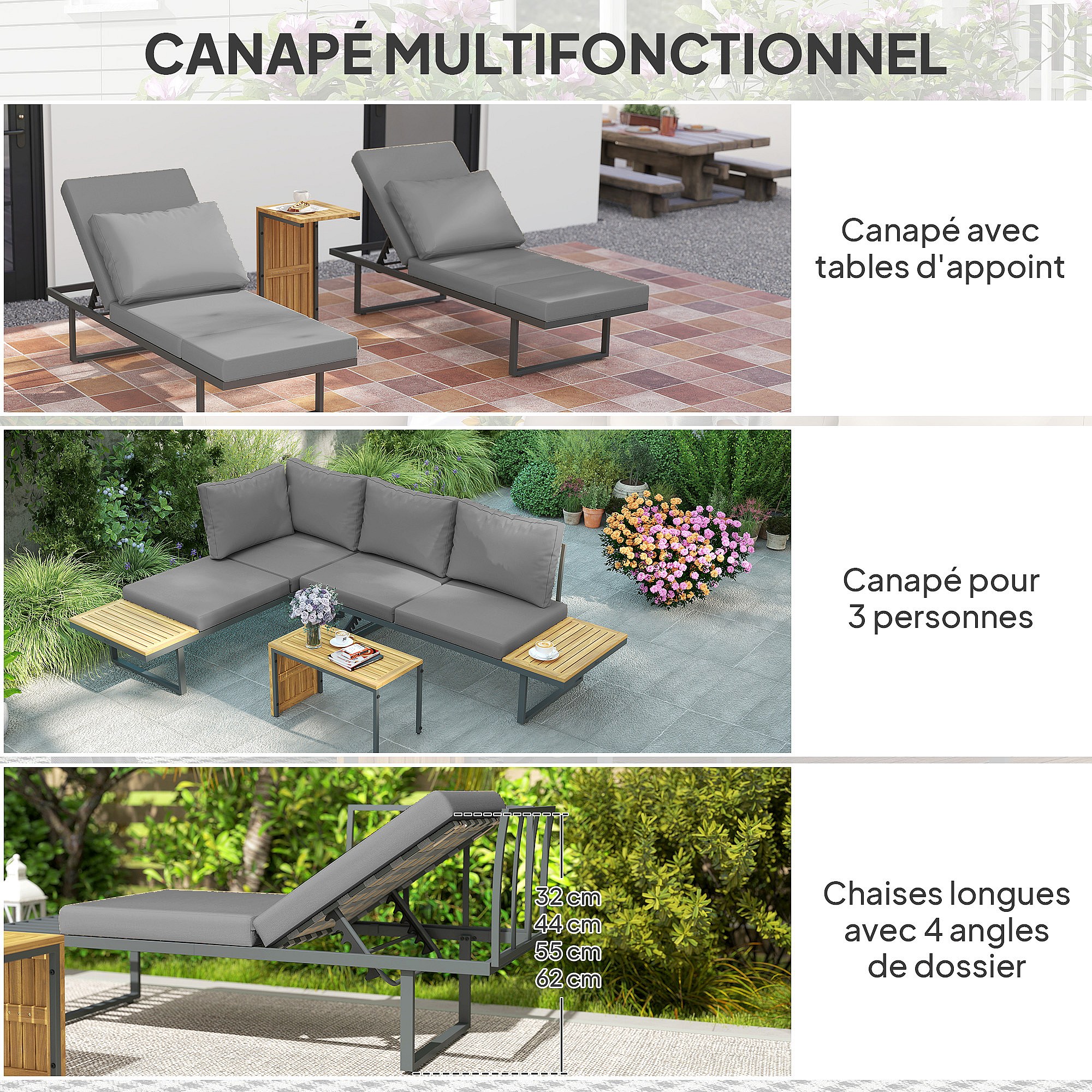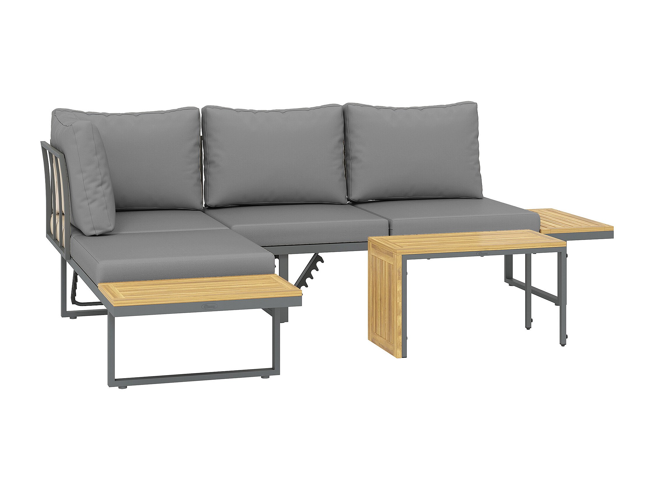 Ensemble salon de jardin 4 places modulable réglable avec table basse acier gris bois d'acacia verni