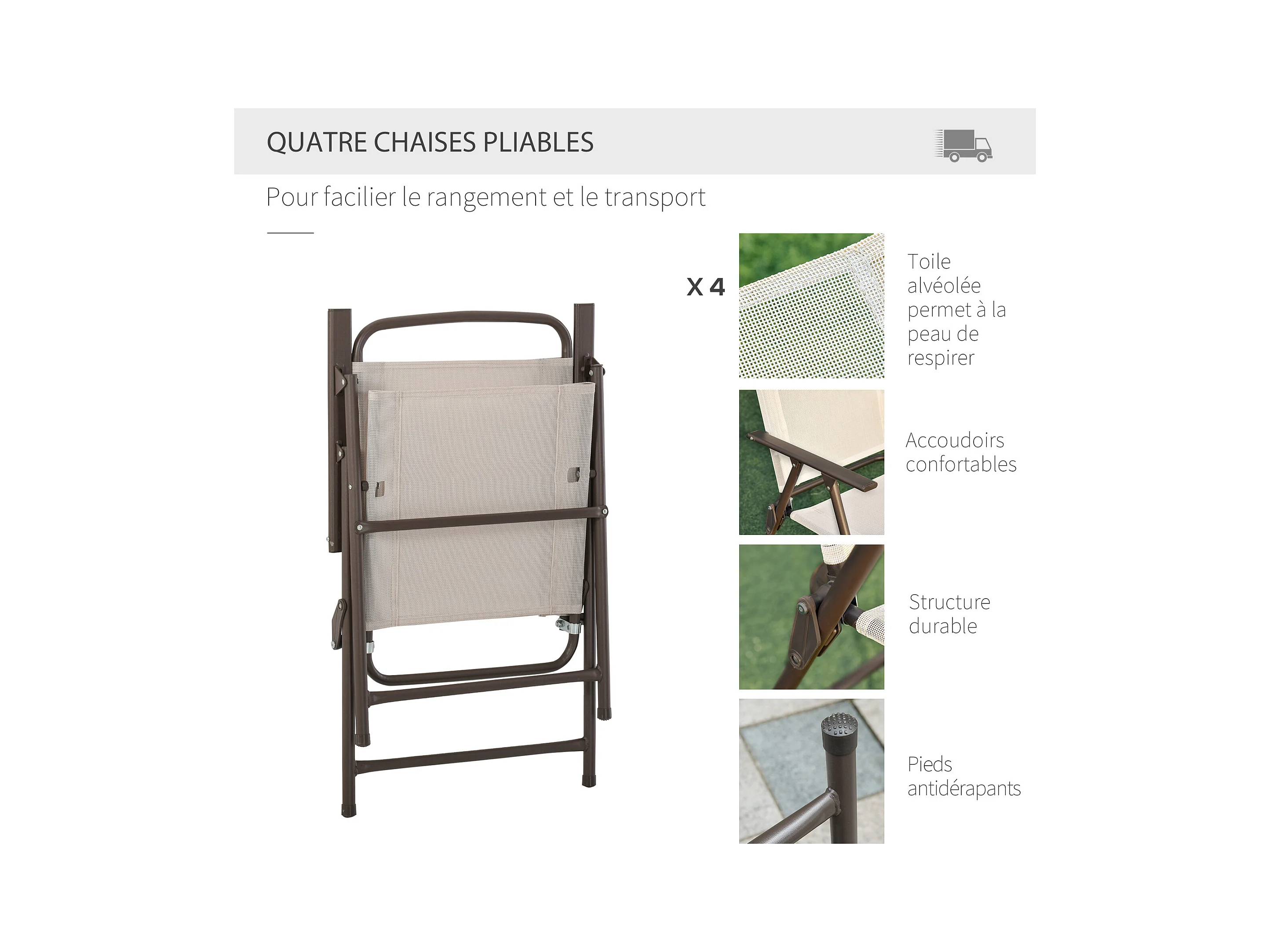 Ensemble salon de jardin 6 pcs - table ronde + 4 chaises pliables + parasol - acier époxy café textilène polyester beige