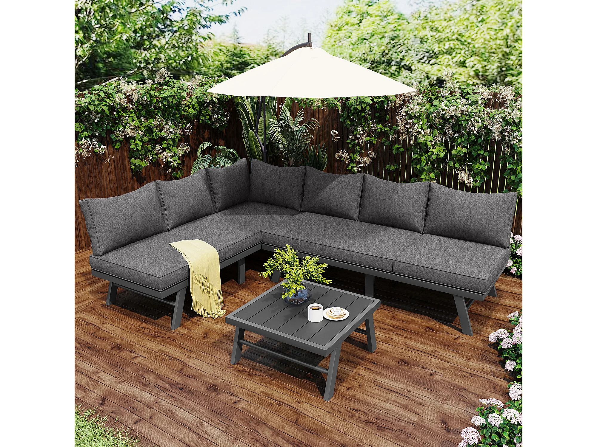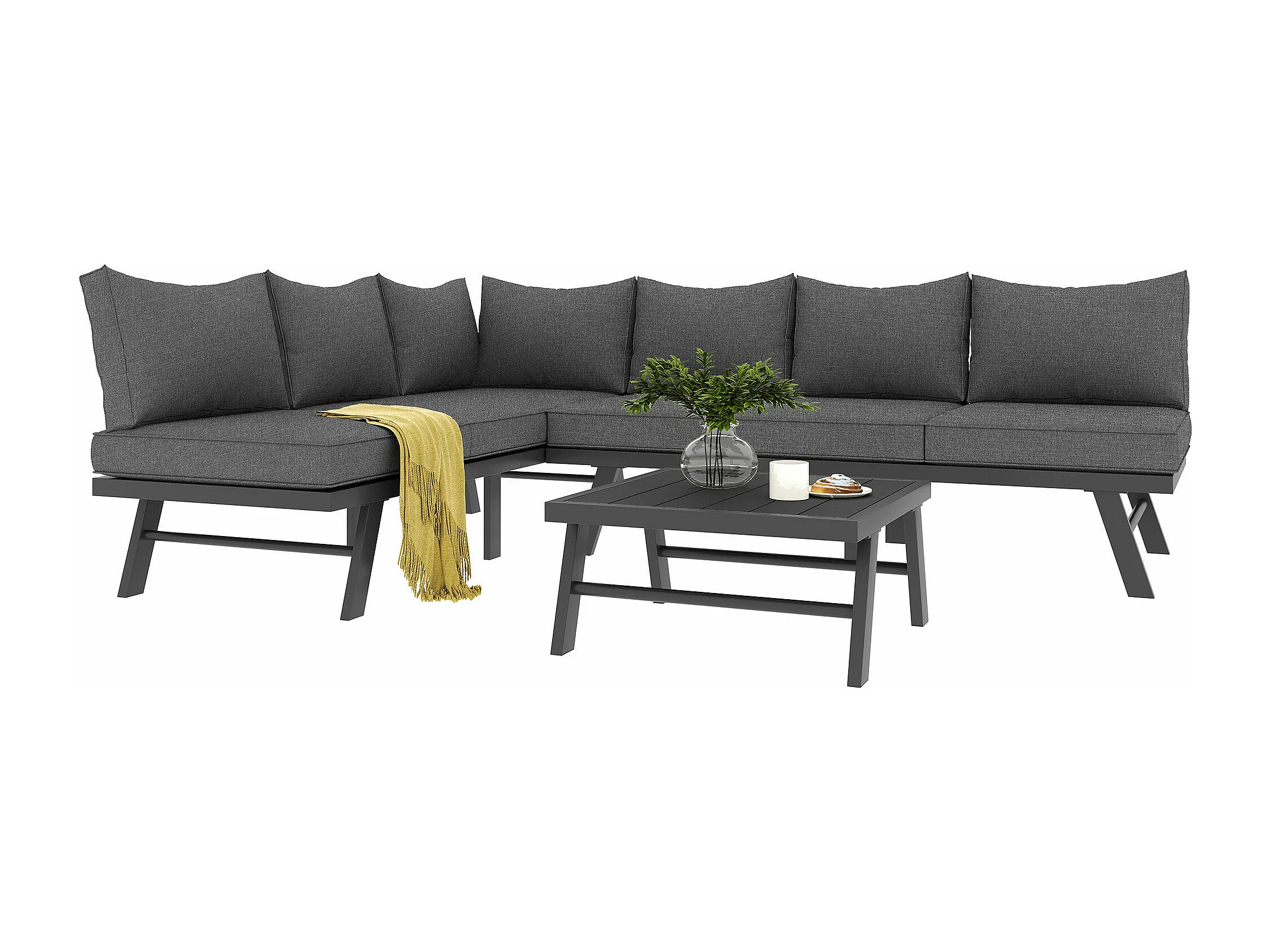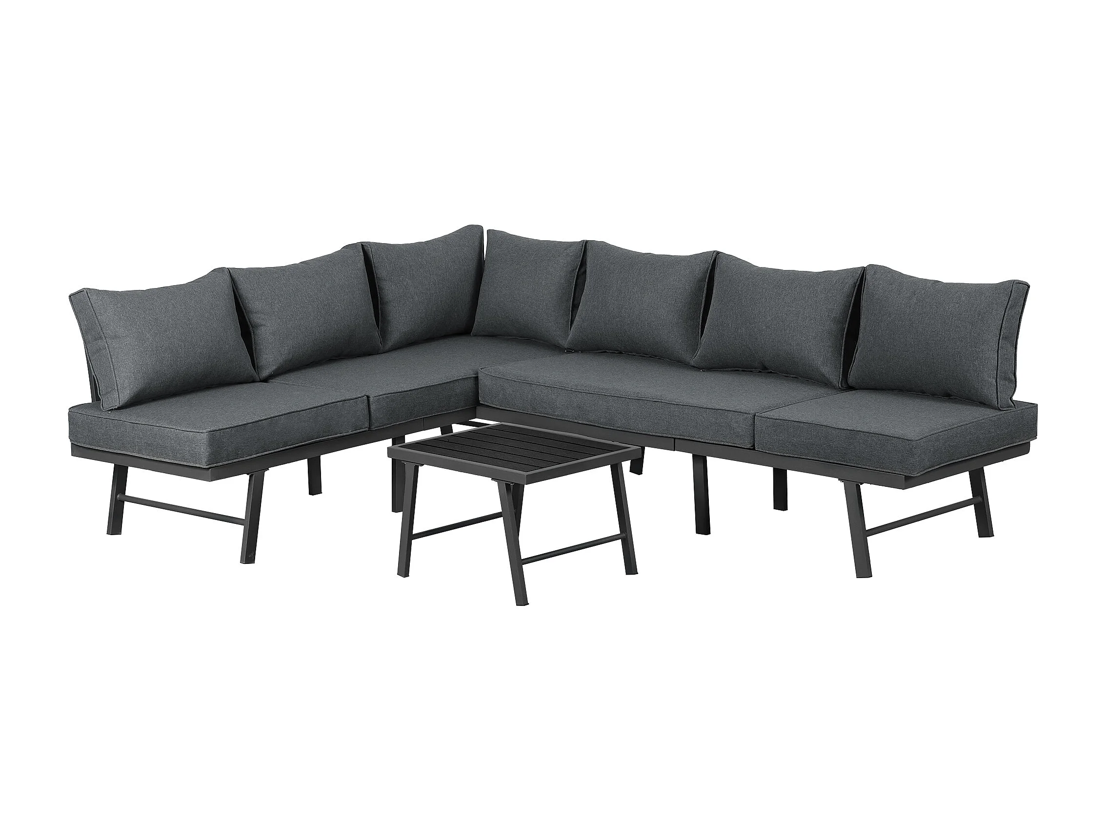 Ensemble salon de jardin en aluminium pour 5 - 6 personnes, canapé 2 coins, 1 table contenant 7 oreillers gris, 4 oreillers gris