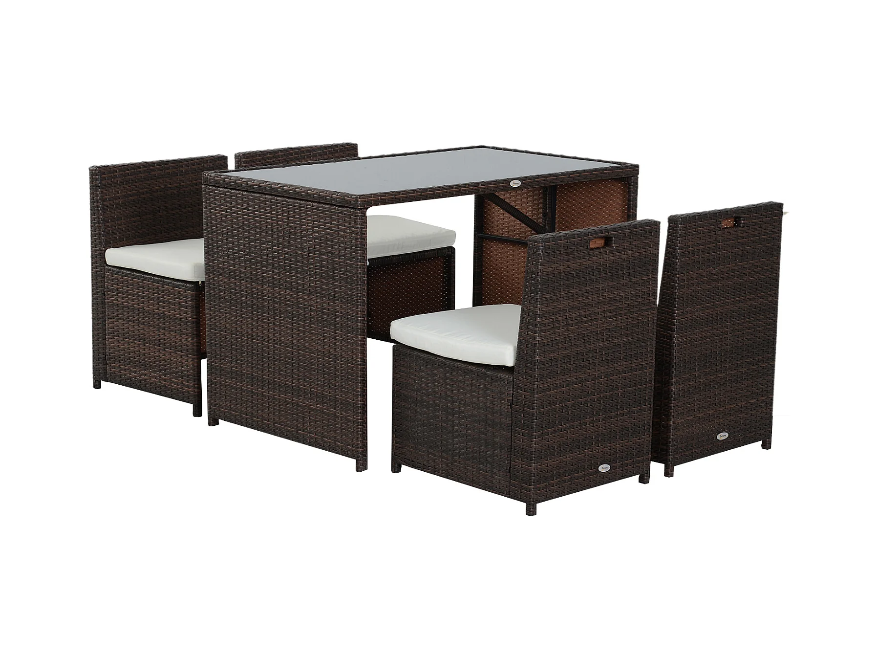 Ensemble salon de jardin encastrable 4 chaises monoblocs avec coussins déhoussables et table résine tressée chocolat